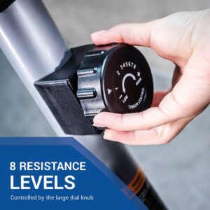 – With 8 levels of resistance, you can customize your workout intensity on-demand with a simple turn of the integrated resistance knob