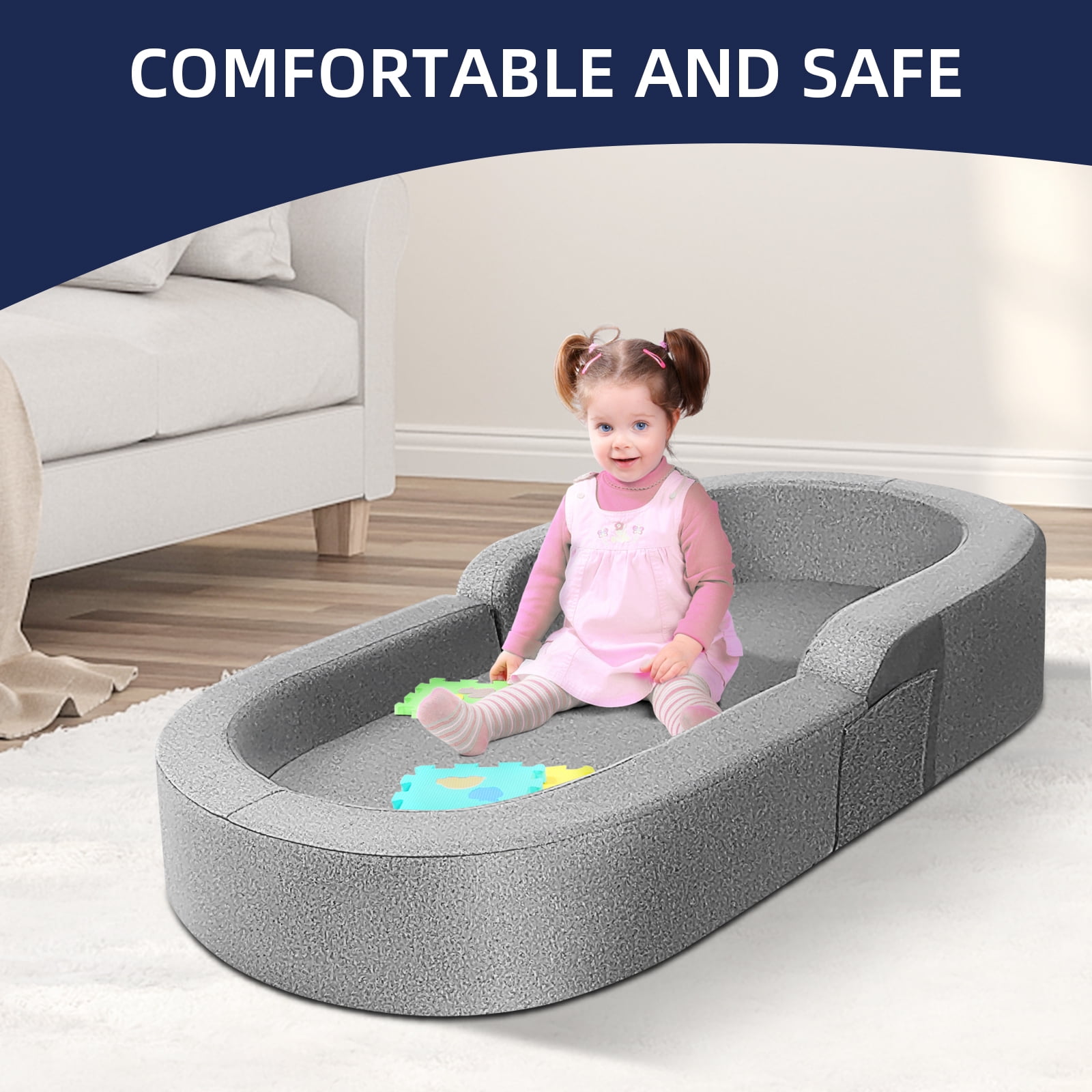Folds for Travel – This portable travel toddler bumper mat folds simply for easy traveling, plus you can conveniently store some items inside. Perfect for use at daycare, Grandma’s house, hotels, and anywhere you need a comfortable place for your child to rest. Safety and Comfort: Our baby travel bed is designed with safety and comfort in mind, the supportive foam construction keeps the bed in its shape,offering a secure and cozy environment for your child’s rest and relaxation. Easy to Clean: The removable bed cover is machine washable, simplifying maintenance and ensuring cleanliness and hygiene for your child. Lightweight and Space-Saving: The convertible sofa mode makes the most of limited space, providing a comfortable seating option for your kids during the day and a cozy bed at night. This two-in-one functionality is perfect for all kinds of living spaces.