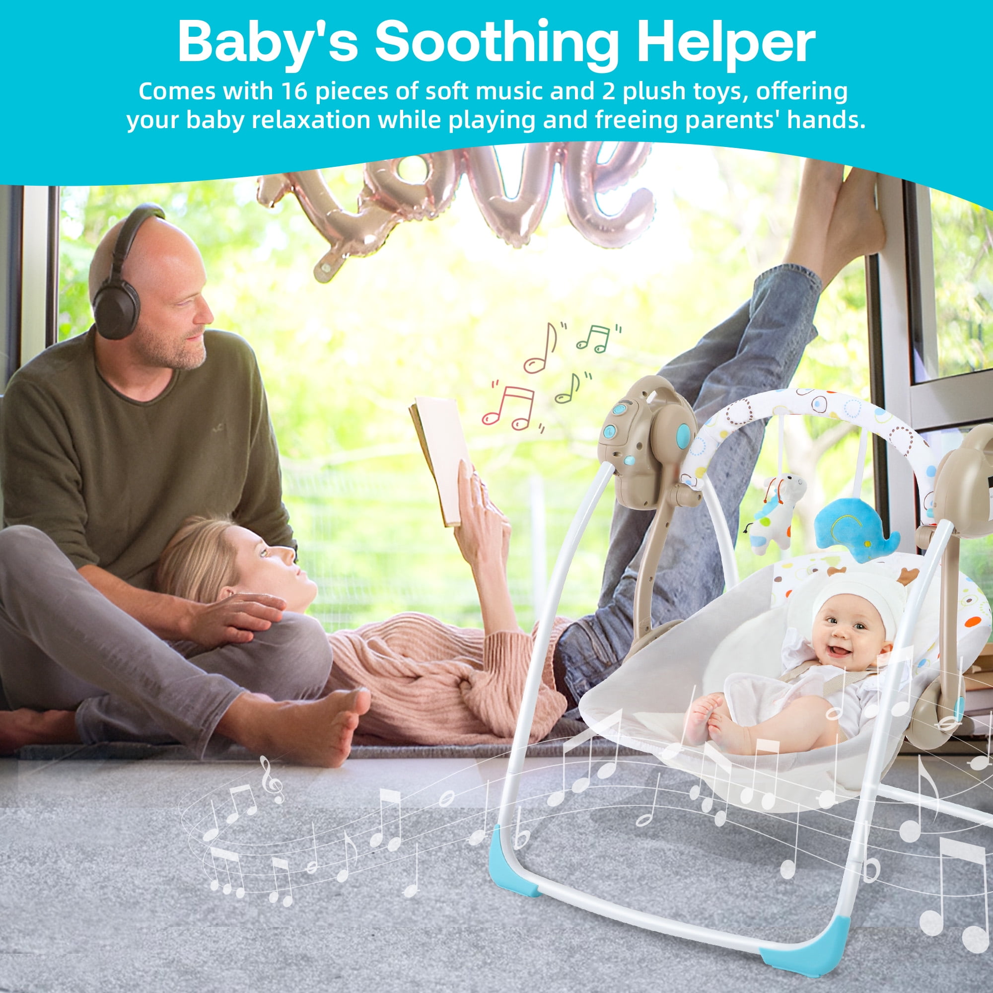 Features: Advanced Safety Design: Yadala baby swings for infants to toddler is equipped with an adjustable five-point safety belt to prevent the baby from sliding off the baby rocking chair. The triangular bracket and A3 thickened high-density metal pipe make it more stable. This newborn swing for babies 0-9 Months and 6-44 lbs, has passed the American ASTM safety standard test . Let all mothers and babies use it with confidence Portable Baby Swing Outdoor and Indoor: The lightweight design and quick fold make this baby rocker an ideal choice for travel. Whether going to the grandparents’ house or on a weekend picnic, the swing for baby can ensure babies always have a familiar and comfortable resting space and make parents enjoyable and effortless. The portable baby swing is powered by a USB cable, 4 pieces of batteries(Not included) or a power bank Easy to Install and Clean: You can complete the assembly within 5 minutes according to the instructions or the video. The super soft and skin-friendly flannel fabric seat pad is easily detachable, making cleaning simple and fast. Little accidents during use are no longer a problem and can be cleaned up in minutes, restoring the swing to its clean, like-new condition. 6 Speeds & 4 Timing Settings: The intelligent control system can simulate a mother’s rocking with 6 different swing amplitudes. To better protect your newborn baby’s safety, the swing level between each amplitude is designed to be a gradual difference. You could adjust the settings to find the swing range and frequency that your baby likes. You are convenient to set the time to 15, 30, 45, 60mins to save your time and energy. Baby’s Soothing Helper: The baby swing newborn comes with 16 pieces of soft and comforting music and 2 plush toys, offering your baby the right stimulation and relaxation while playing. At the same time, our babies can be fully exercised and grow up healthy and happy. The smart control system allows you to easily adjust the volume to meet the varying needs of different babies. This thoughtful design allows parents to have their own space and free their hands. Specifications: CPSC Certificate No: GZEM1904012451HSV Model No: D93886/D93883 Age garding: 0-9 months Color: Blue/KHAKI Size(Open): 30.3*28*25.2 Inches Size(Fold): 22.8*13.8*4.9 Inches Product Weight: 9.9 lbs Load Capacity: 44 lbsPackage includes: 1 x Electric Baby Swing 1 x Mosquito net 2 x Toy 1 x USB Cable 1 x Instruction