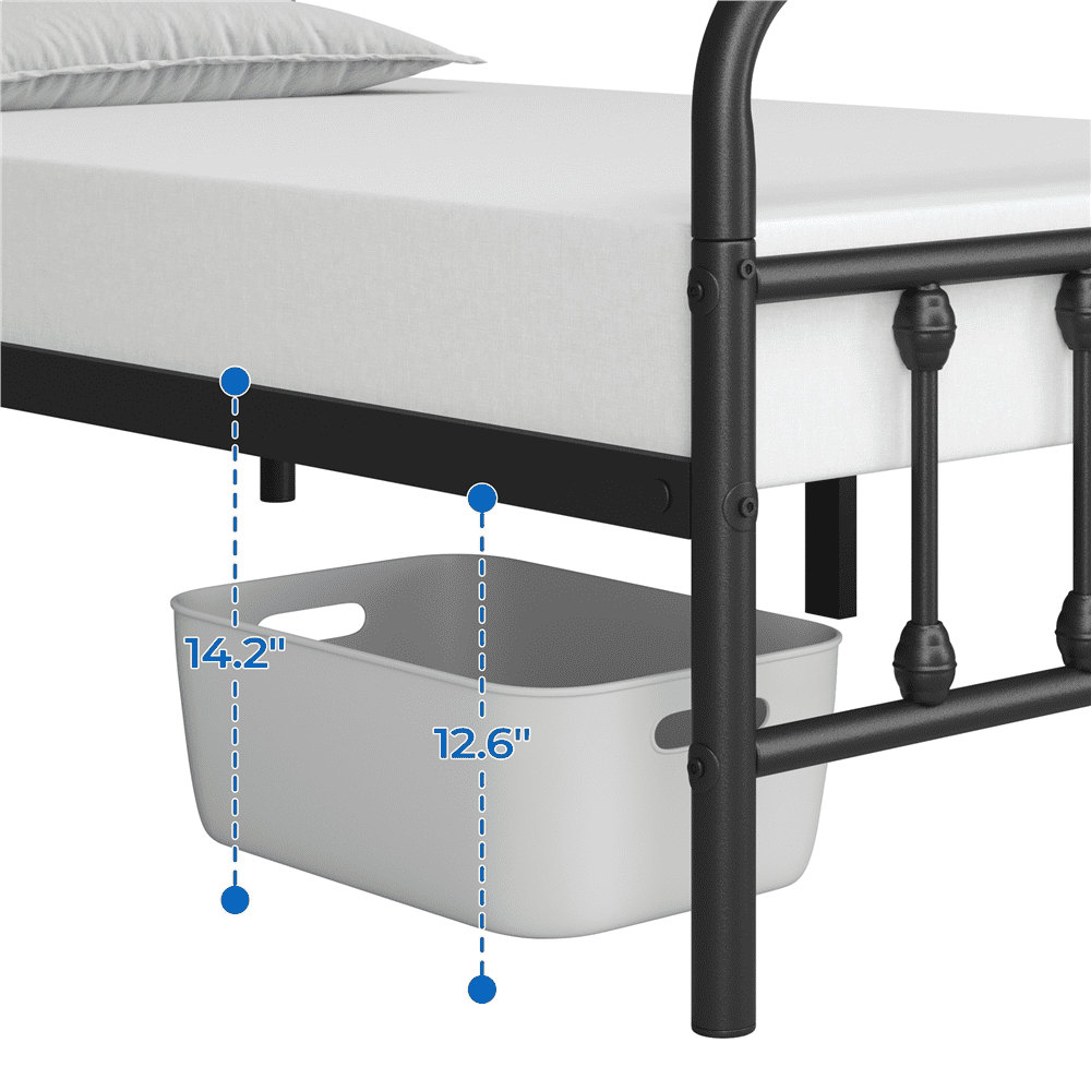 Features: VERSATILE: We care about the practical use of every piece we made, this platform bed has 32 cm/12.5″ of clearance underneath the bed for a clean and tidy space. Ideal for kids rooms, guest rooms, bedrooms, dormitories, apartments, and temporary stay CLASSIC AND ROMANTIC: This farmhouse-style bed features curved lines and thick tube frames, bringing a romantic and warm feeling to your space. The beautiful silhouette subtly balances the coolness of metal that is easily blended with modern, traditional, farmhouse, and rustic home decors IGH HEADBOARD DESIGN: Compared with other metal beds, this classic bed frame has a higher headboard for better protecting your head and providing you with a comfortable sitting place. You can prop soft pillows behind your back, and read books or watch TV lazily. SAFE: Carefully designed, this mattress foundation is built of round corners, a smooth finish, and protective footpads, which are safer for kids and teenagers to use. Moreover, the high footboard keeps bedding from falling onto the floor while you sleep STRONG AND DURABLE: This robust bed base is fully constructed of a metal frame for large load-bearing capacity. The reliable frame features 12 metal slats between two sides which provides you with strong support for a relaxing sleep. The powder-coated surface features medium rust and scratch resistance for long-term use. Besides, not shaky after proper assembly QUICK ASSEMBLY: We provide all the necessary hardware and tool, and an illustrated installation manual to help you set up this iron bed frame Specifications: Material: Iron Overall dimensions: 104.5 x 195.5 x 106 cm/41.5 x 77 x 42″ (W x L x H) Max. weight capacity: 136 kg/300 lb Ground clearance: 32 cm/12.5″ N.W.: 14.7 kg/32.4 lb G.W.: 16.5 kg/36.4 lb Color: Black Package included: 1 x Metal Twin Bed Frame 1 x Accessory Kit 1 x Instructions Note: Please allow 1 cm/0.5″ error due to manual measurement. Mattress, box spring, and bedding (comforter, sheets, pillows, etc.) are omitted.