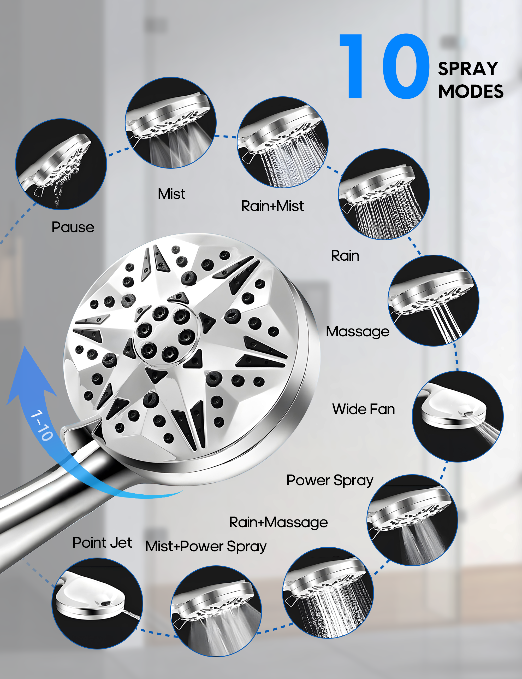 Wide Coverage: Our large 12-inch shower head provides full-body water coverage, delivering a truly luxurious shower experience. With its generously sized design, you’ll never feel left out in the cold. Dual Functionality: Enjoy the luxury of a fixed overhead shower without compromising on the convenience of a flexible handheld attachment. Rinse and relax from head to toe with our combination shower system. Customizable Handheld Spray: The handheld showerhead features 10 different spray settings, allowing you to tailor your shower experience to match your mood and needs. Stylish & Adjustable Extension Arm: The adjustable extension arm enhances the versatility of the showerhead combo, making it easy to reach every corner of your shower. The sleek Silver Chrome finish adds a modern touch to your bathroom’s design. Rainfall Sensation: Immerse yourself in the soothing sensation of a rainfall-style shower. Designed to replicate the calming feel of natural rain, our shower head provides a truly relaxing experience, leaving you refreshed and rejuvenated.