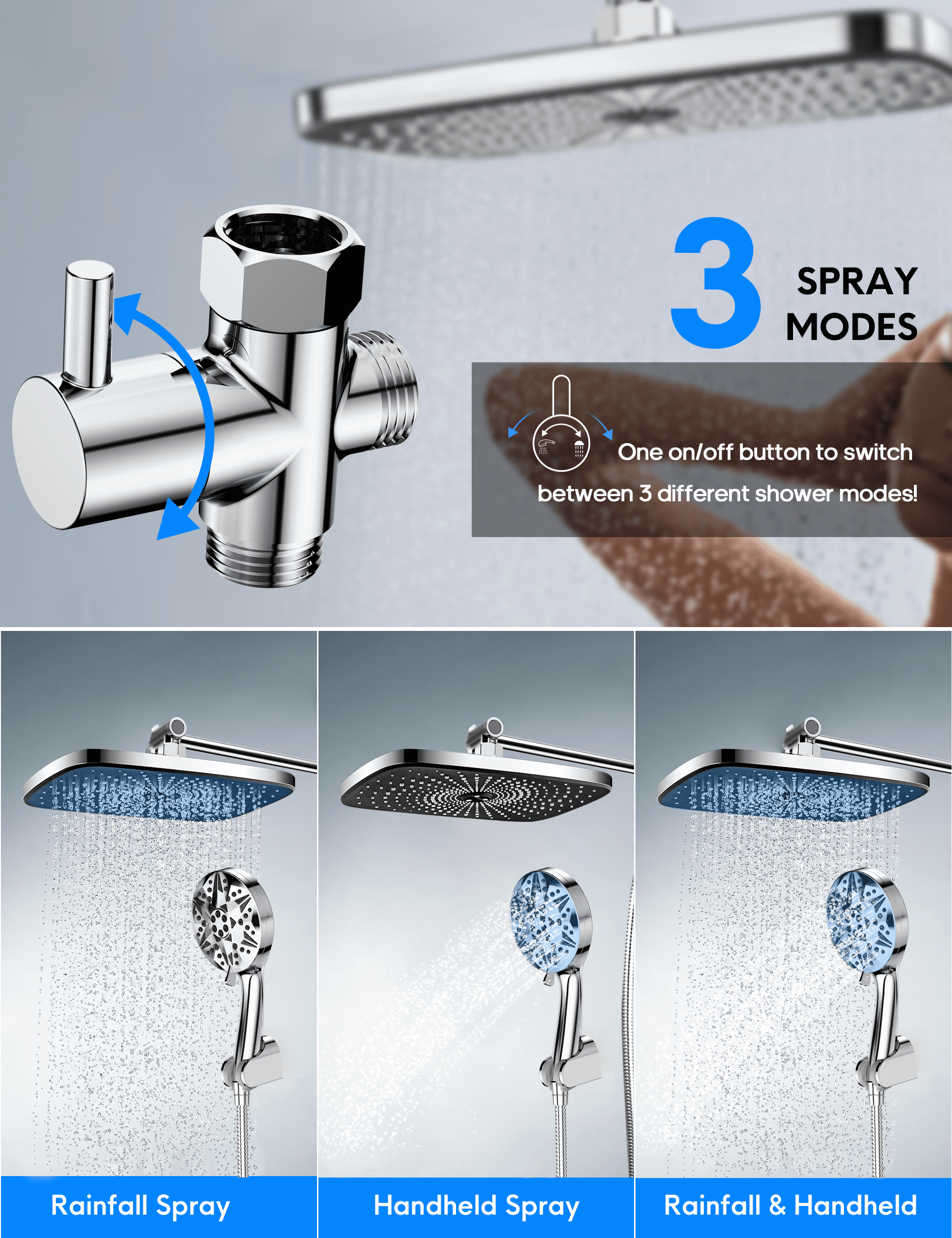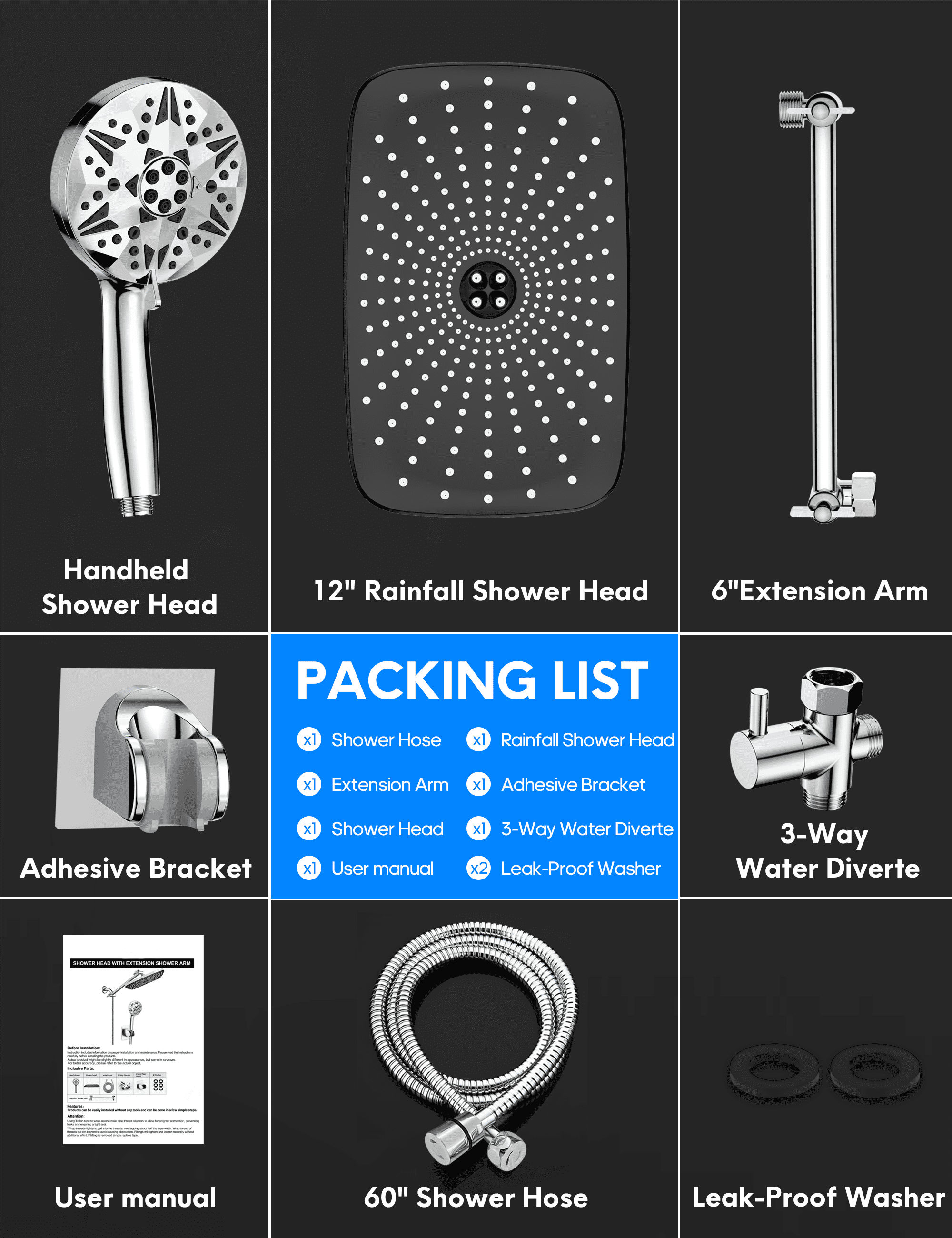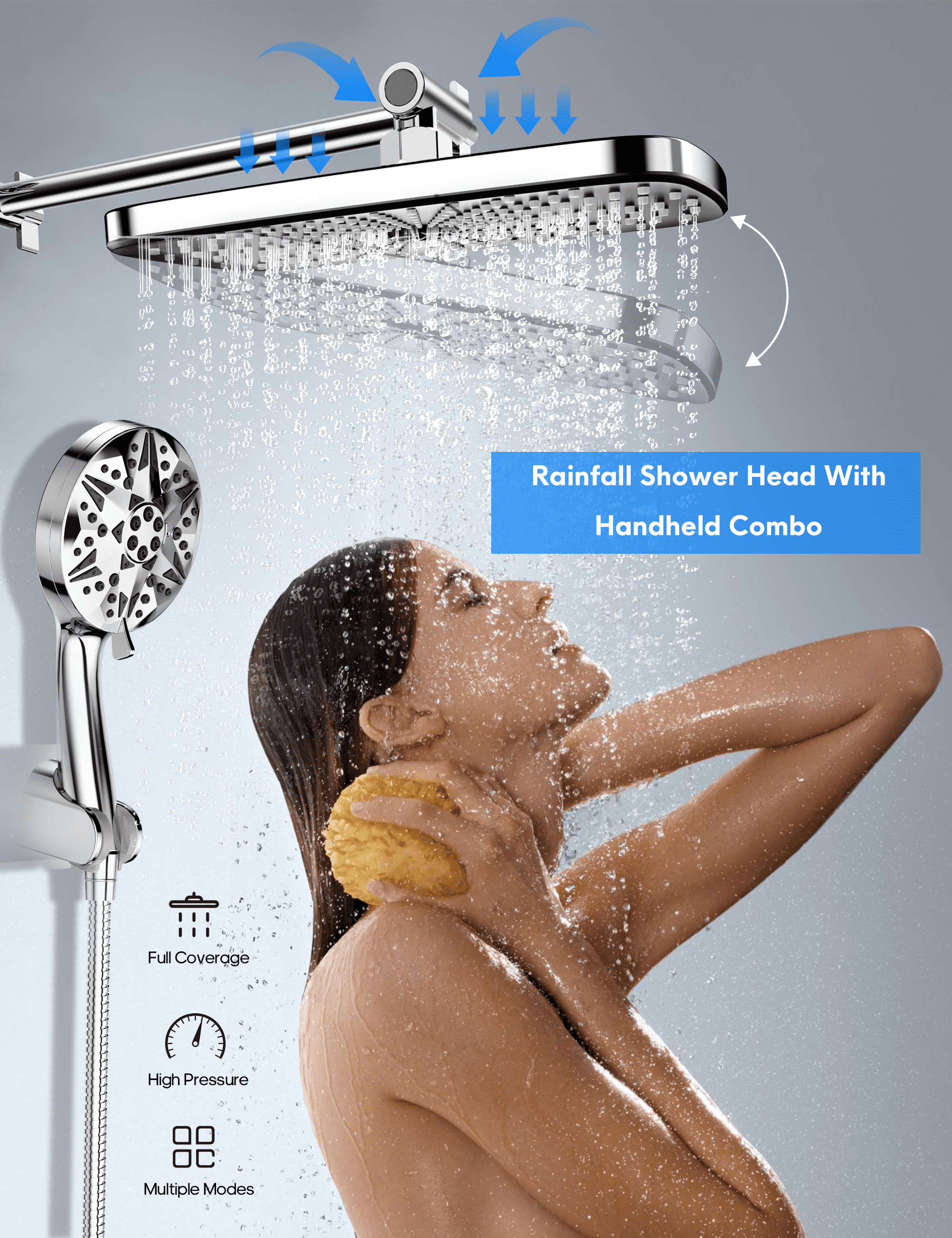 Upgrade your shower experience with our 12-Inch High-Pressure Rain Shower Head Combo with Extension Arm. Indulge in the wide coverage of a rainfall showerhead, enhanced by 10 versatile handheld spray settings. The adjustable dual showerhead system, featuring anti-clog nozzles, delivers a consistent and invigorating water flow. With a sleek Silver Chrome finish, it adds both style and functionality to your bathroom. **Rainfall Bliss:** Immerse yourself in the calming sensation of a rainfall-style shower. Designed to replicate the soothing feel of natural rain, this shower head provides a relaxing experience that leaves you refreshed and rejuvenated. **Versatile Convenience:** Enjoy the luxury of a fixed overhead shower without giving up the flexibility of a handheld attachment. Rinse and relax from head to toe with our dual shower system. **Handheld Power:** The handheld showerhead, crafted from fully chrome-plated, heat-resistant stainless steel, combines ultra-thin design with air intake technology to deliver a powerful, high-pressure spray. It’s like a dynamic full-body massage for your skin, optimized for any water pressure.