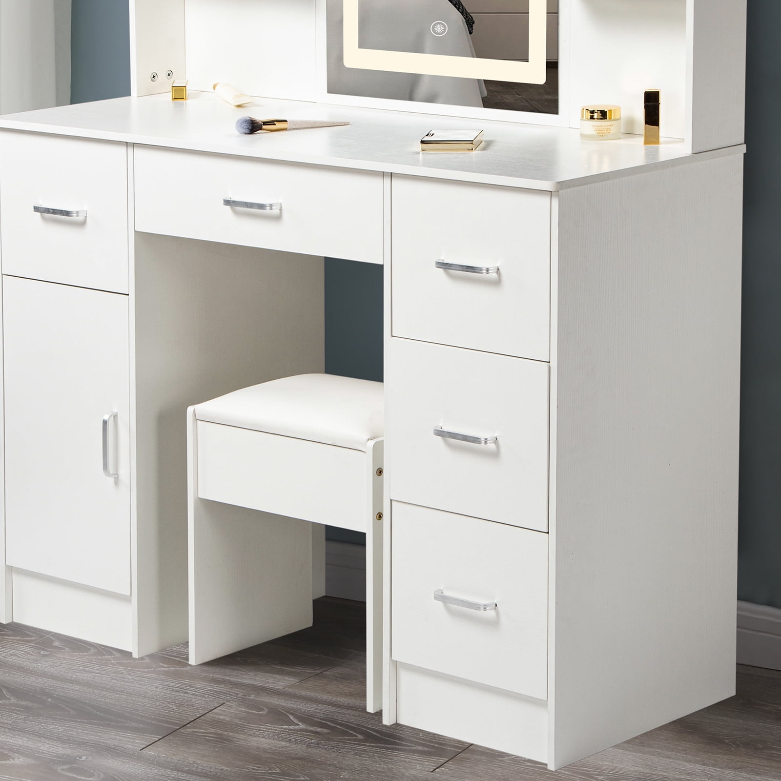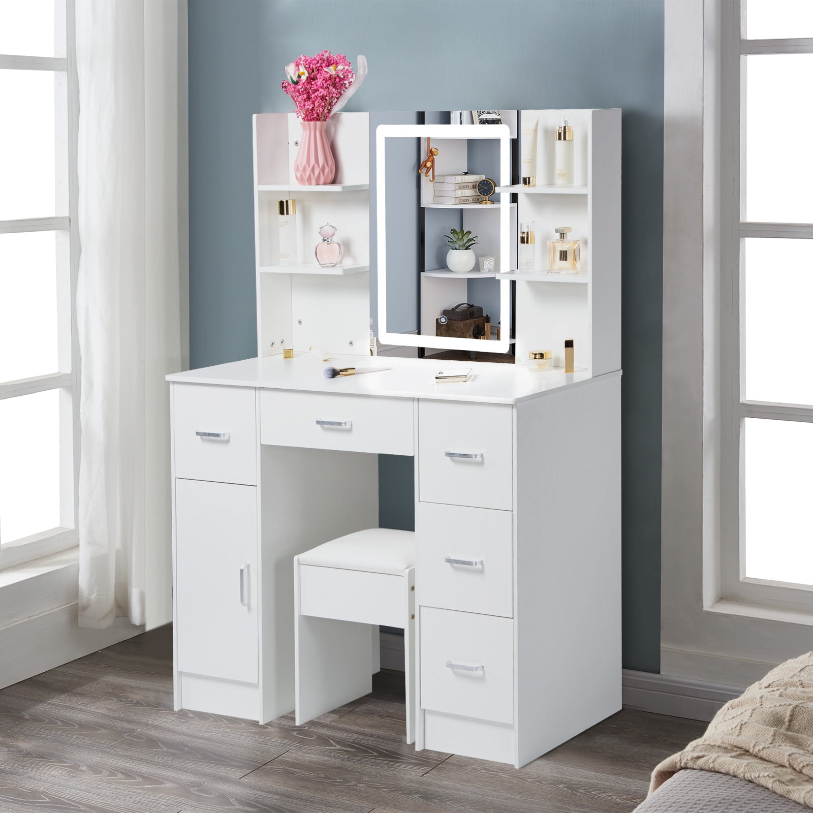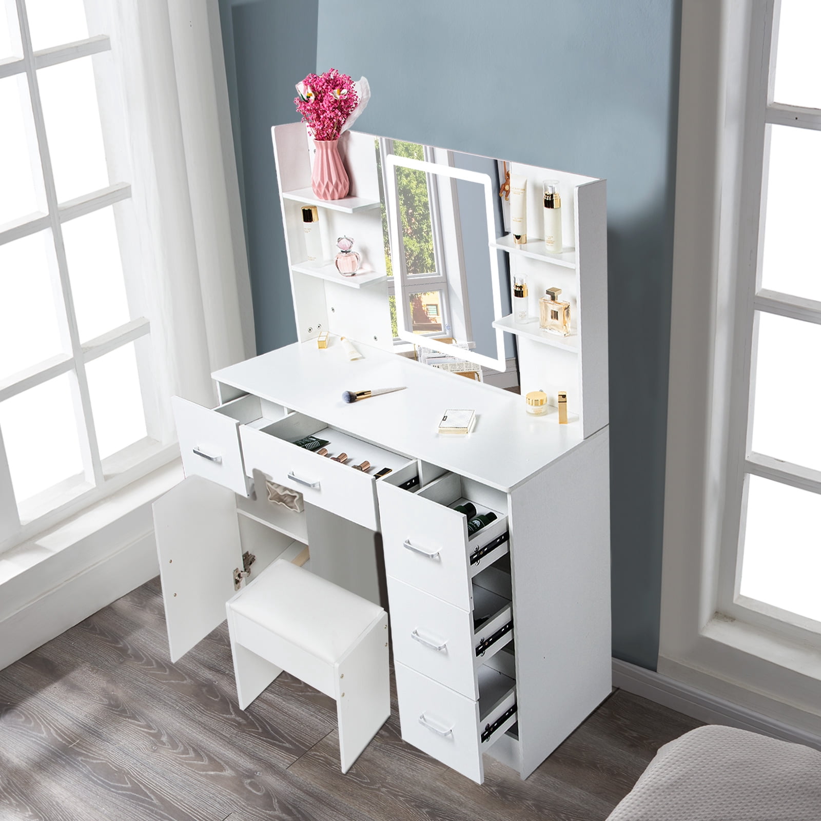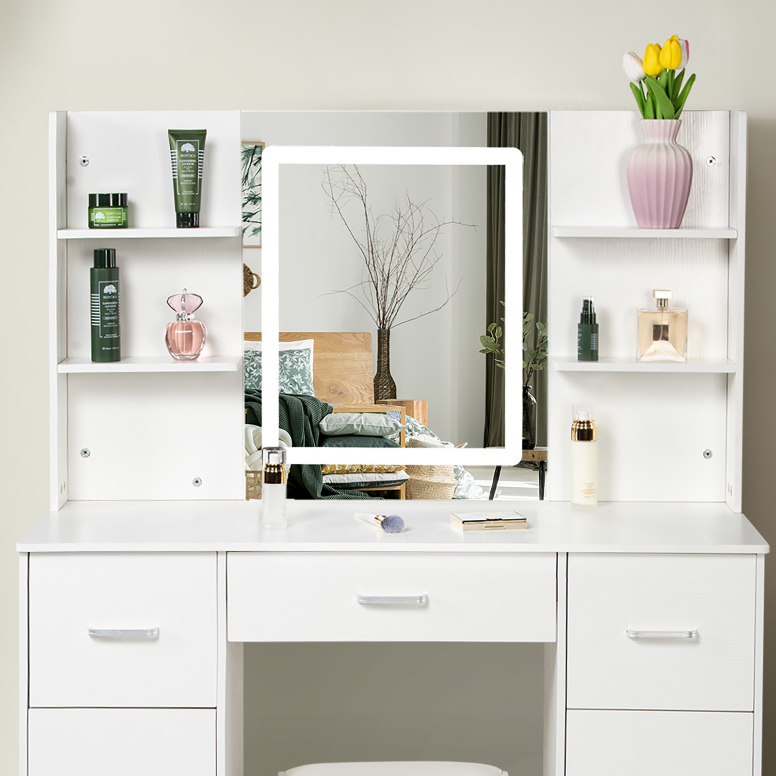 Yamissi Makeup Vanity Desk with Mirror & Led Lights, Vanity Set w/ 5 Drawers & Stool, Dressing Table for Girls Princess, White The exquisite makeup vanity set, a perfect blend of style and functionality for your daily beauty routine. This modern vanity set combines style and functionality seamlessly. With its sleek design and premium craftsmanship, it will enhance the aesthetics of any room. The vanity set features a spacious vanity desk with four open storage shelves, providing ample space for your makeup essentials, perfumes, lotions, and more. The large LED vanity mirror offers a crystal-clear reflection, allowing you to achieve flawless makeup application every time. Five drawers and one cabinet offer convenient organization for your cosmetics and jewelry, keeping everything within reach. The included padded stool provides a comfortable seating experience while you indulge in your beauty rituals. Whether you’re a makeup enthusiast or simply looking to streamline your beauty routine, this white vanity table is the perfect addition to your bedroom or dressing area, offering convenience and elegance in one chic package.