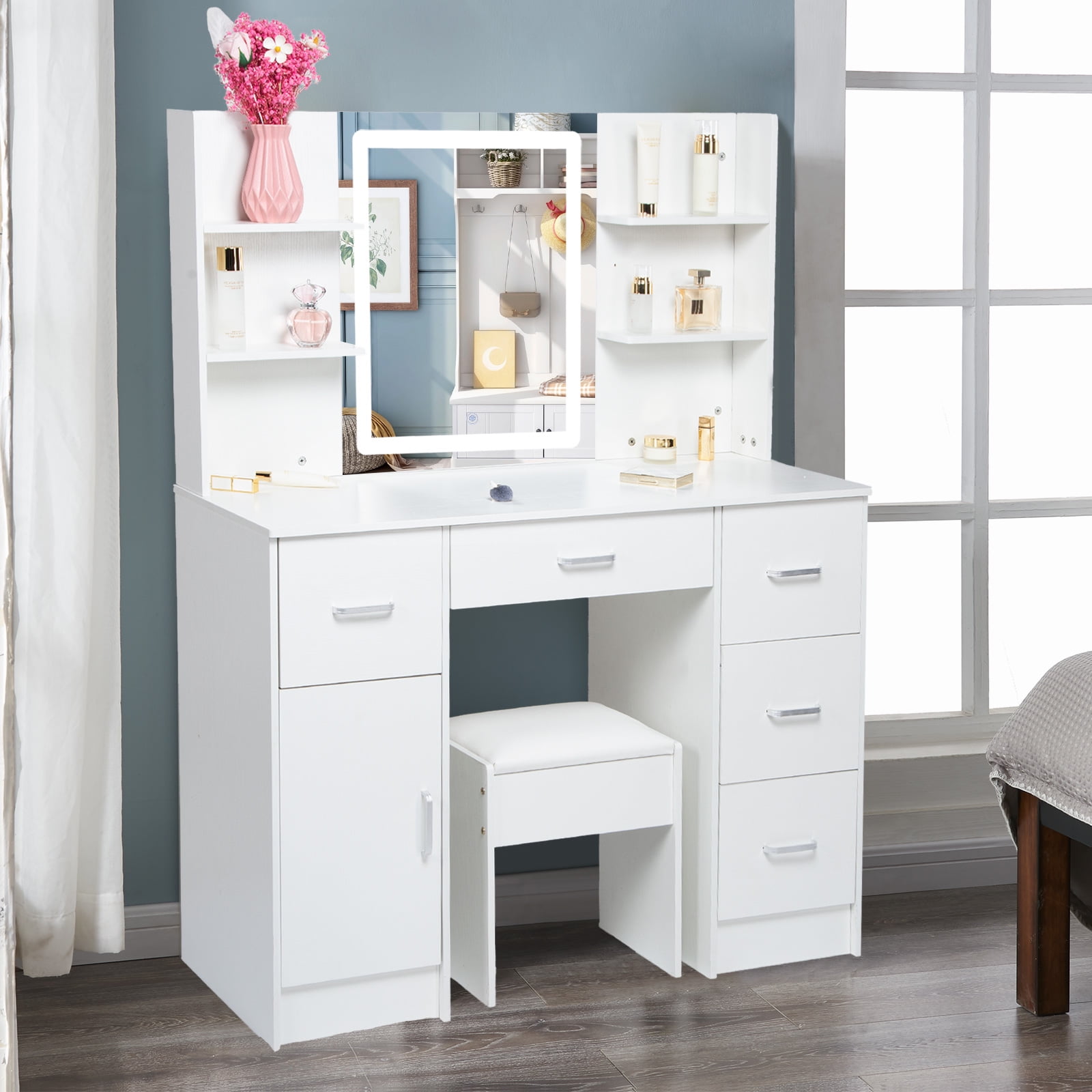 Yamissi Makeup Vanity Desk with Mirror & Led Lights, Vanity Set w/ 5 Drawers & Stool, Dressing Table for Girls Princess, White