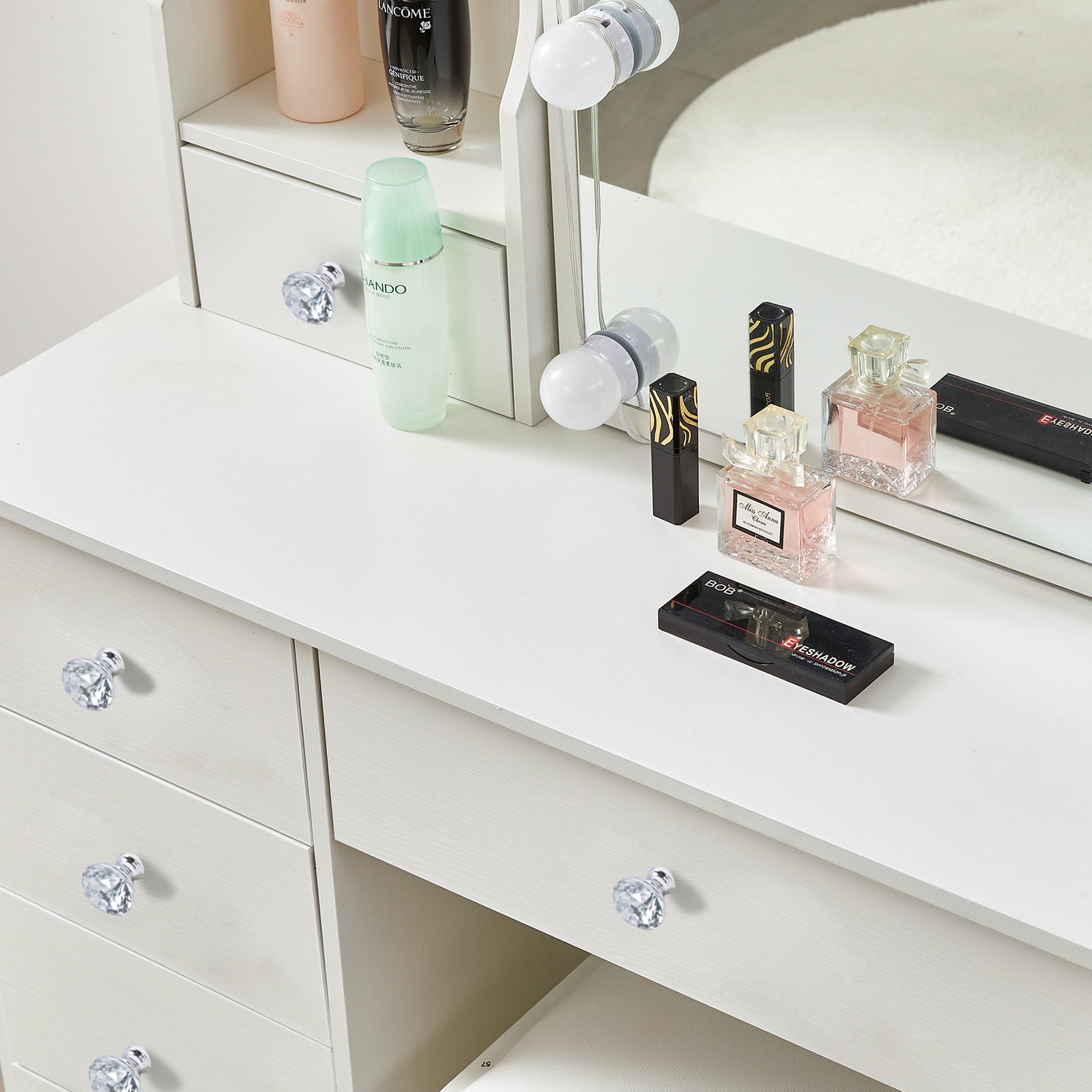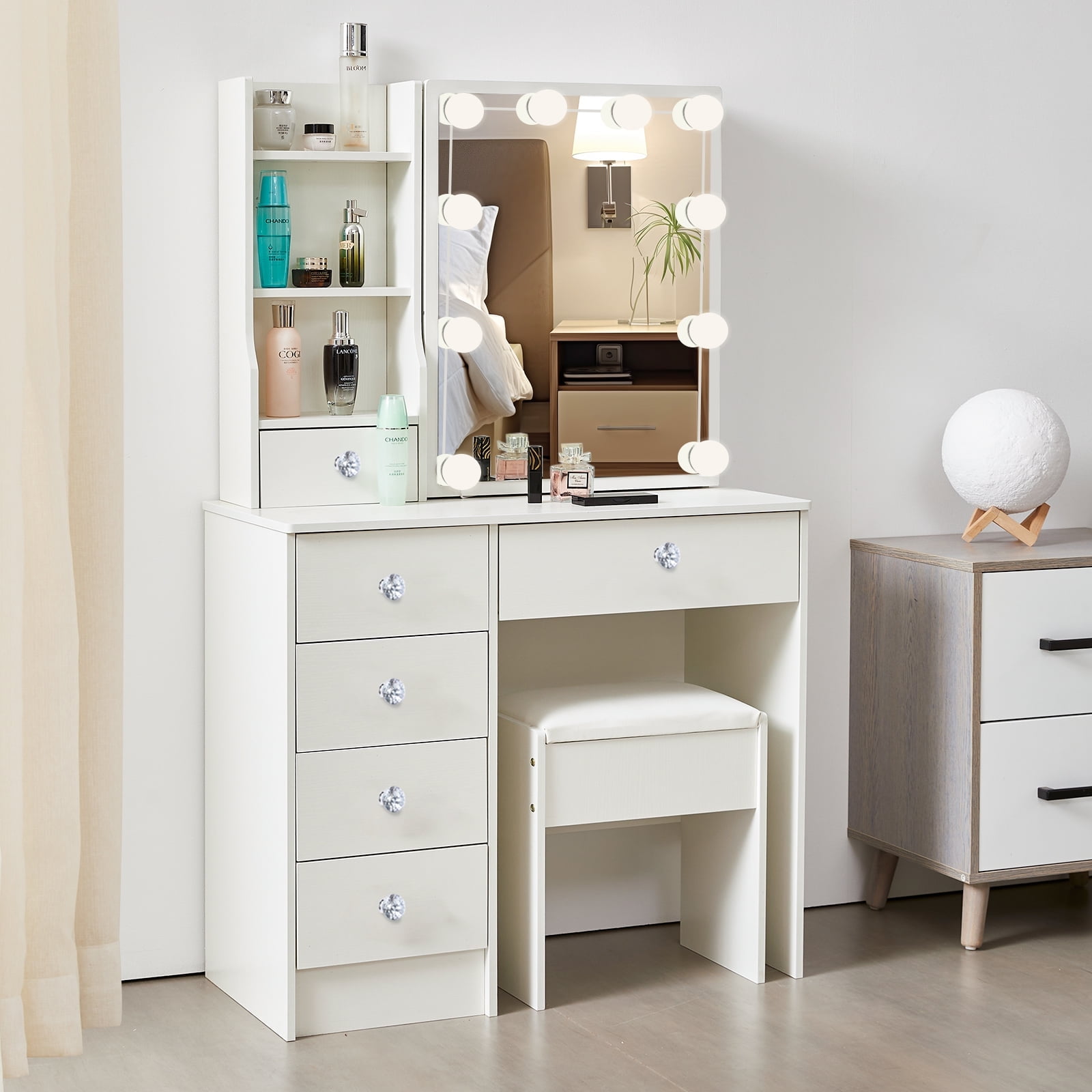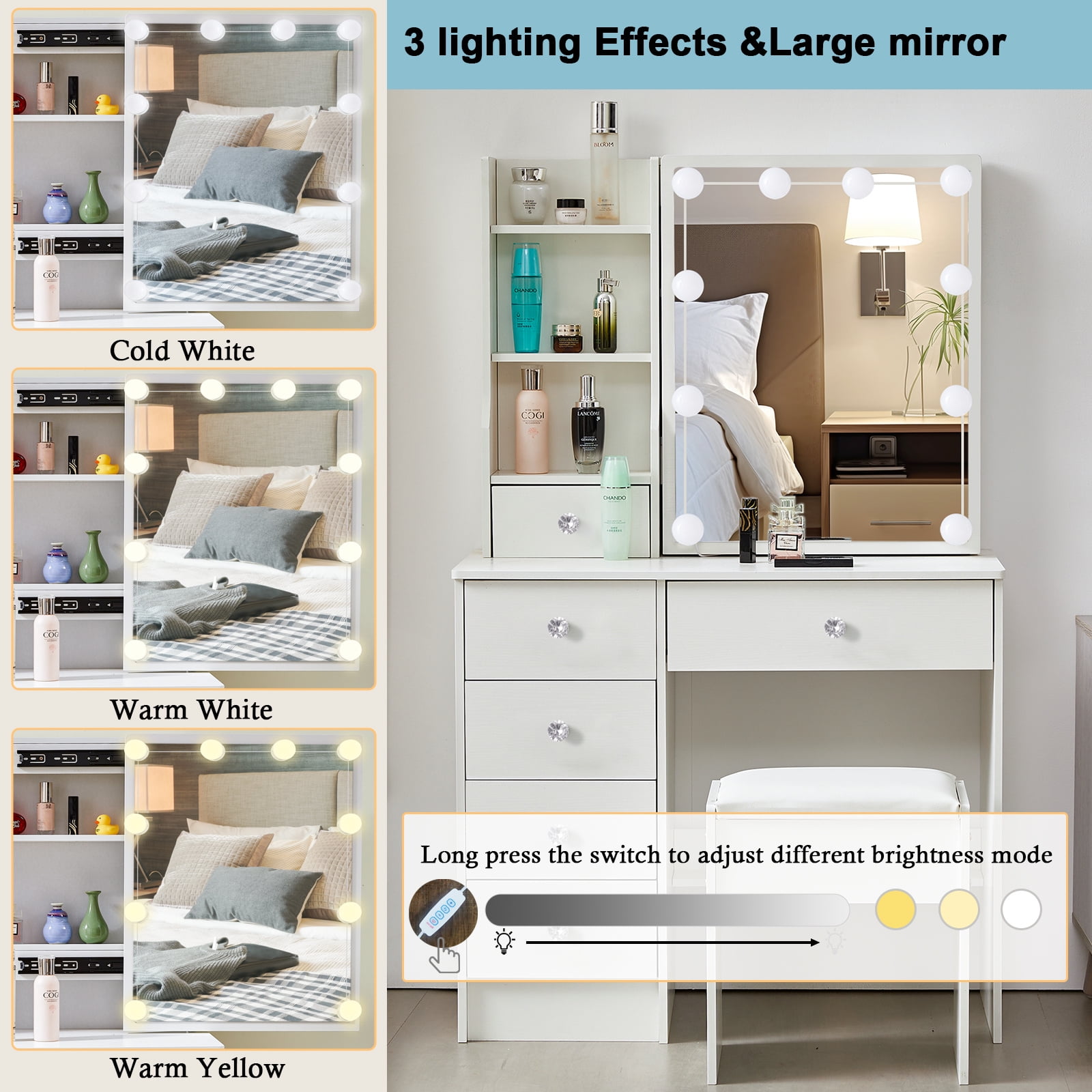 A large sliding mirror with 10 LED lights that provides a clear view and helps you look your best every day. One spacious middle drawer and four small drawers are perfect for storing jewelry, treasures, and perfumes, meeting all your makeup needs. The decoration features beautiful crystal diamond-shaped knobs. Three shelves behind the right sliding mirror and on the left side also provide additional storage space, keeping your table neat and organized. The generous tabletop can be easily transformed between a dressing table and a writing desk. This modern vanity crafted from environmentally friendly MDF and wood, this product offers excellent stability and durability, adding an elegant touch to any space. The cushioned stool, made with smooth leather and soft sponge, offers optimal comfort. Suitable for various room types, including bedrooms, living rooms, bathrooms, and studies. As a bonus, we include 10 LED bulbs that bring a Hollywood makeup vibe. With three levels of color temperature, you can adjust the brightness to meet different makeup needs.