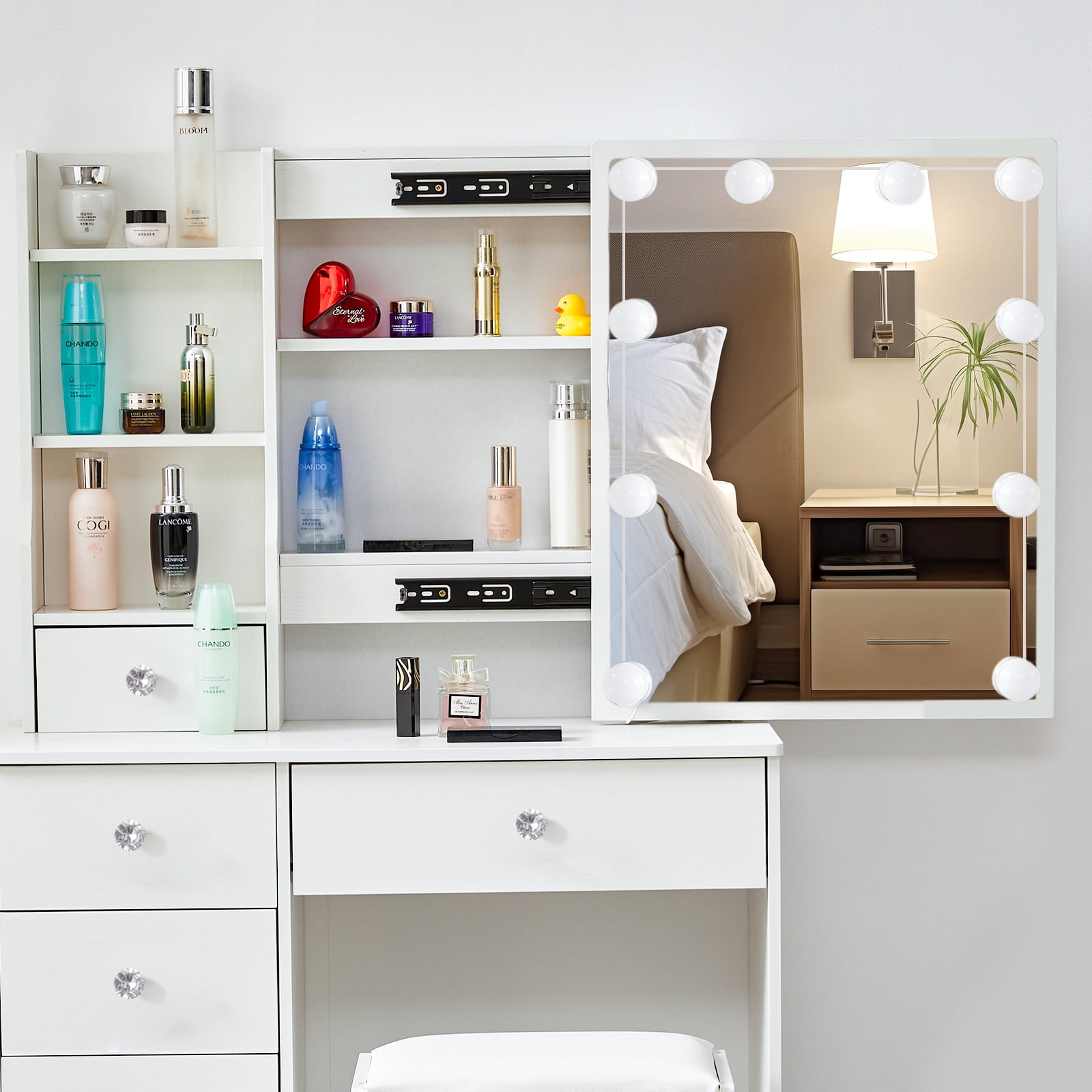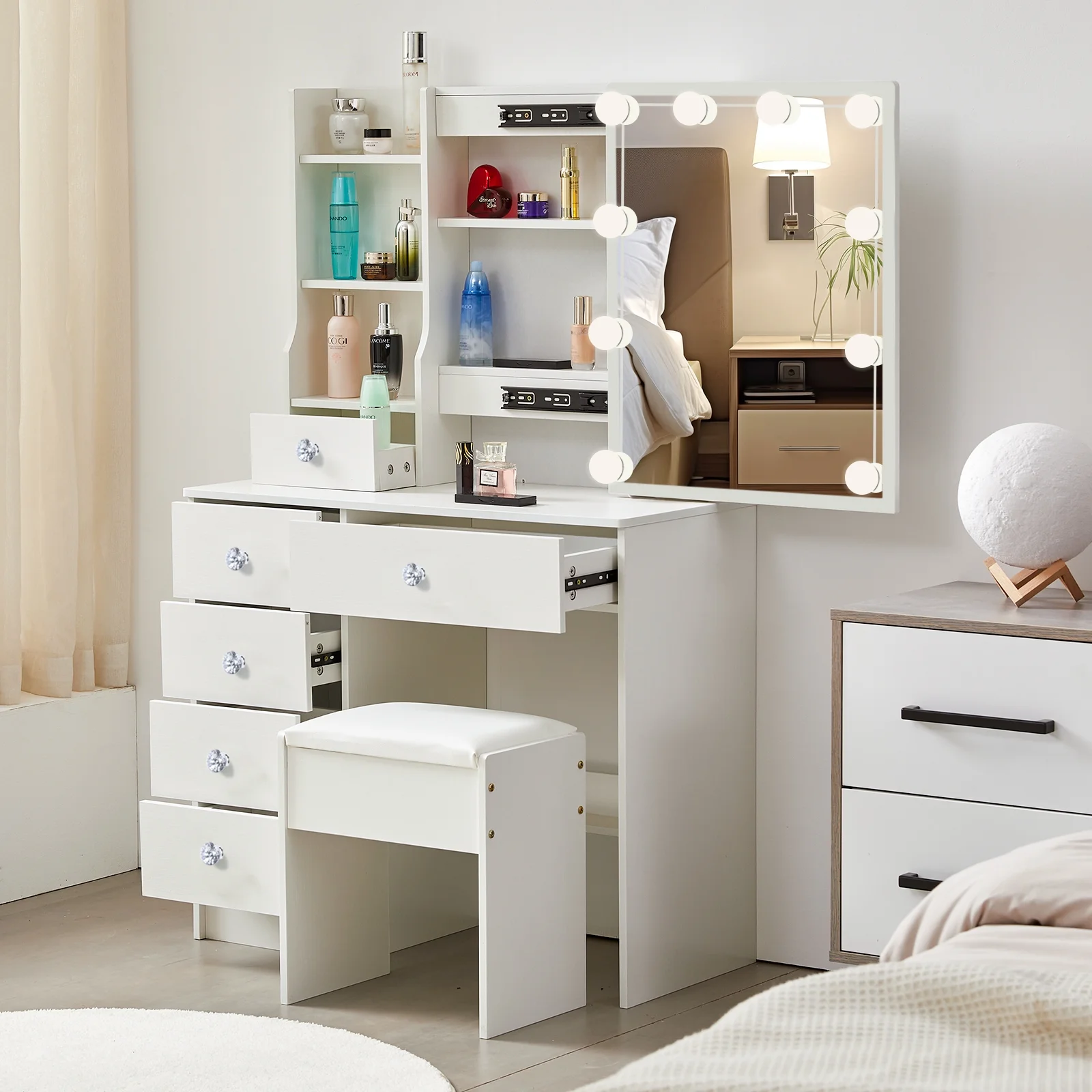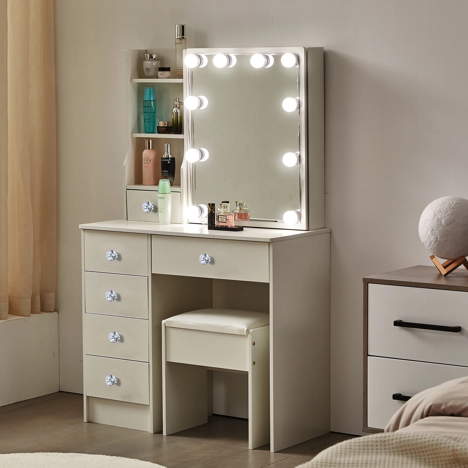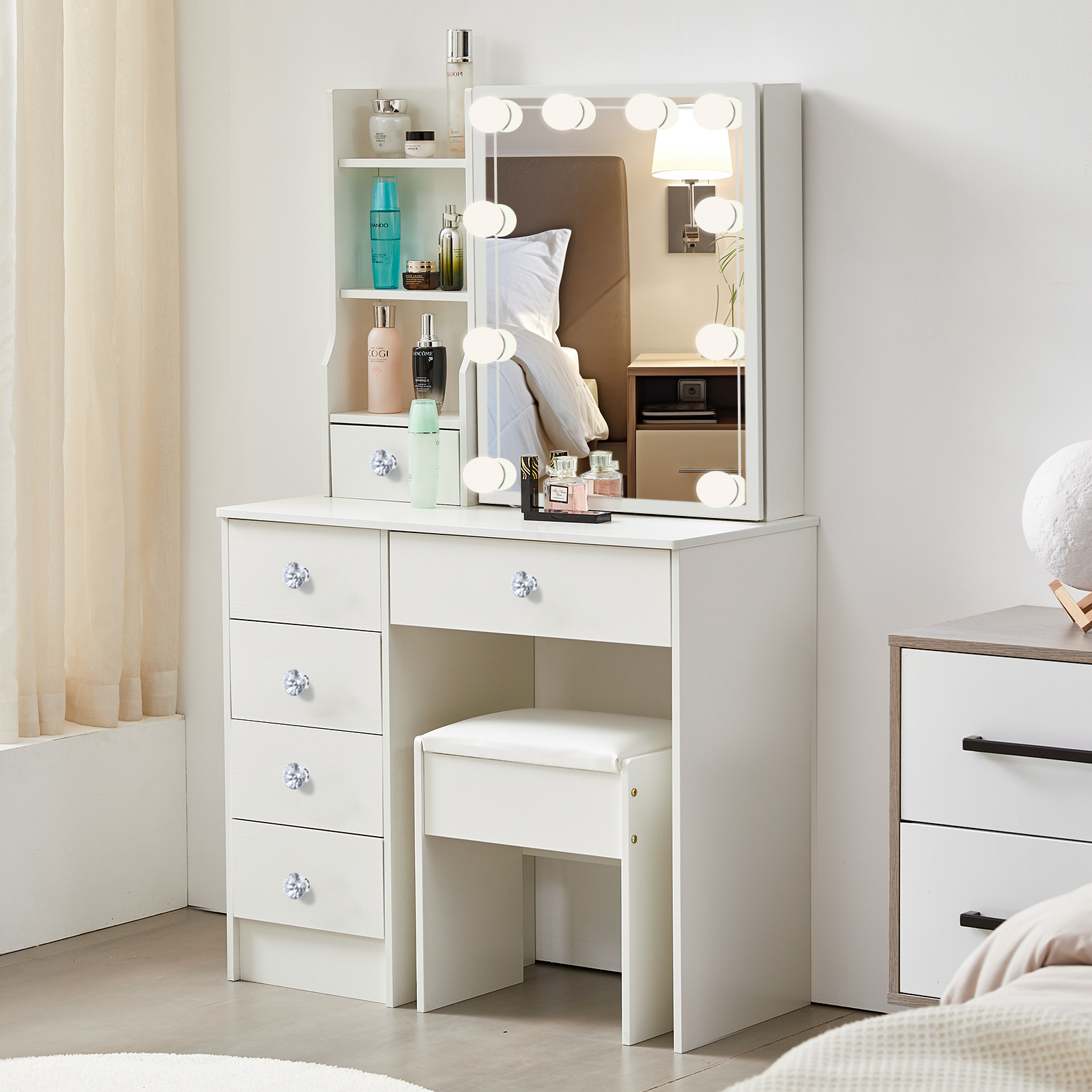 A large sliding mirror with 10 LED lights that provides a clear view and helps you look your best every day. One spacious middle drawer and four small drawers are perfect for storing jewelry, treasures, and perfumes, meeting all your makeup needs. The decoration features beautiful crystal diamond-shaped knobs. Three shelves behind the right sliding mirror and on the left side also provide additional storage space, keeping your table neat and organized. The generous tabletop can be easily transformed between a dressing table and a writing desk. This modern vanity crafted from environmentally friendly MDF and wood, this product offers excellent stability and durability, adding an elegant touch to any space. The cushioned stool, made with smooth leather and soft sponge, offers optimal comfort. Suitable for various room types, including bedrooms, living rooms, bathrooms, and studies. As a bonus, we include 10 LED bulbs that bring a Hollywood makeup vibe. With three levels of color temperature, you can adjust the brightness to meet different makeup needs.