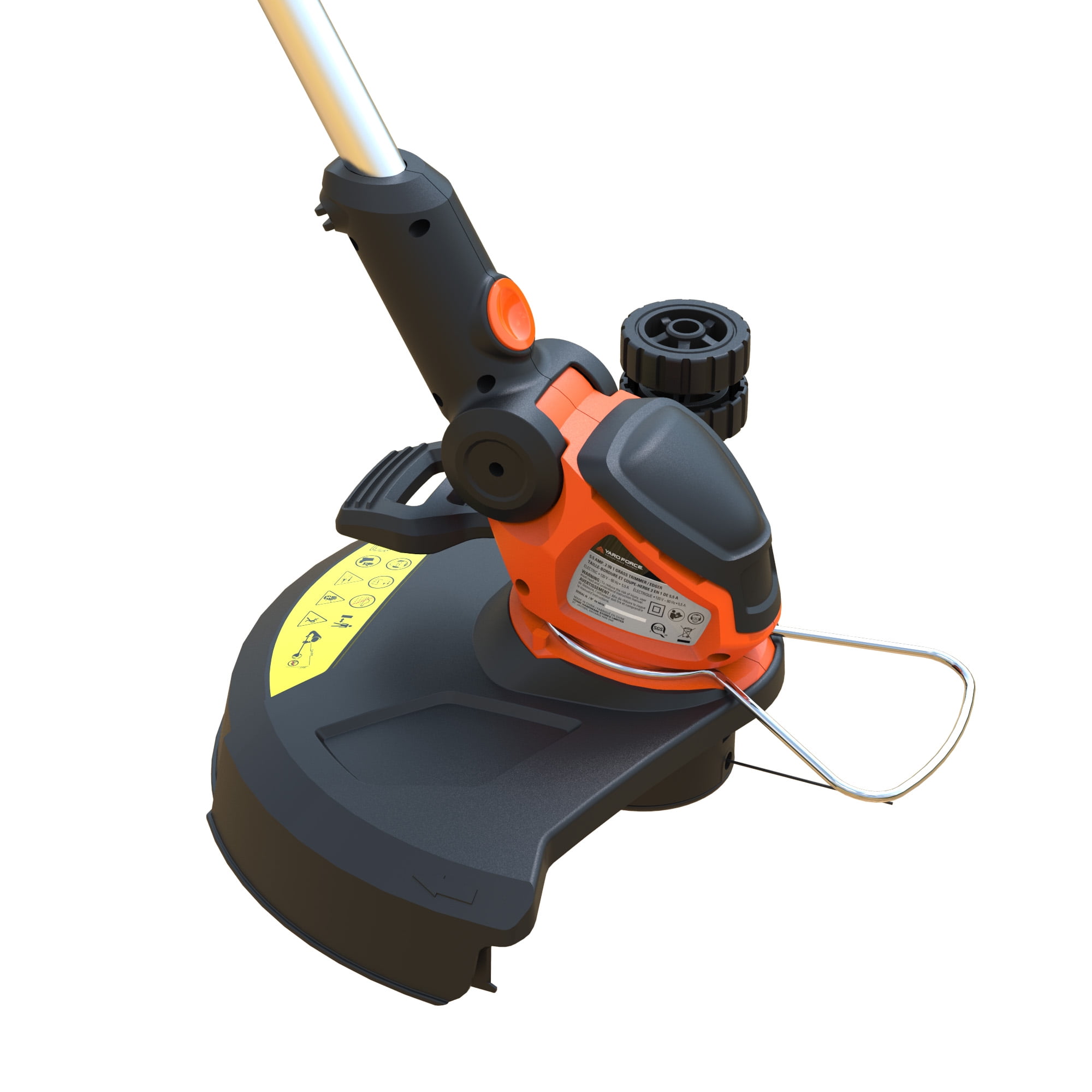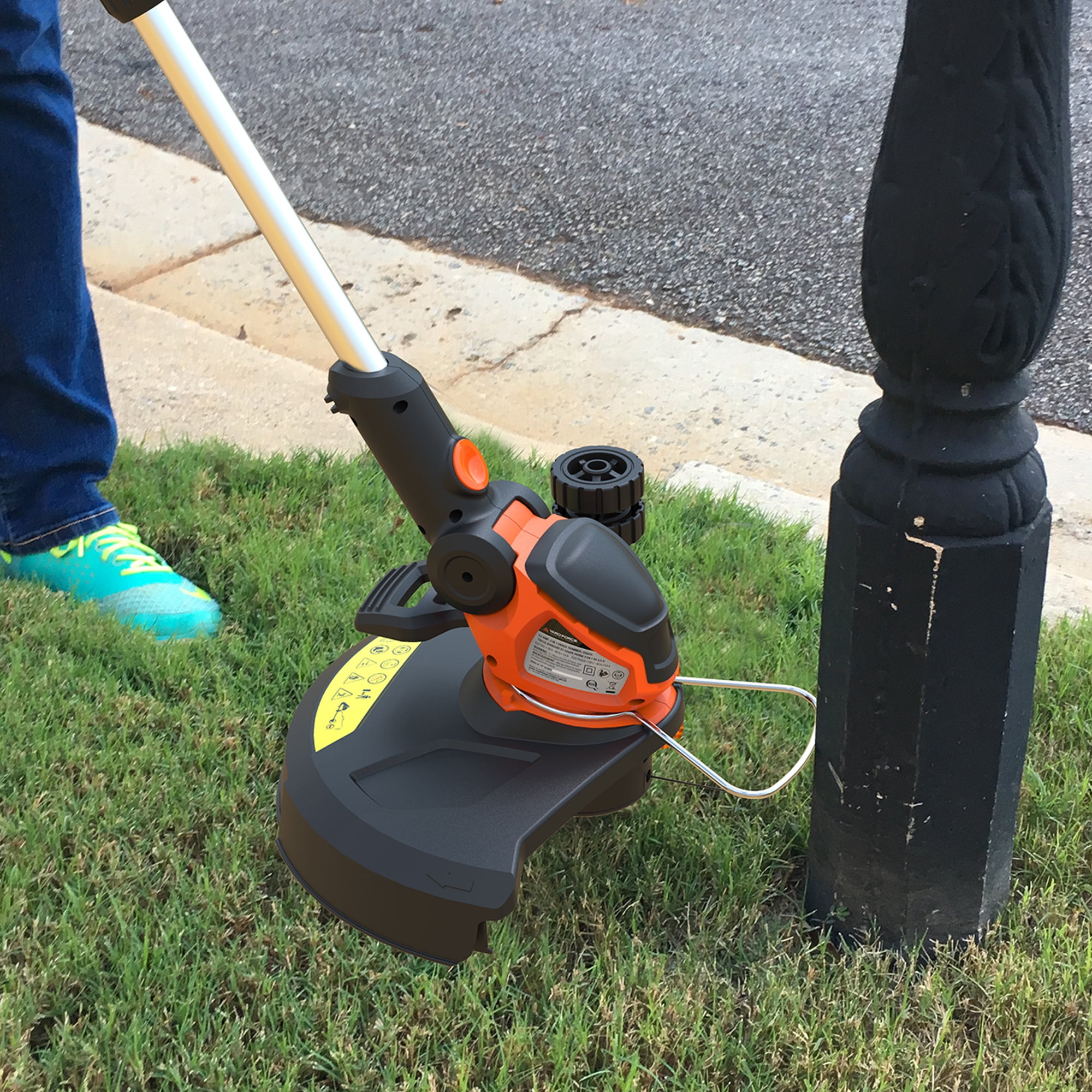 Powerful and efficient 5.5 Amp electric motor 7500 RPM 0.065 in. dual-line power head Lightweight and strong aircraft aluminum shaft telescopes Ergonomic designed soft-grip handle Unique quick-step lever on the base allows you to use your foot to quickly snap it into an edger mode. Edger wheel for a precision trim Cord retention system prevents frustrating accidental cord disconnection Lightweight and easy-to-use design is well-balanced for comfort Environmentally friendly without the hassle of maintenance of a gas engine Includes bonus PPE kit with safety glasses 2-year warranty