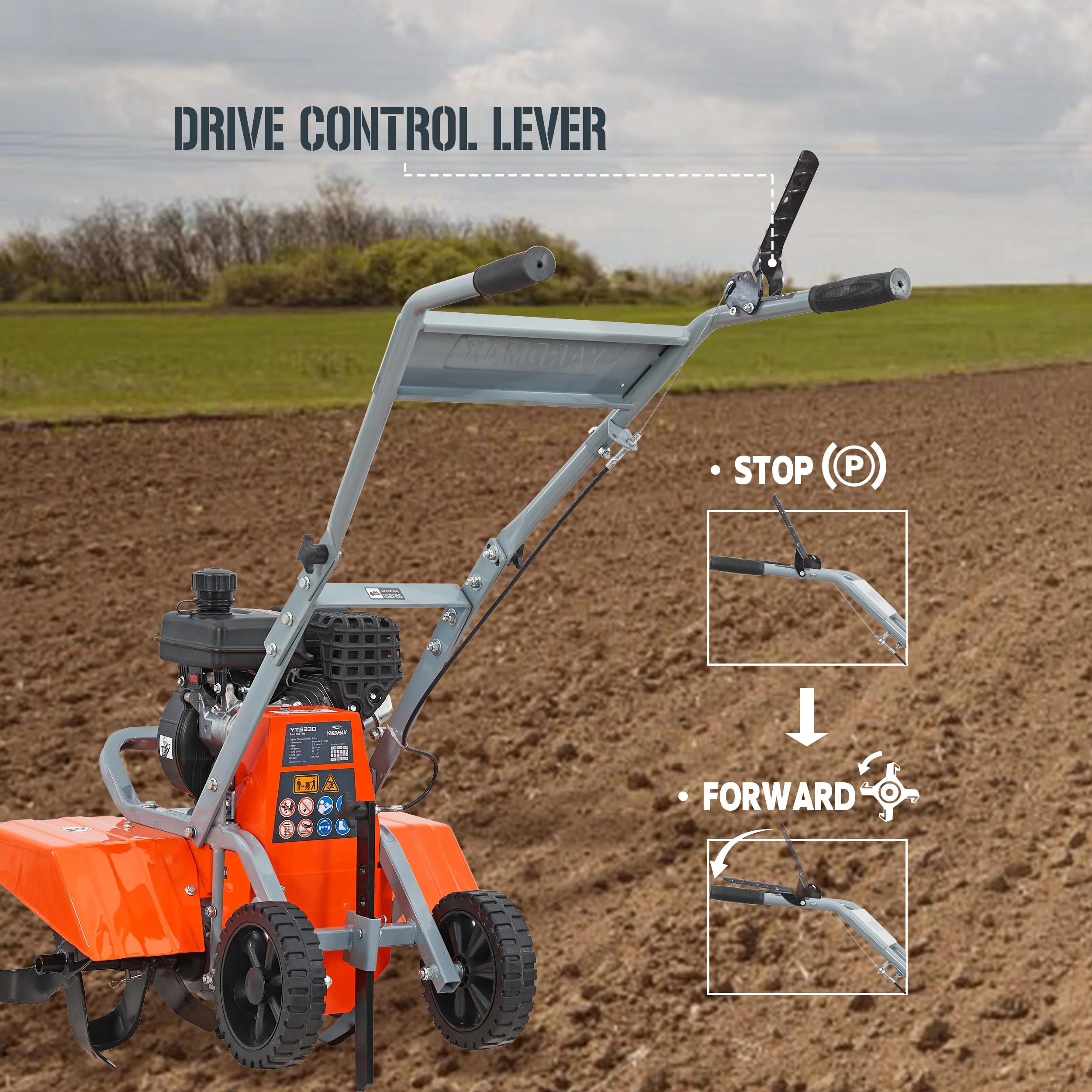 Depth control with drag stake makes it easier to turn and delivers a smoother till. Powerful 80cc YARDMAX engine delivers 180 RPM rotational speed. 1-piece sheet metal shield with reinforced punched slots for extended durability. Provides a tilling width of 11″, 16″ or 21″. Tilling depths from 7″ to 11″ for intense, compact cultivation. Durable ball bearing gear drive transmission for prolonged use. Removable outer tines allow tilling in tight spaces, easily maneuvering in gardens. Easy-to-use, 3-position, adjustable-height handlebar controls operation on the fly.