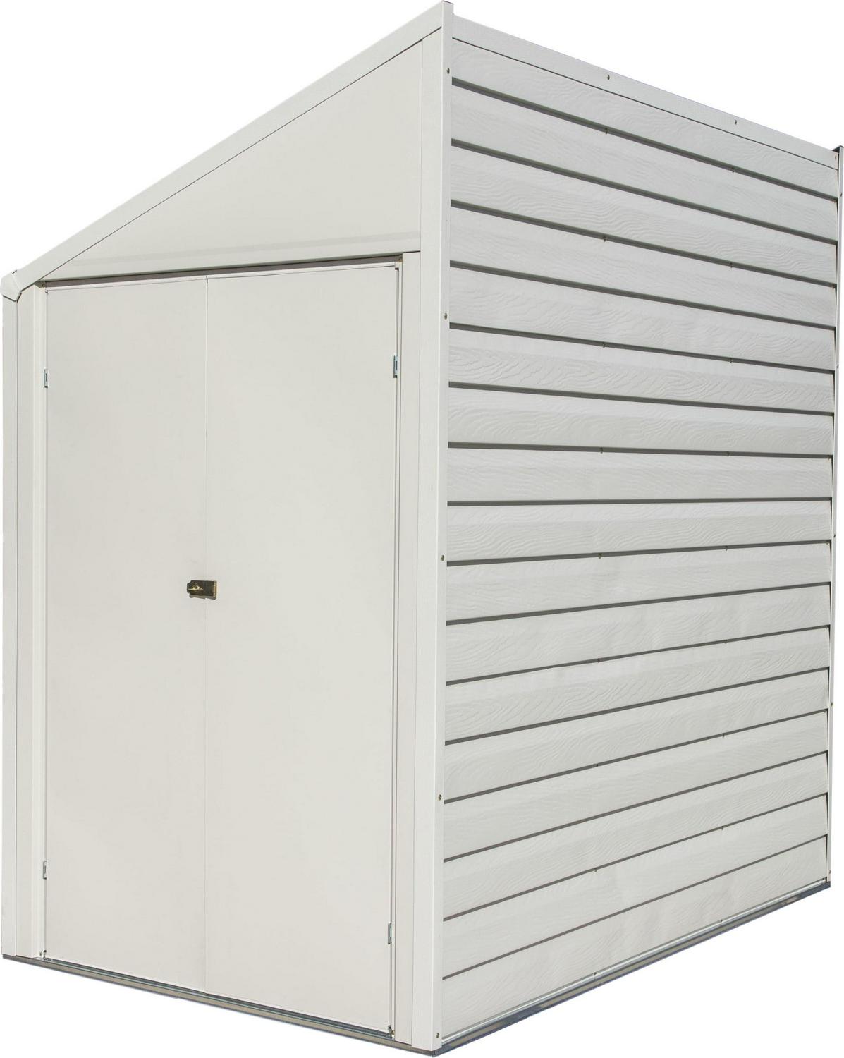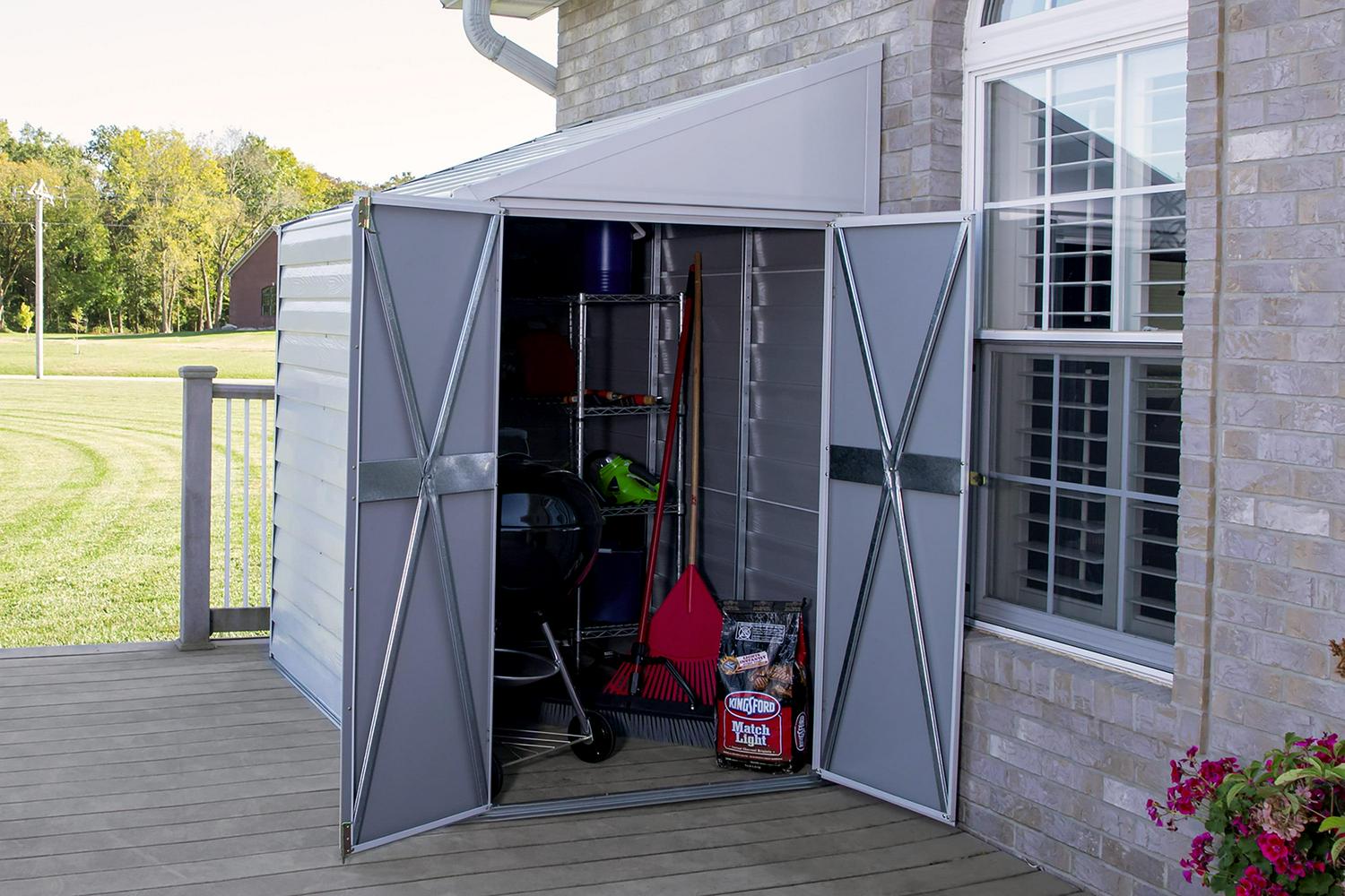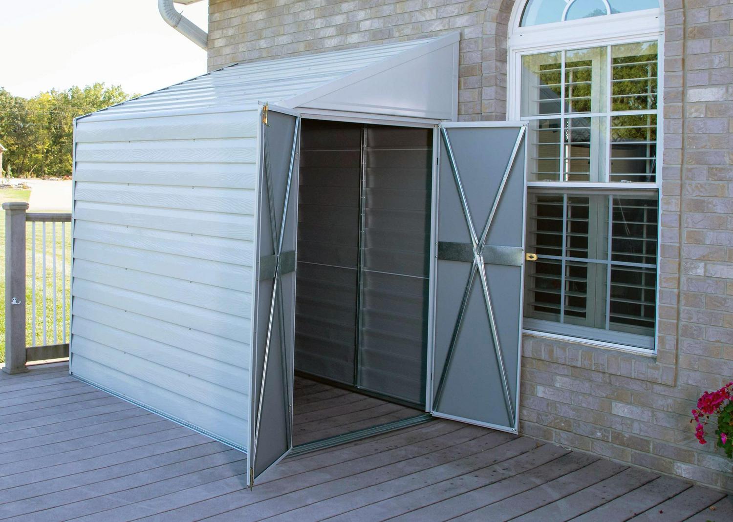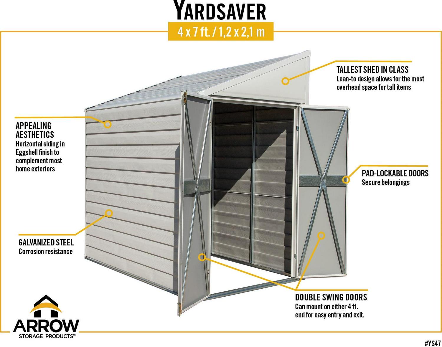 A Sloped Roof And Lean-To Design Allow You To Abut This Arrow Yardsaver Storage Shed Against Another Structure For Maximum Space Efficiency. The Double-Door Entryway Can Be Assembled On Either End To Suit Your Storage Needs. Safeguard And Store Bikes, Patio Furniture, Grills, Tools, Lawn And Garden Supplies, Pool Accessories, Trash Cans, And More. This Floorless Storage Building Is Constructed With Galvanized Steel And Rises 82 In. At Its Highest Point For Plenty Of Headroom For Maneuverability.