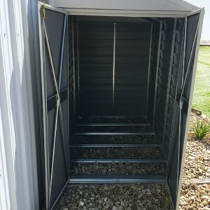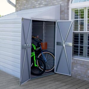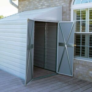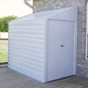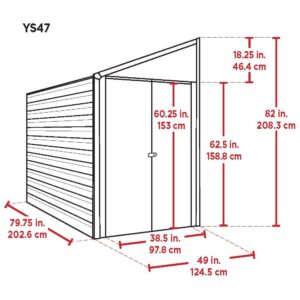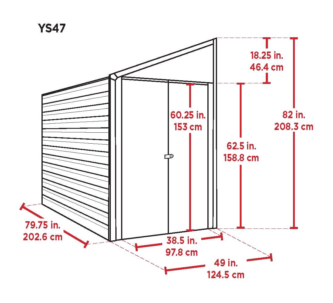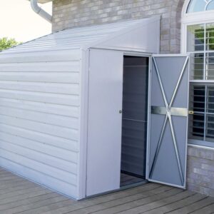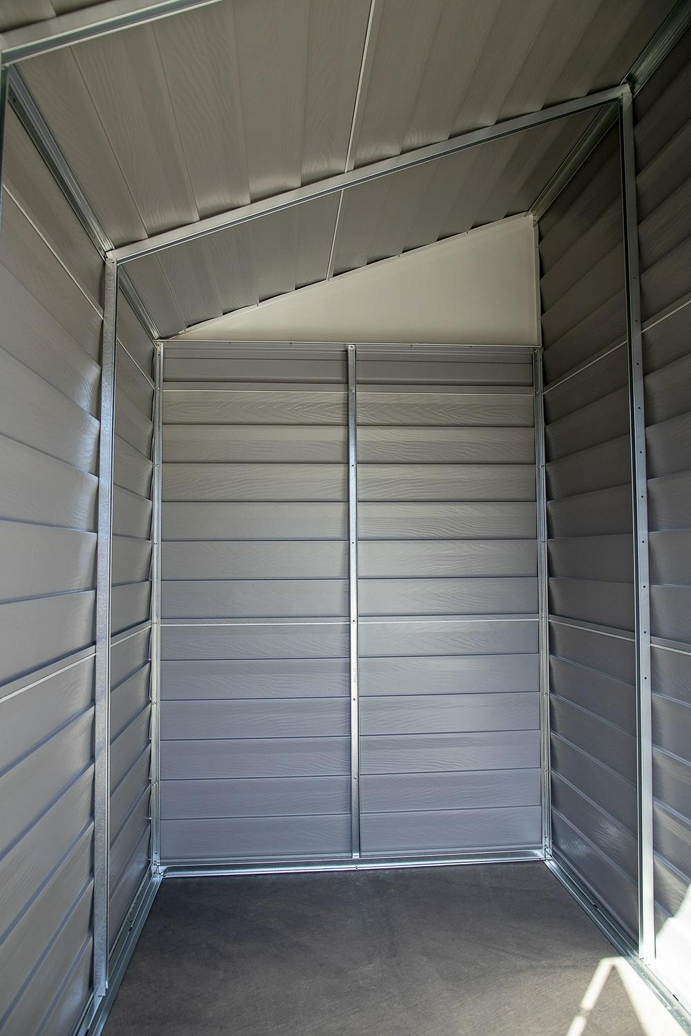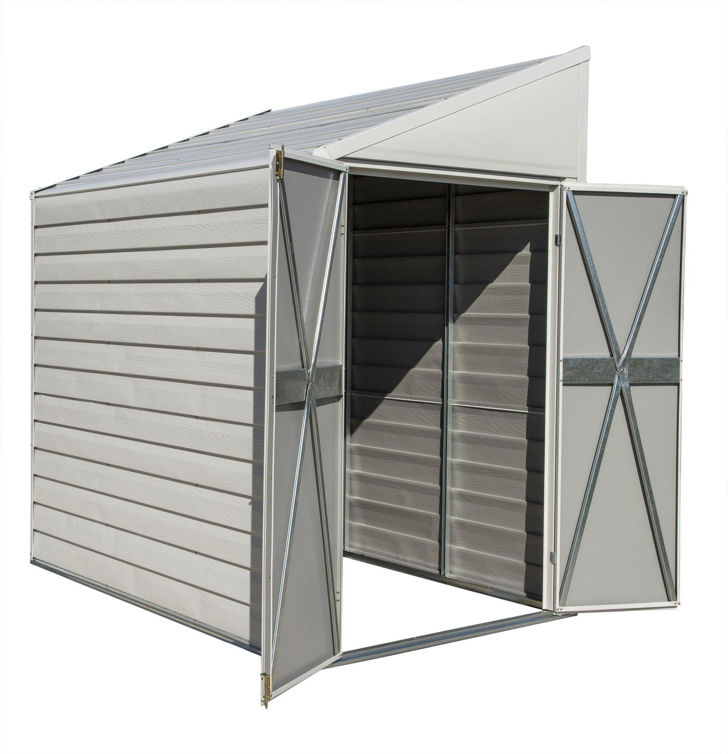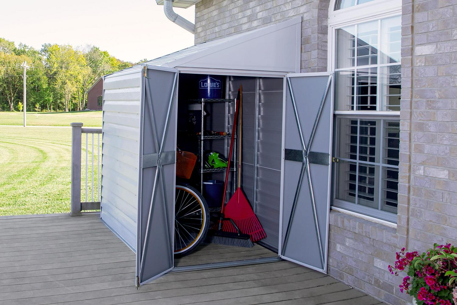 A Sloped Roof And Lean-To Design Allow You To Abut This Arrow Yardsaver Storage Shed Against Another Structure For Maximum Space Efficiency. The Double-Door Entryway Can Be Assembled On Either End To Suit Your Storage Needs. Safeguard And Store Bikes, Patio Furniture, Grills, Tools, Lawn And Garden Supplies, Pool Accessories, Trash Cans, And More. This Floorless Storage Building Is Constructed With Galvanized Steel And Rises 82 In. At Its Highest Point For Plenty Of Headroom For Maneuverability.