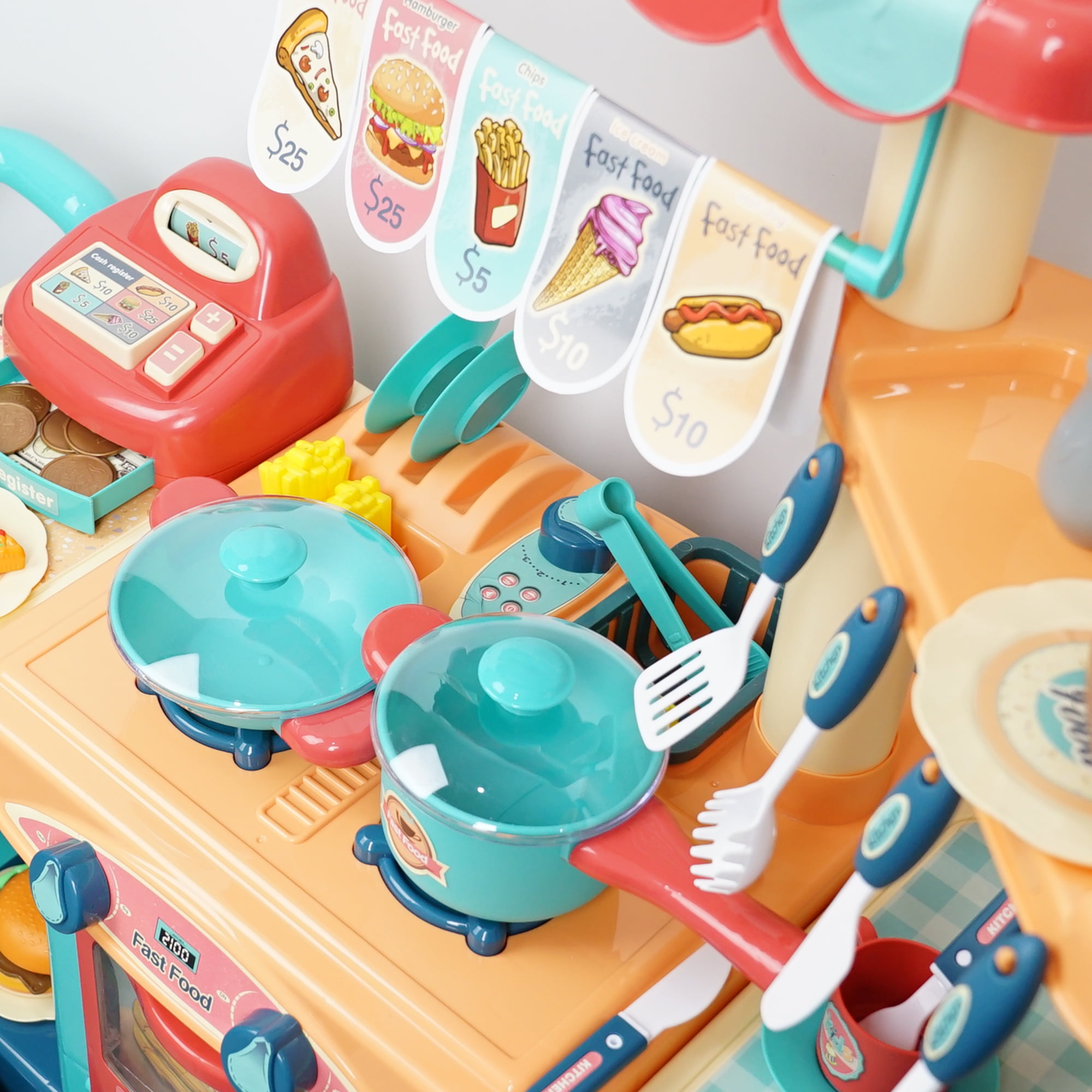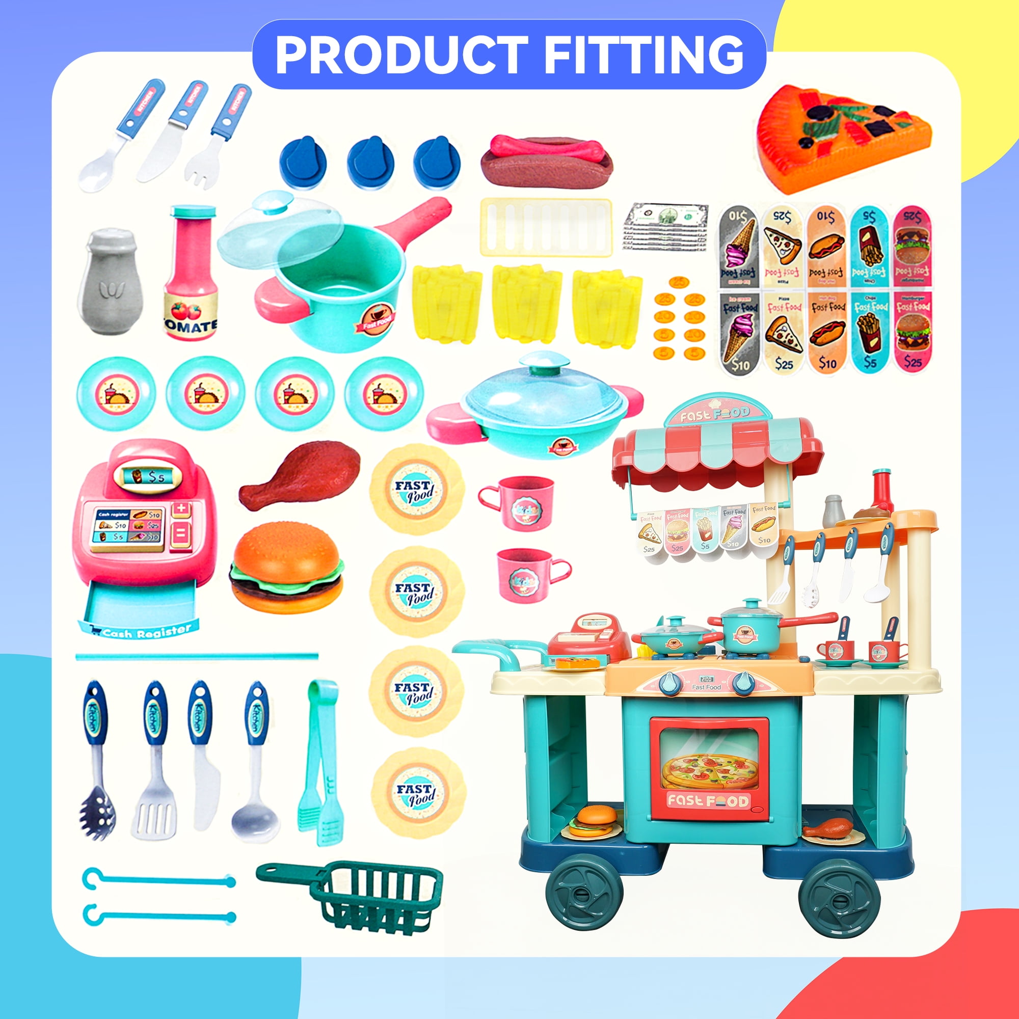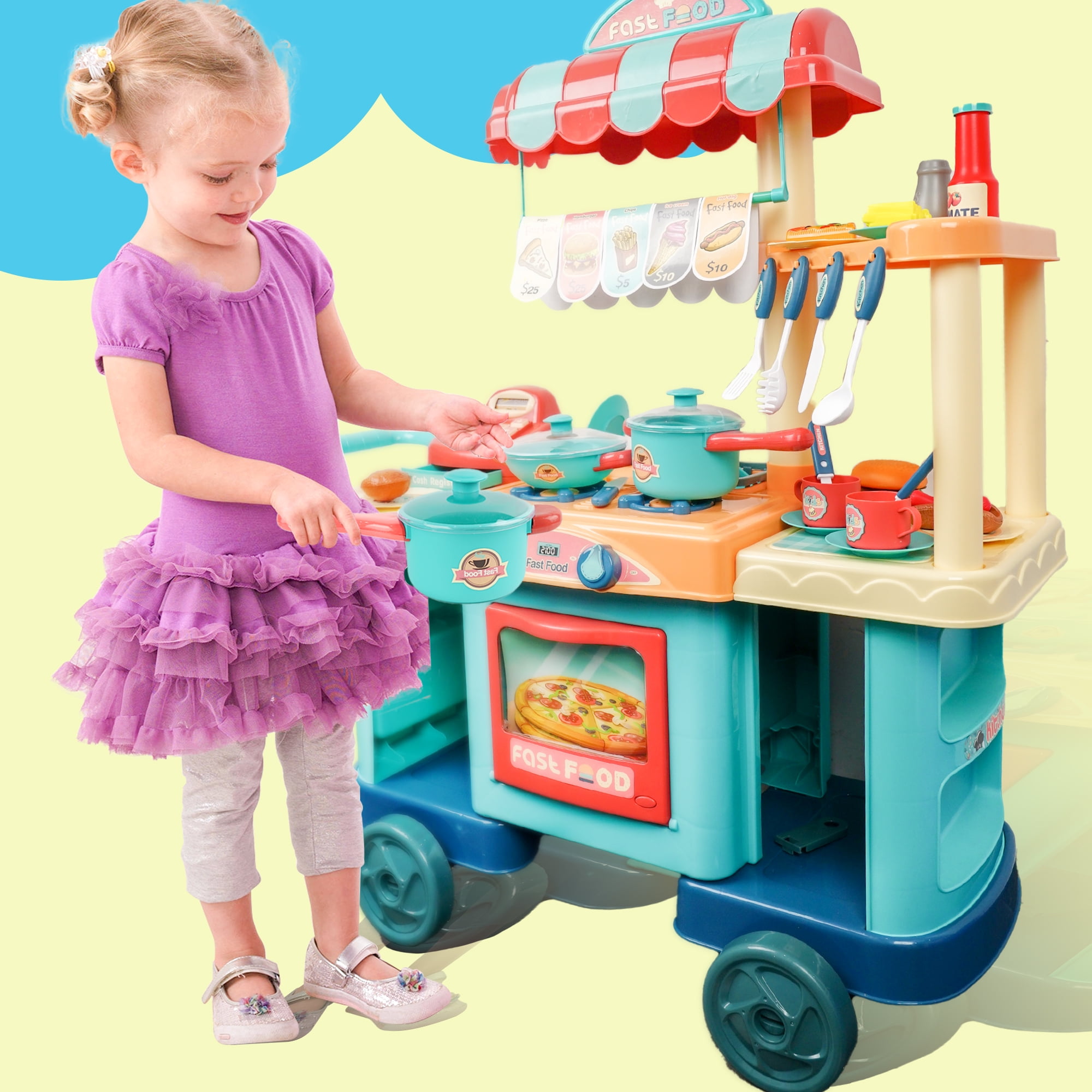 The YCFUN play kichen has a variety of interactive functions. The wheel of the food cart is moveable. The pretend play cashier has rotary button. There are various play foods, such as burgers, hotdogs, chips, and pizza. The play food set for kids kitchen provides hours of screen-free fun time for kids childs boys and girls. Enjoy the cooking fun with our kitchen set.