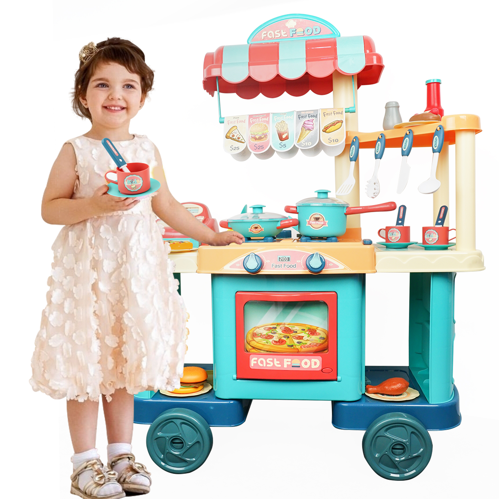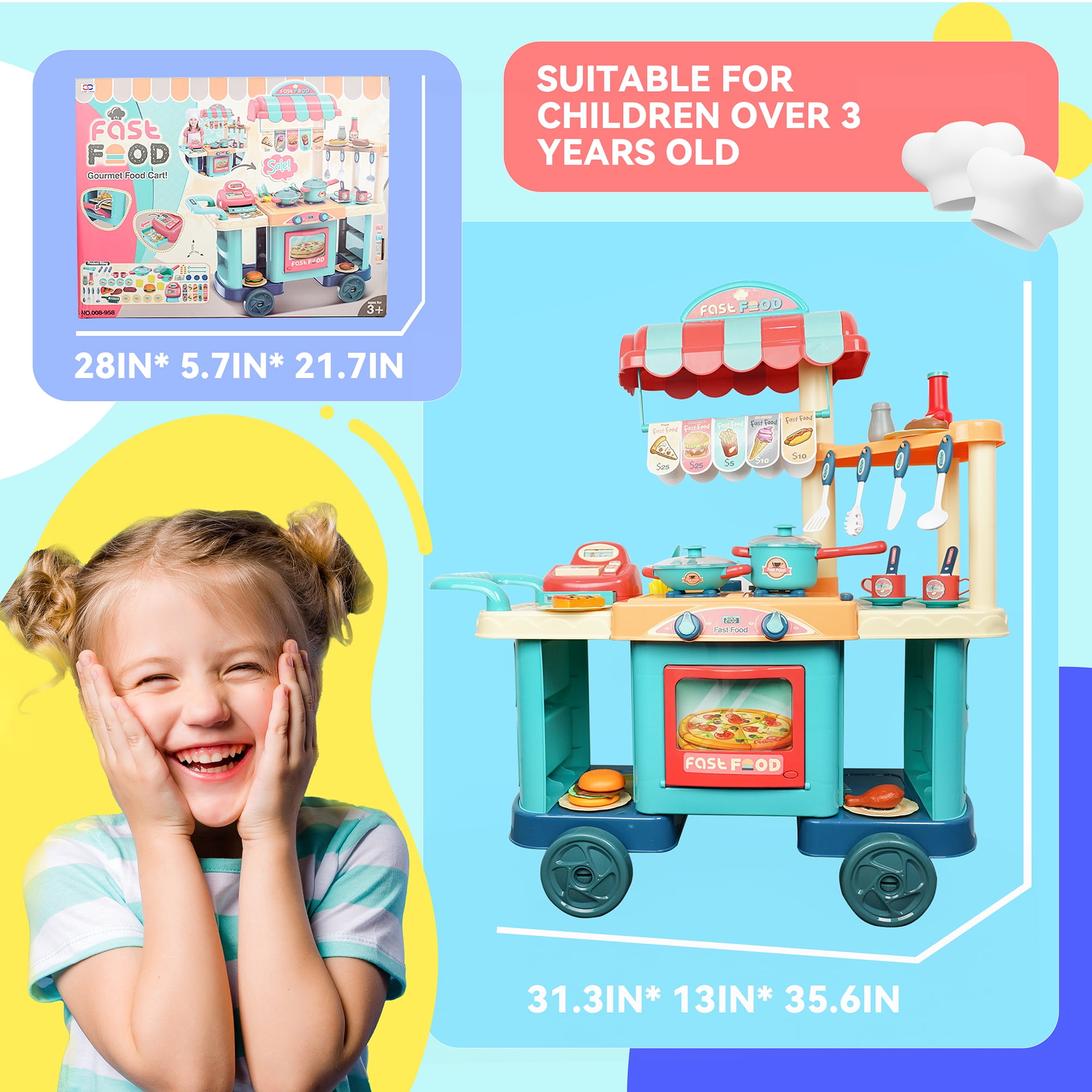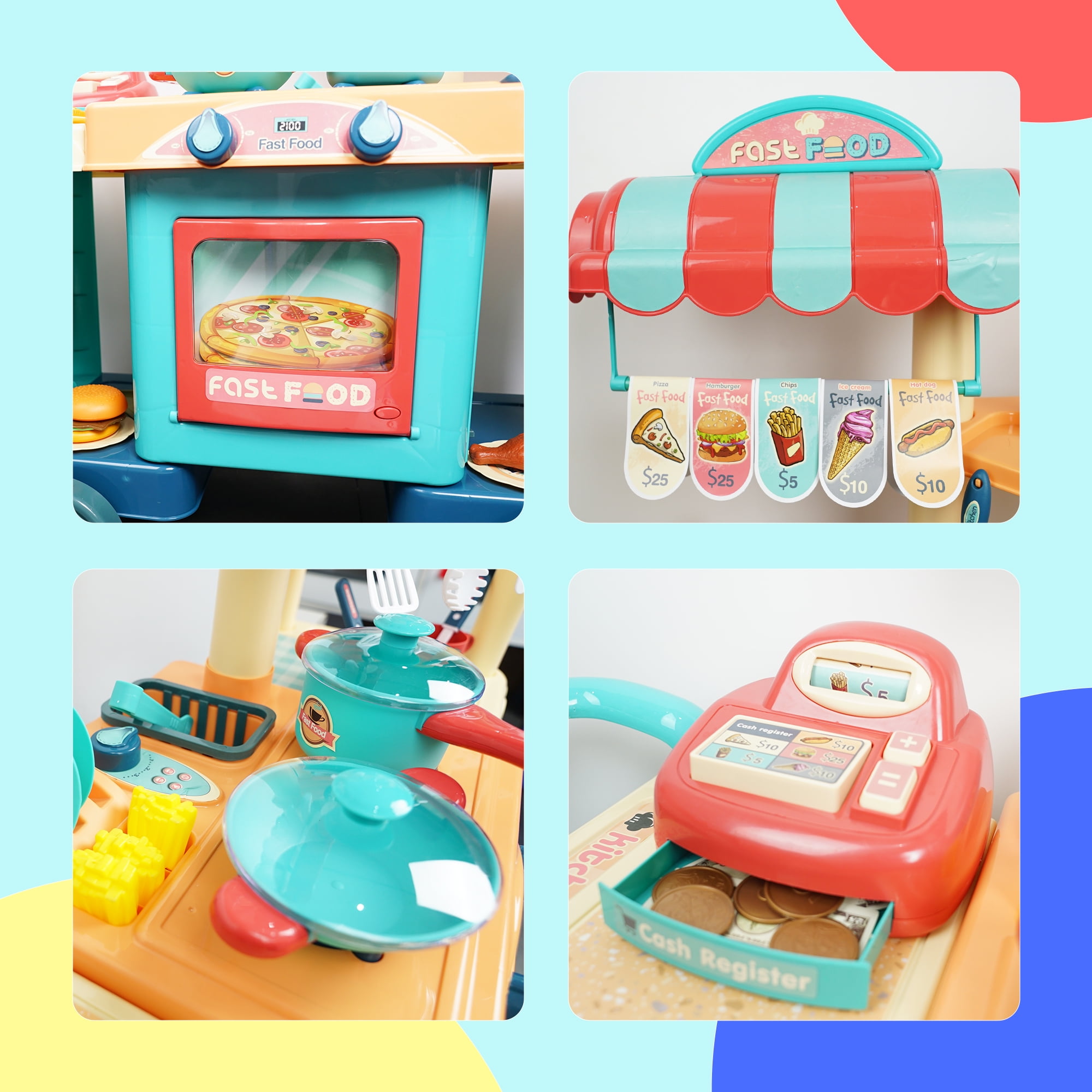 The YCFUN play kichen has a variety of interactive functions. The wheel of the food cart is moveable. The pretend play cashier has rotary button. There are various play foods, such as burgers, hotdogs, chips, and pizza. The play food set for kids kitchen provides hours of screen-free fun time for kids childs boys and girls. Enjoy the cooking fun with our kitchen set.
