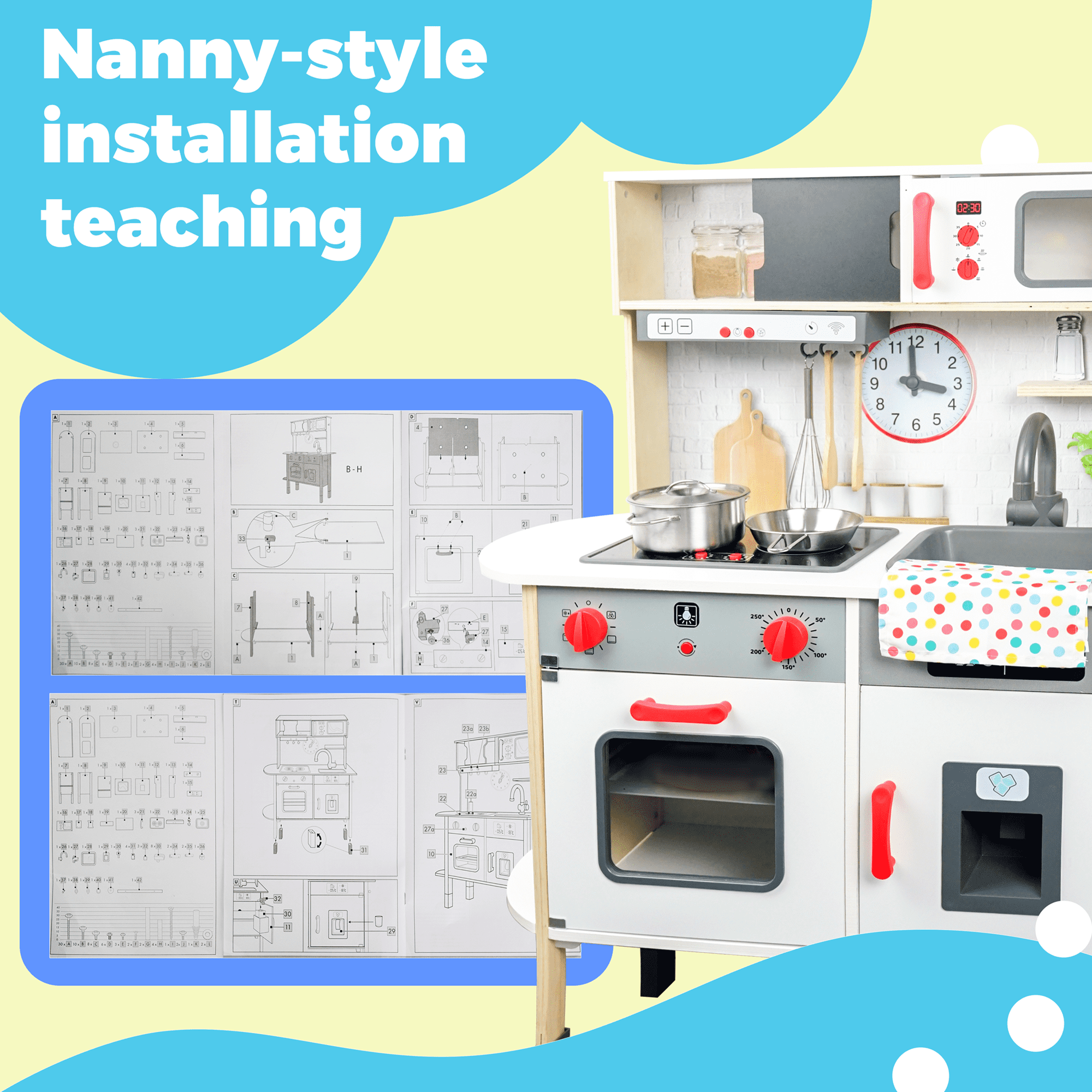 Vivid Play Kitchen – The lights above the stove can be turned on, the oven lid is openable, and the ice cubes will drop down when rotating the knob. Abundant Kids Kitchen Accessories – The accessories came with the kids play kitchen are frying pan, pot with universal lid, fork, and apron. Screen-free Enlightenment Toy – The play food set for kids kitchen will exercise kids hands-on ability when assmeble the kids toys. Please refer to the user manual and use the electric screwdriver to minimize your assembly time. Durable to Use – The wood Kitchen Play Set for childs kids 3-8 is made of natural solid wood on a smooth surface. Safe for kids to play with.