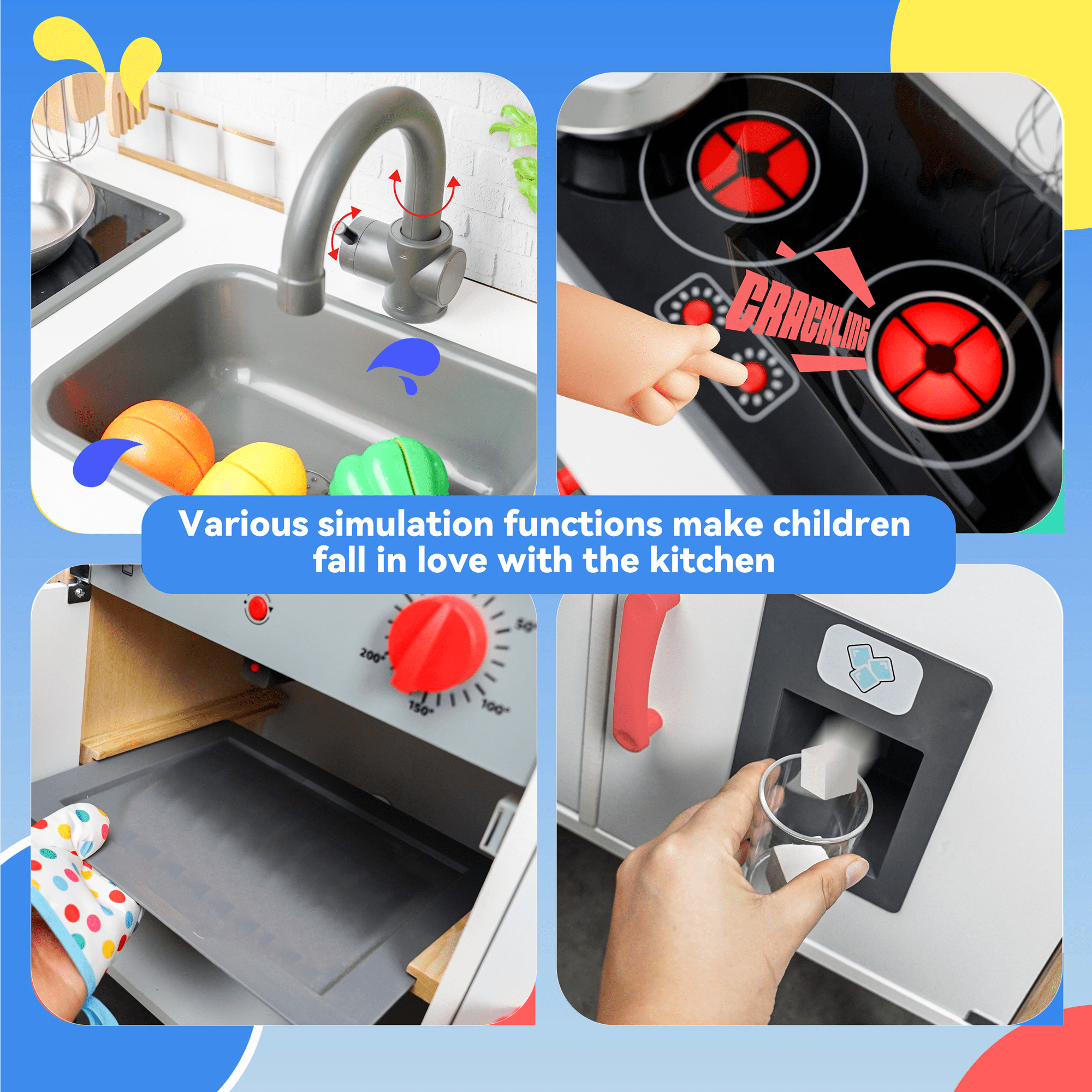Time to enjoy the pleasure of pretend play cooking games. YCFUN wooden kitchen play set is tailored for little boys and girls. The kitchen set for kids has mordern design and imitate the real kitchen set. The kids kitchen play set includes a stove, sink, oven, and ice machine. There’re many interative functions for the play food set for kids kitchen await kids’ exploration.
