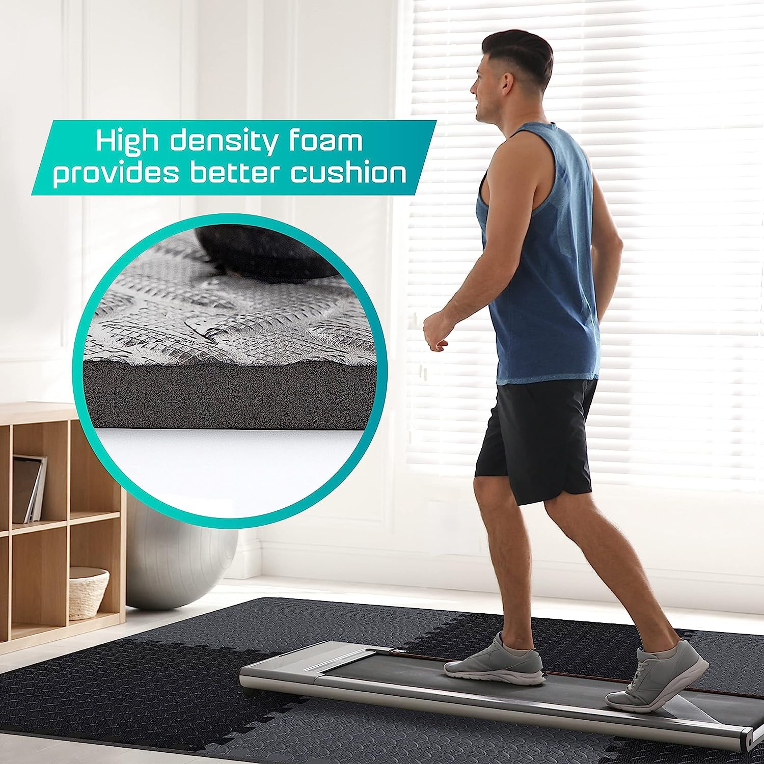 12 TILES COVER 48 SQ. FT: Include 6 Black tiles and 6 Gray tiles. Each tile measures 24”L x 24”W x 7/16”thick – Thick from the highest point of the texture DURABLE & NON SLIP: The non-skid textured & shock-absorbing surface provides a soft feeling when exercising on, best for comfortable workout area – a combination of high-density EVA foam mat & exercise mat for excellent support and cushion EASY 5 MINUTE ASSEMBLY: Lightweight puzzle pieces can be connected and disassembled easily in less than 5 minutes. Great for home gym, fitness gym, garages coverage or play areas PROTECTIVE WORKOUT FLOORING: Give yourself shock-absorbing comfort when doing Yoga, Pilates, or weightlifting Yes4All Interlocking Mats can also be used to create a soft & anti-slip floor while camping or playing EASY TO CLEAN: The water-resistant & noise-reducing design is easy to clean. The moisture-resistant technology & high-quality material make the mat easy to wash with soap & water 12 TILES COVER 48 SQ. FT: Include 12 tiles. Each tile measures 24”L x 24”W x 7/16”thick – Thick from the highest point of the texture DURABLE & NON SLIP: The non-skid textured & shock-absorbing surface provides a soft feeling when exercising on, best for comfortable workout area – a combination of high-density EVA foam mat & exercise mat for excellent support and cushion EASY 5 MINUTE ASSEMBLY: Lightweight puzzle pieces can be connected and disassembled easily in less than 5 minutes. Great for home gym, fitness gym, garages coverage or children’s play areas PROTECTIVE WORKOUT FLOORING: Give yourself shock-absorbing comfort when doing Yoga, Pilates, CrossFit or weightlifting. Yes4All Interlocking Mats can also be used to create a soft & anti-slip floor while camping or playing EASY TO CLEAN: The water-resistant & noise-reducing design is easy to clean. The moisture-resistant technology & high-quality material make the mat easy to wash with soap & water