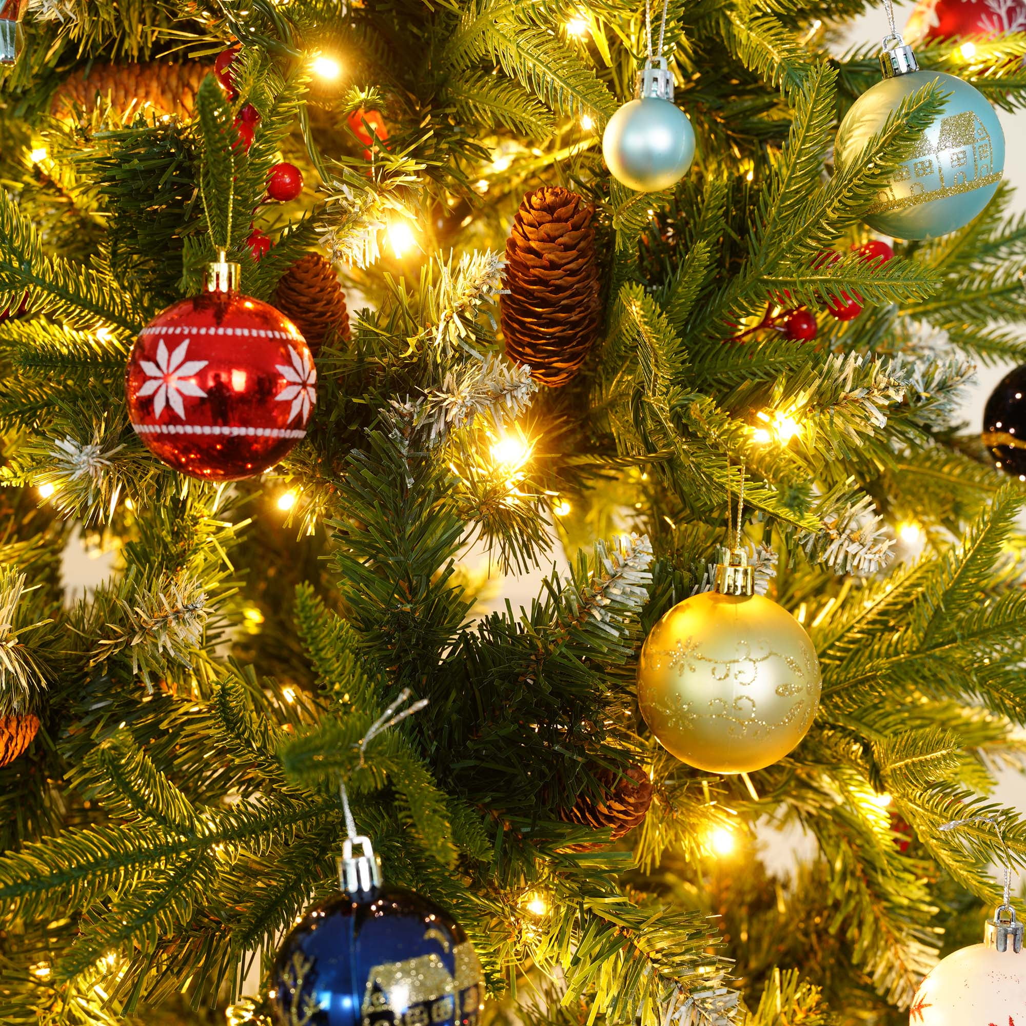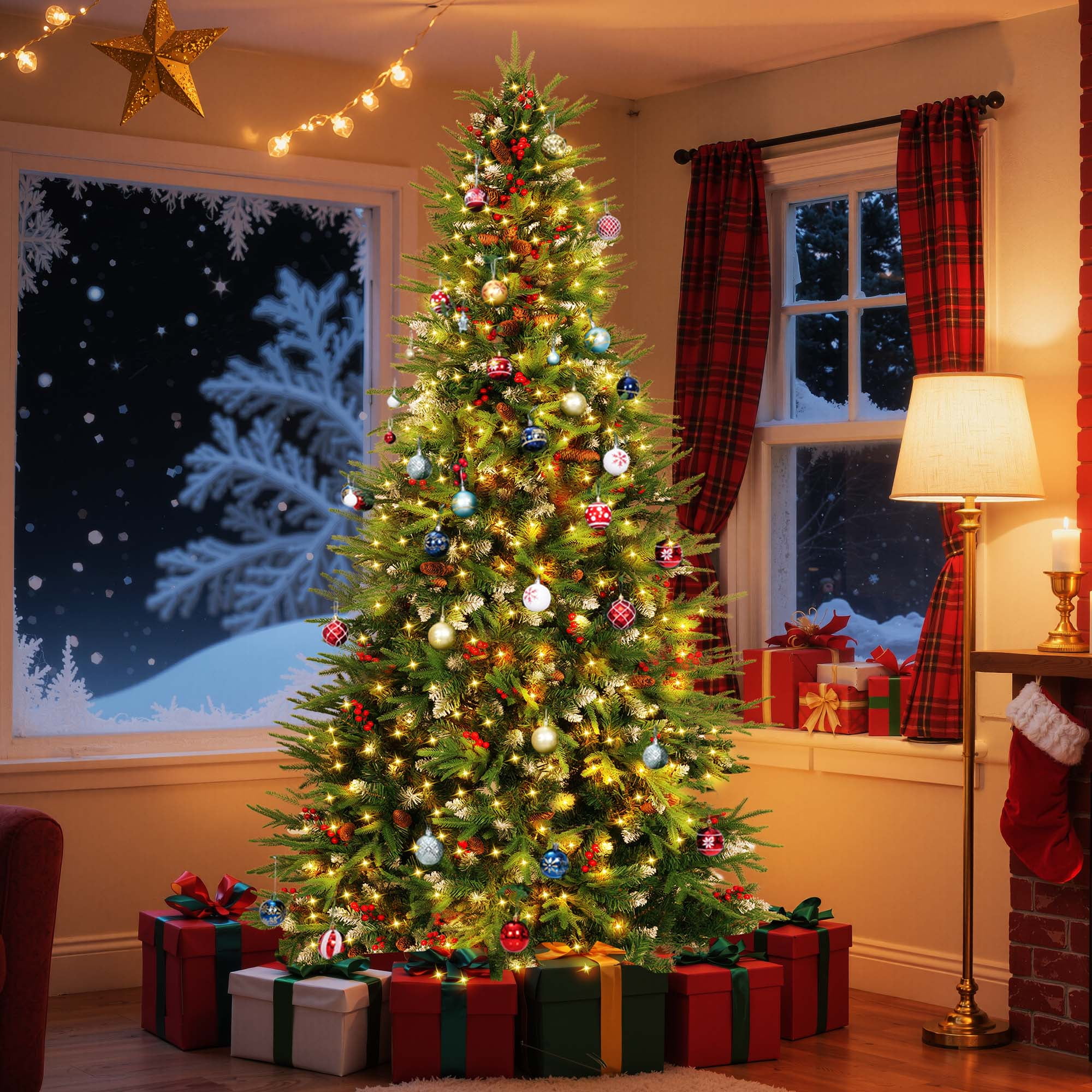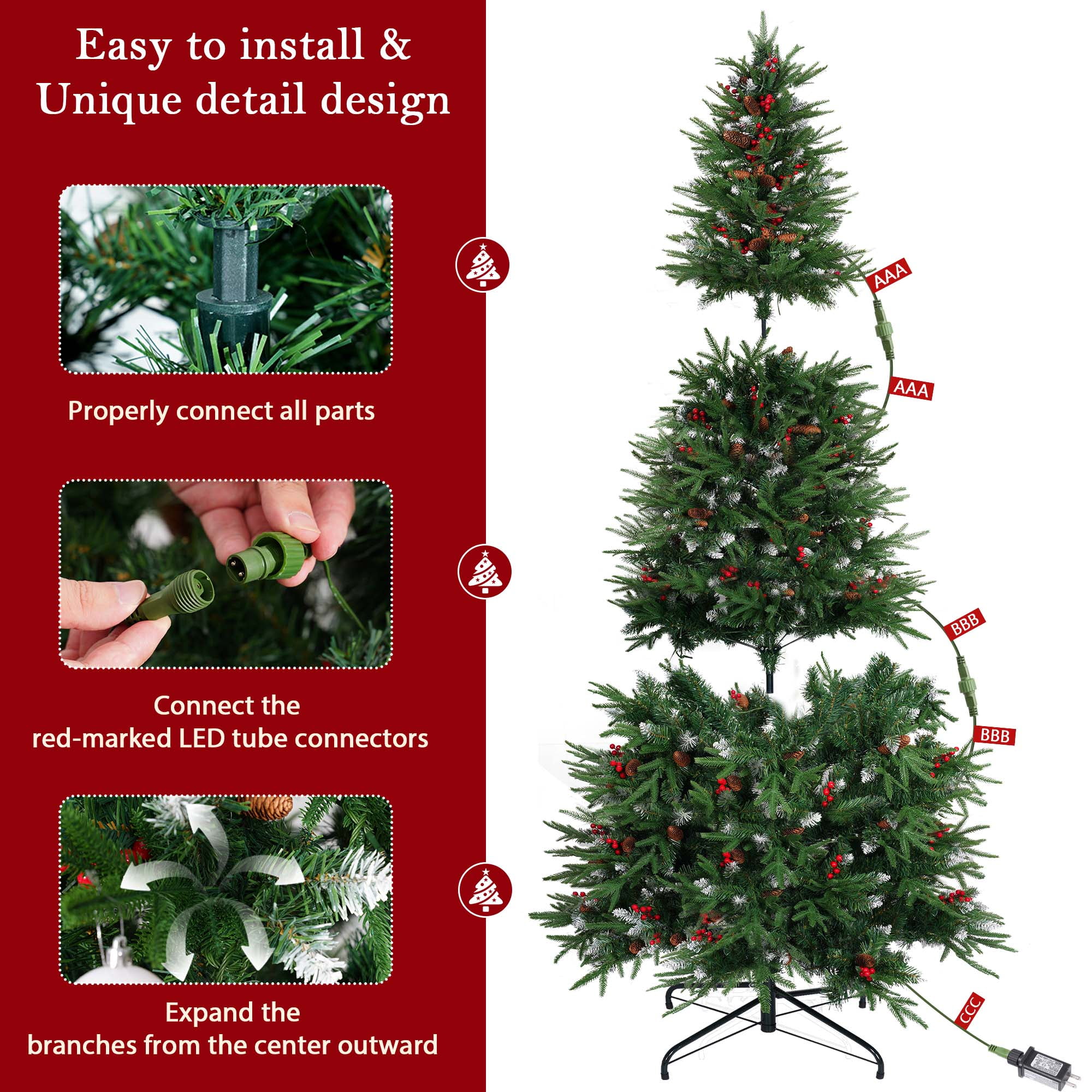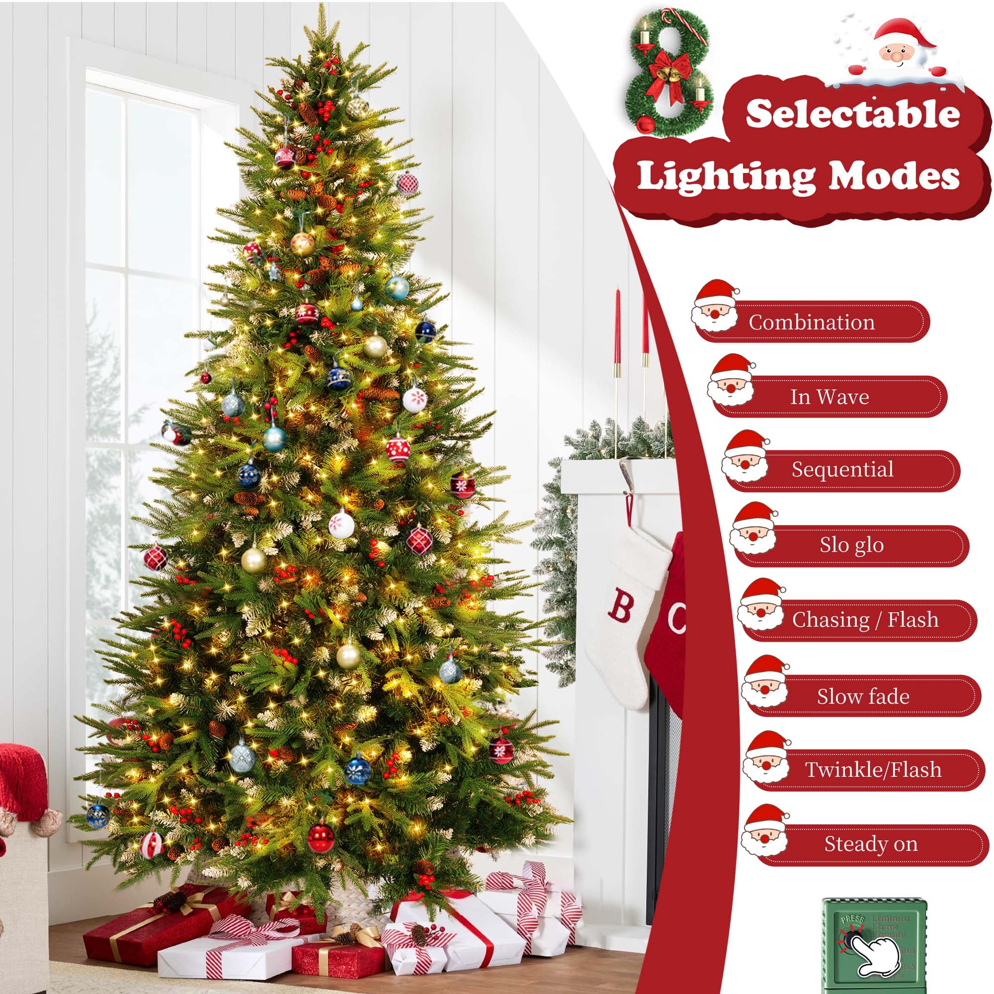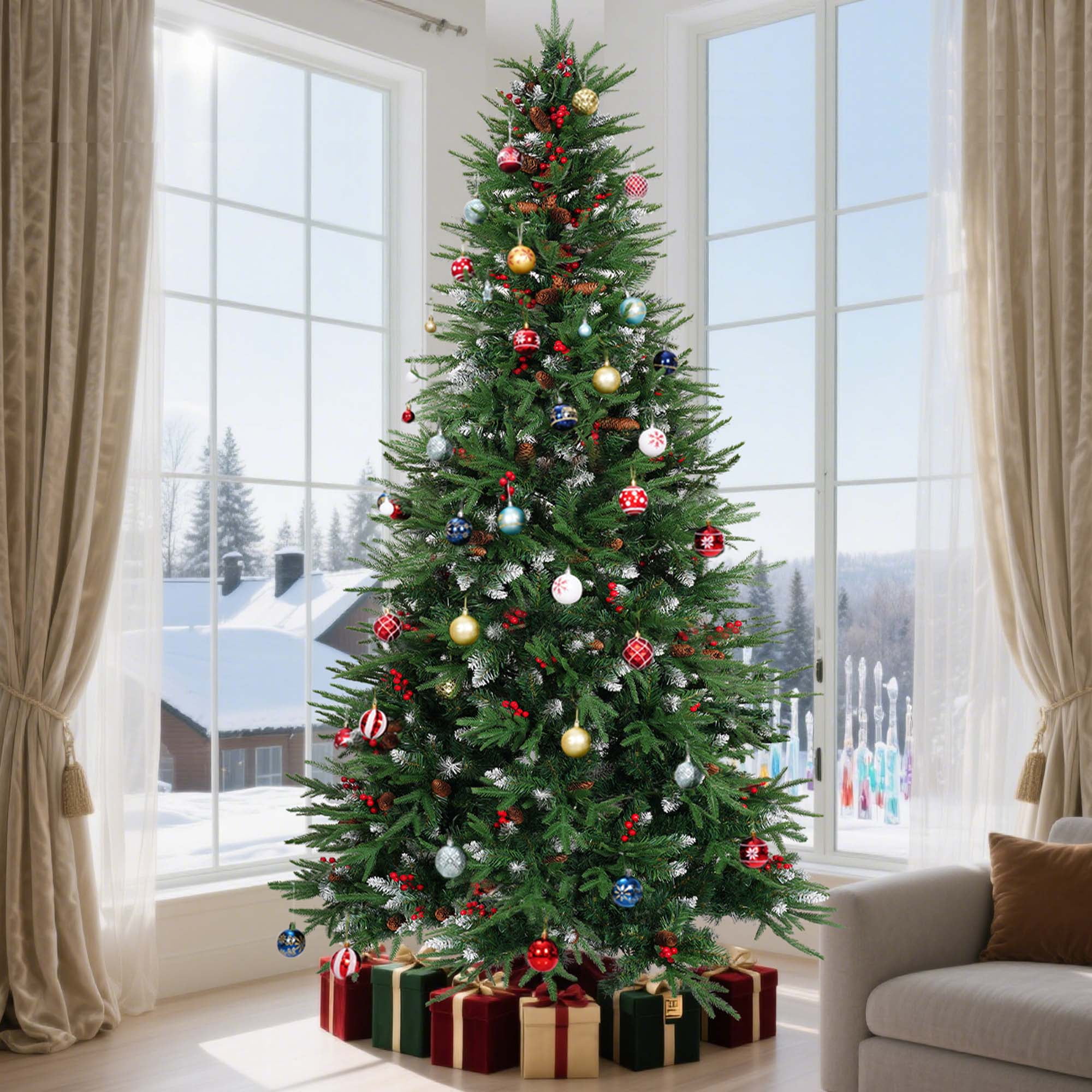 🎄【Pre-lit Christmas Tree】:Our Pre-Lit Christmas trees feature flexible PVC branches with flocking and are decorated with artificial frosted pine cones. Each tree comes with a soft tree skirt and pre-installed warm white incandescent lights, so you don’t need to install the lights yourself. The abundant branch design makes decorating easy and is ideal for displaying various Christmas ornaments. Whether for family gatherings or holiday celebrations, this Christmas tree will be a brilliant highlight in your home. 🎄【Versatile Pre-lit Options】:The Christmas tree offers 8 lighting modes: combination, wave, sequence, slow glow, chase/flash, slow fade, flash/flash, and steady on. You can switch between different effects to create the perfect atmosphere for any occasion. The warm white light adds a cozy touch to the holidays. The efficient LED bulbs are not only eco-friendly but also reduce energy consumption, making them suitable for multiple seasons. 🎄【Premium & Durable Materials】:The Christmas tree features needles made of high-quality, eco-friendly PVC, ensuring safety and a realistic appearance. The leaves are attractive, odorless, flame-retardant, durable, and recyclable. The branches are flocked, with abundant branches making decoration easier and more even, creating a natural look. Frosted pine cones are evenly distributed on the flocked branches, enhancing the natural appearance. 🎄【Easy Assembly & Fluffing】:You only need to connect the sections and base for easy assembly. The branches feature a pre-attached hinged design, which will automatically fall into place during installation. The 6-foot and 7.5-foot trees are divided into 3 sections, while the 9-foot tree is divided into 4 sections. Simply attach the base to the largest section of the tree, then connect the remaining sections and easily fluff the branches. 🎄【Three Size Options】:We offer three sizes of Christmas trees for you to choose from, each equipped with warm white lights and a white tree skirt, along with ample branches. Specifications are as follows: – 6-foot Christmas tree: 1200 branches, 300 LED lights, 80 frosted pine cones, 48-inch tree skirt. – 7.5-foot Christmas tree: 1800 branches, 450 LED lights, 90 frosted pine cones, 55-inch tree skirt. – 9-foot Christmas tree: 2100 branches, 700 LED lights, 100 frosted pine cones, 63-inch tree skirt. Choose the height that best fits your space and decorating needs to create the perfect festive atmosphere.
