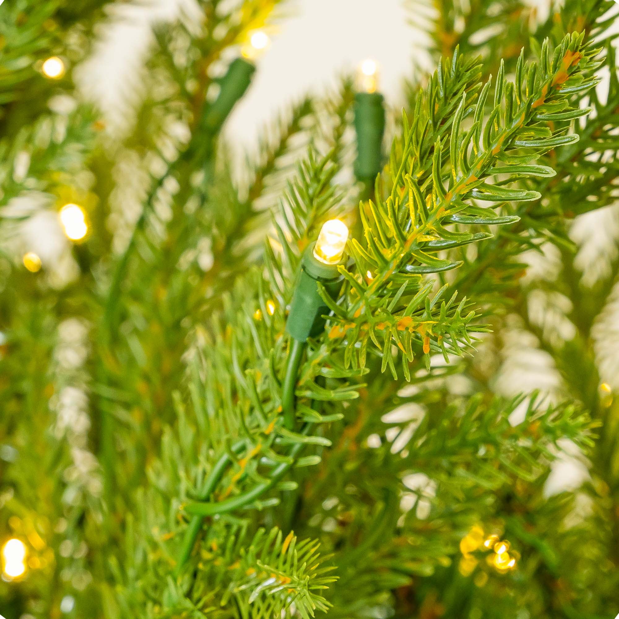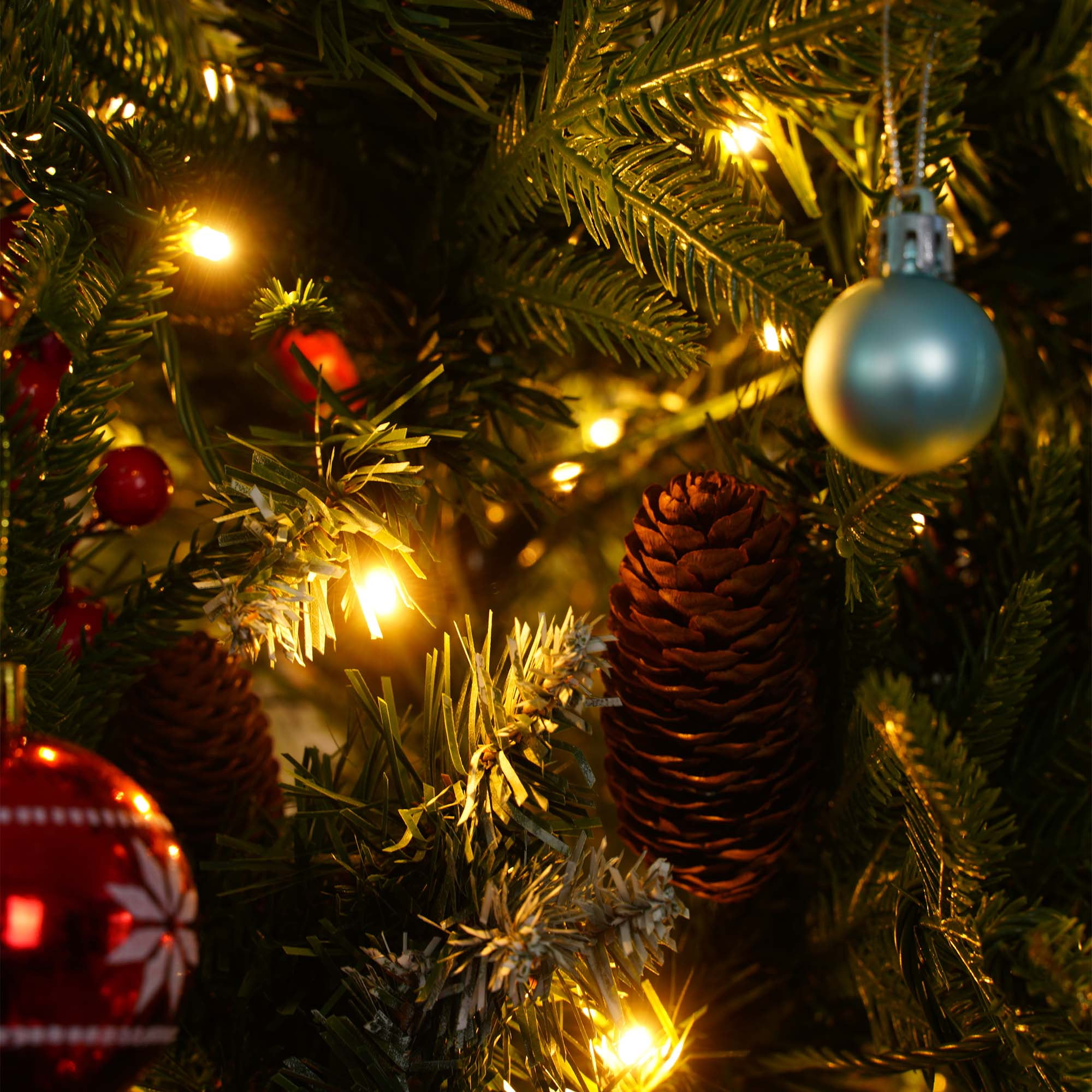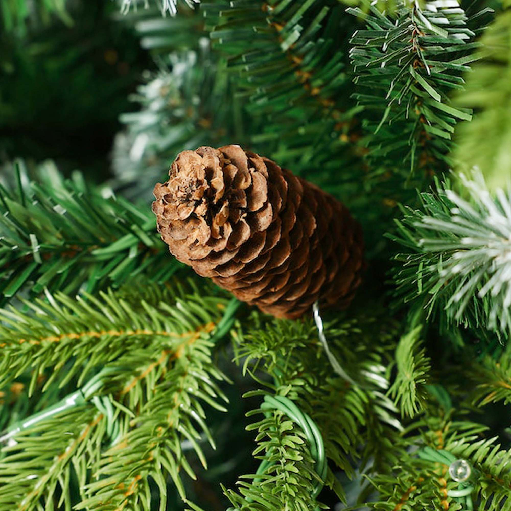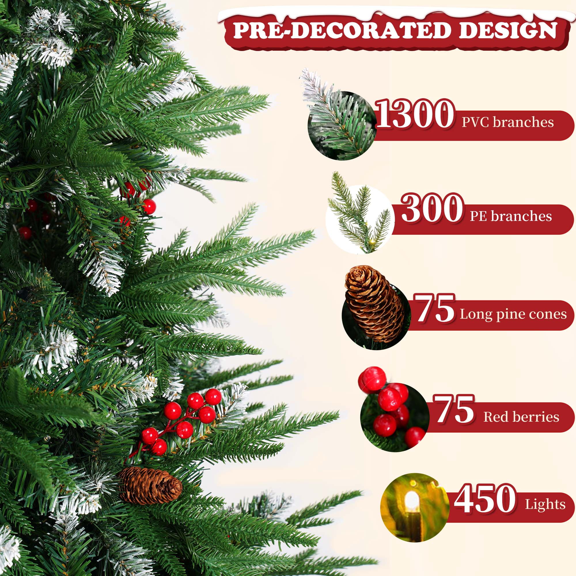 Yexmas flocked green Christmas tree features natural frosted pinecones and warm white lights, adding a cozy glow to the holiday season. We offer three different sizes for you to choose from. Each LED lights christmas trees is designed with abundant branches, providing ample decorating space and giving a fuller appearance. The prelit christmas tree’s durable metal hinge design allows for easy assembly. The included white faux fur tree skirt not only adds a touch of luxury but also effectively protects the floor from debris. Whether for family gatherings or holiday celebrations, this Christmas tree will bring the perfect festive atmosphere to your space.