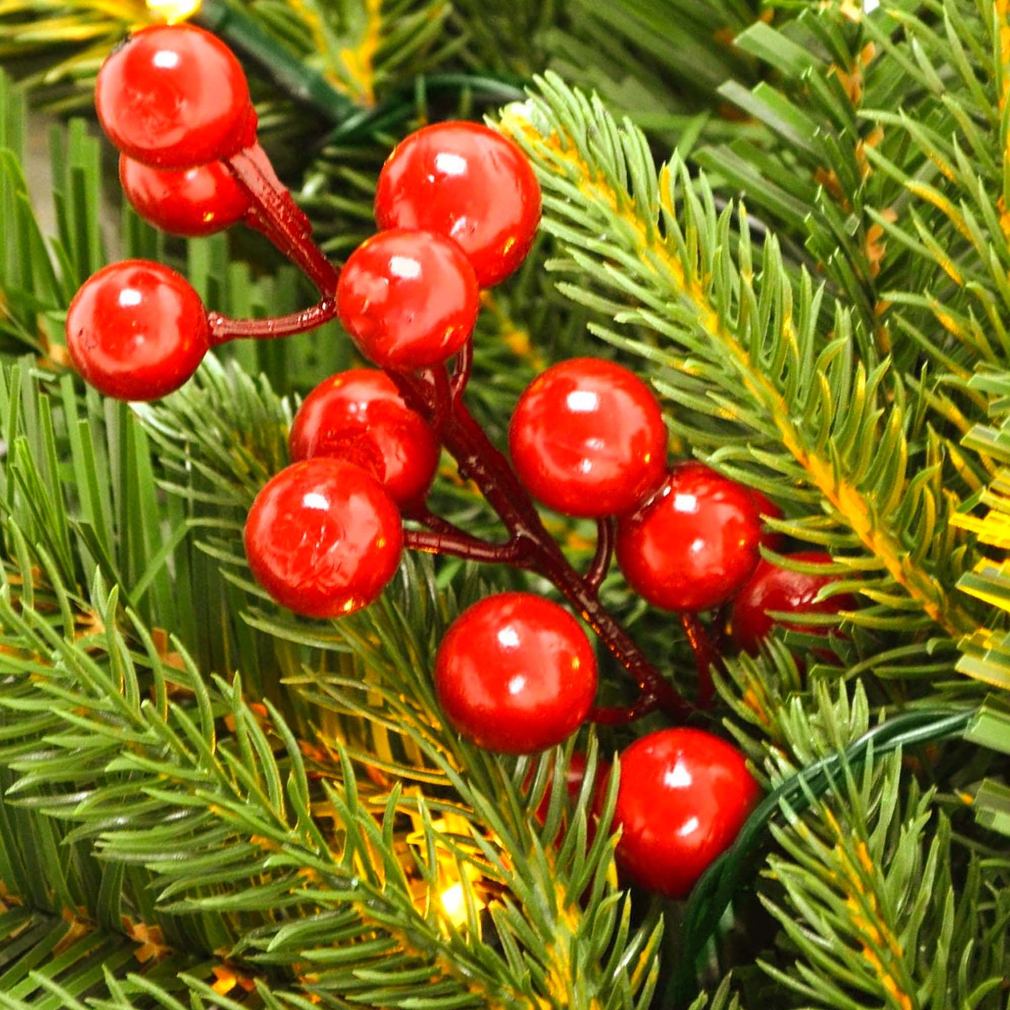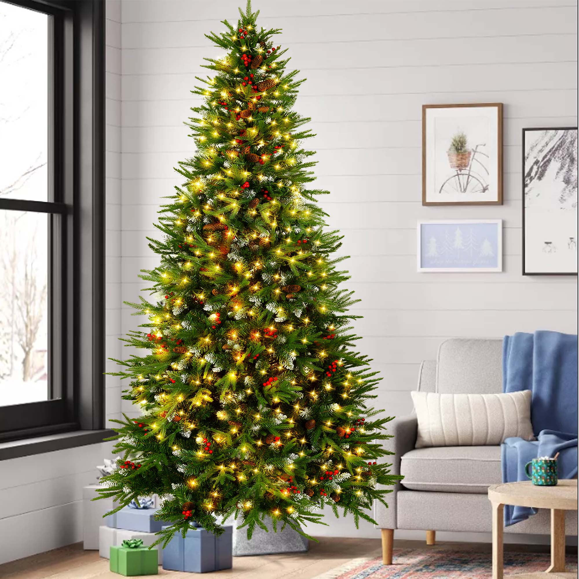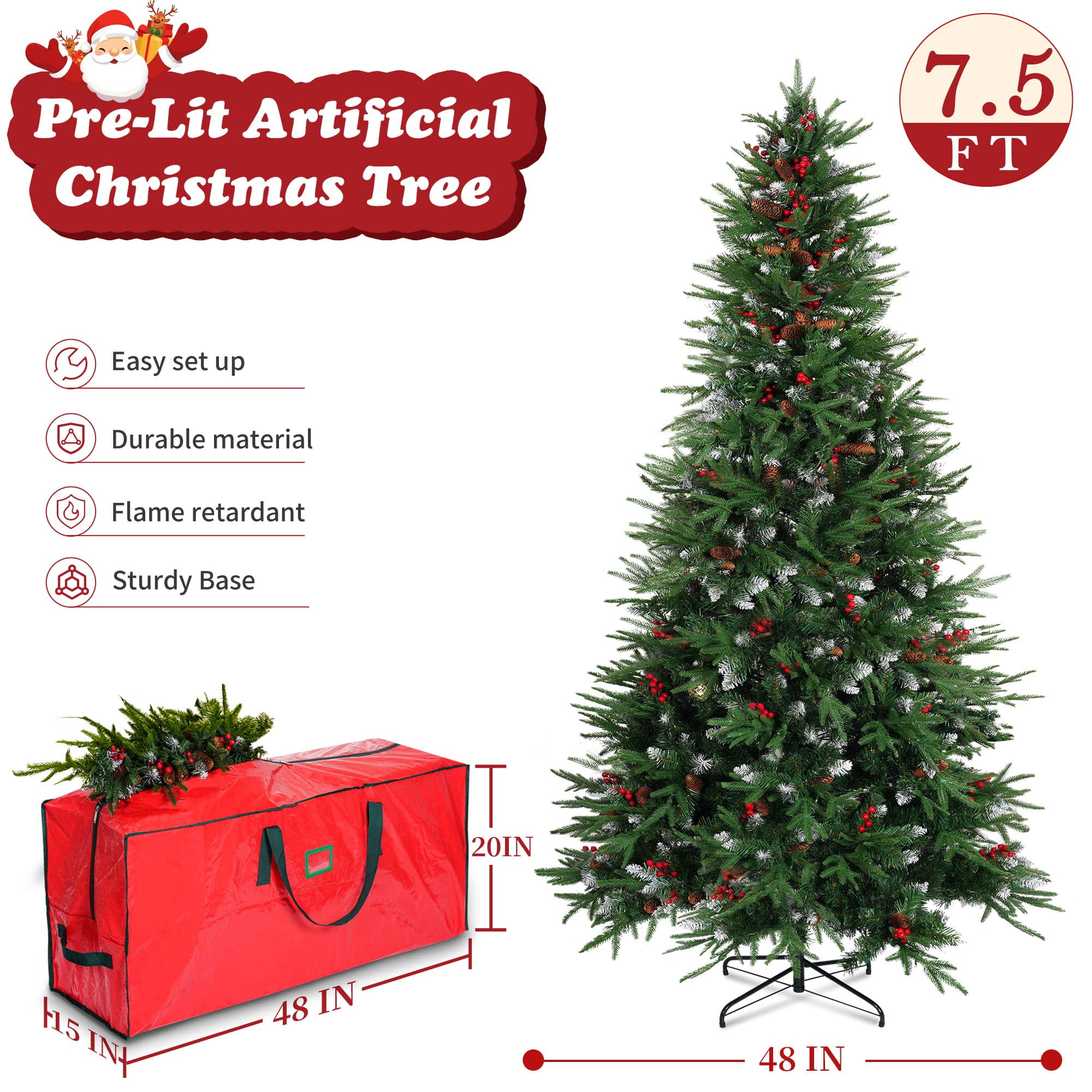 Yexmas 7.5ft Pre-Lit Artificial Christmas Trees,Green Xmas Tree with Large Christmas Tree Storage Bag,Pinecones, Berries, Realistic Artificial Christmas Trees for Home, Office, Party Decoration