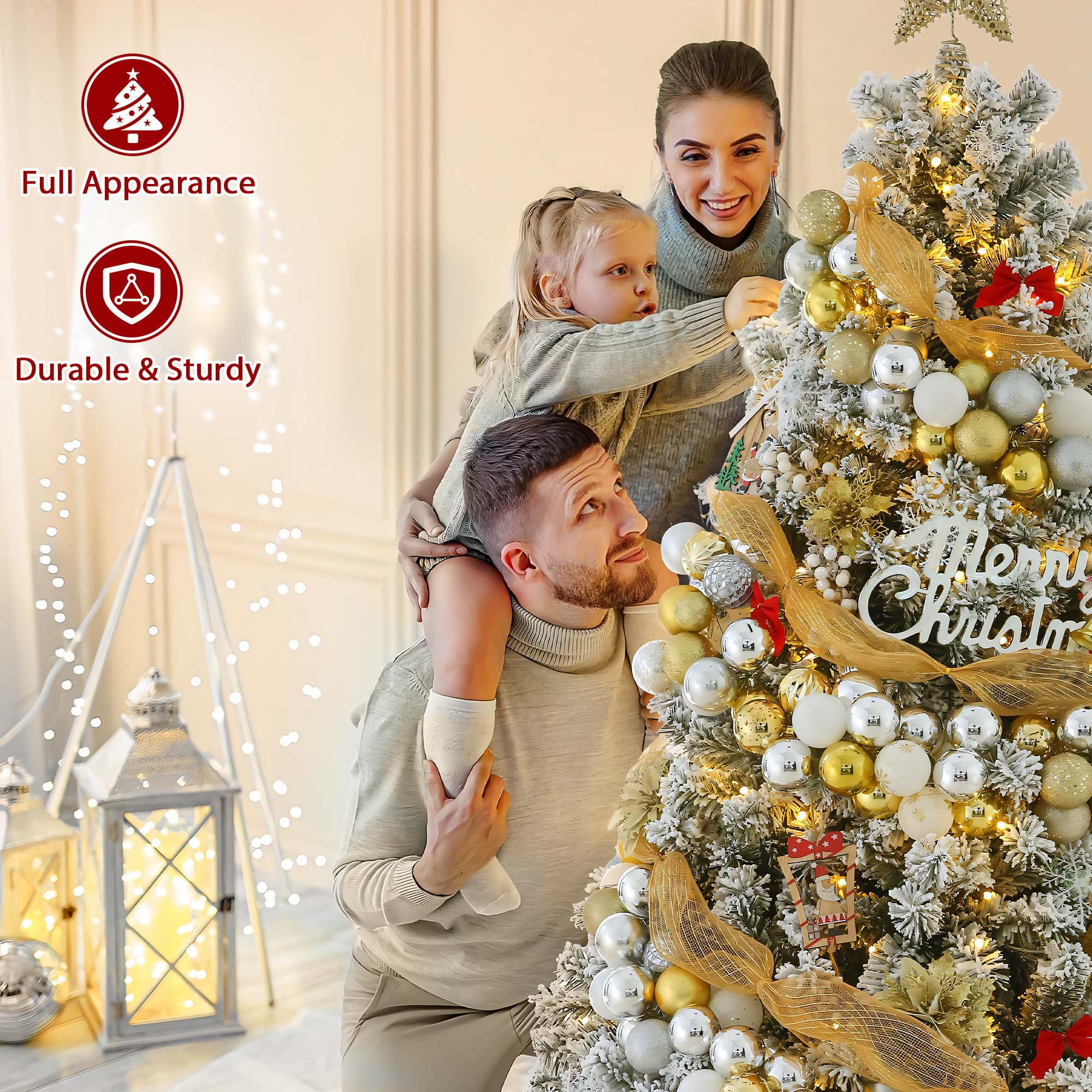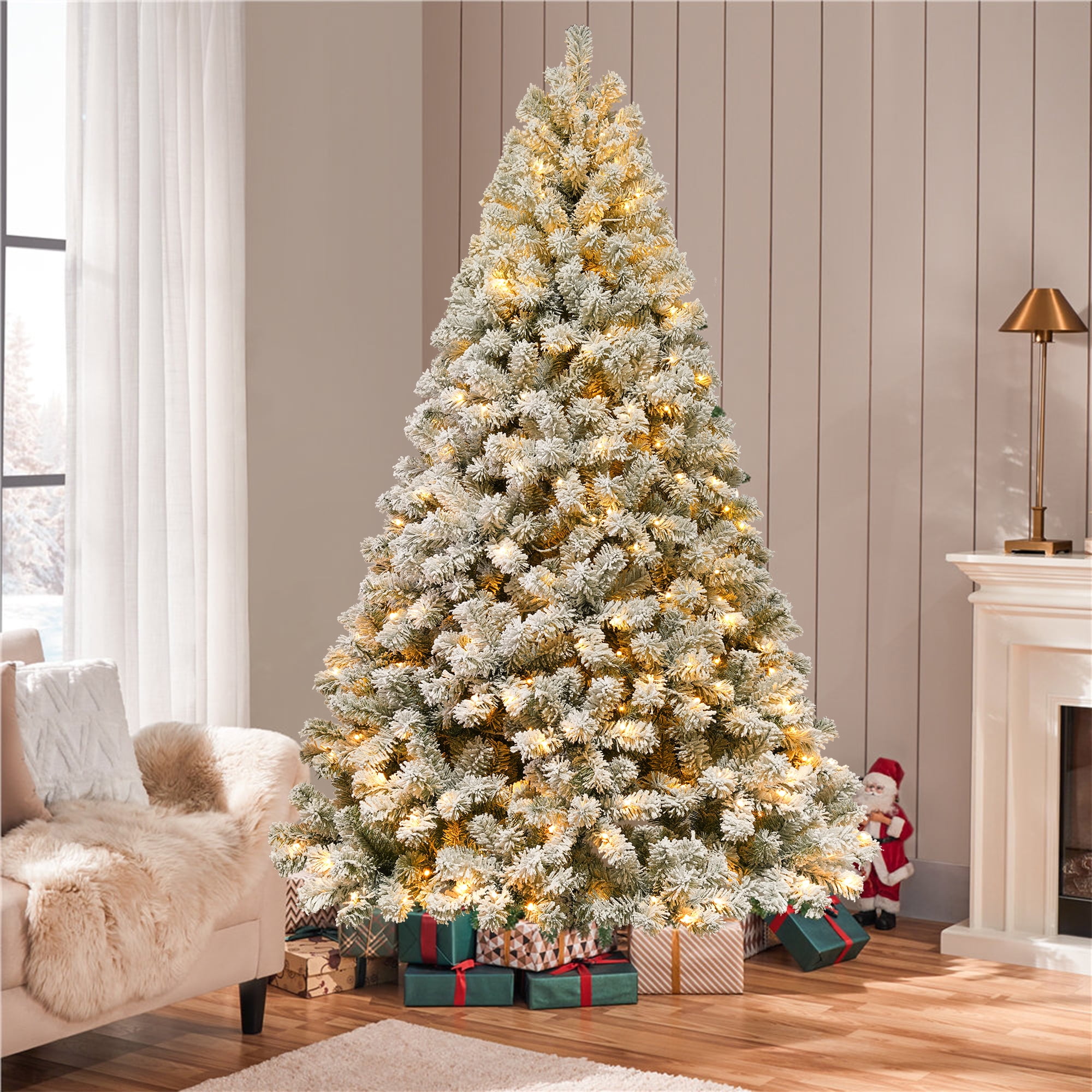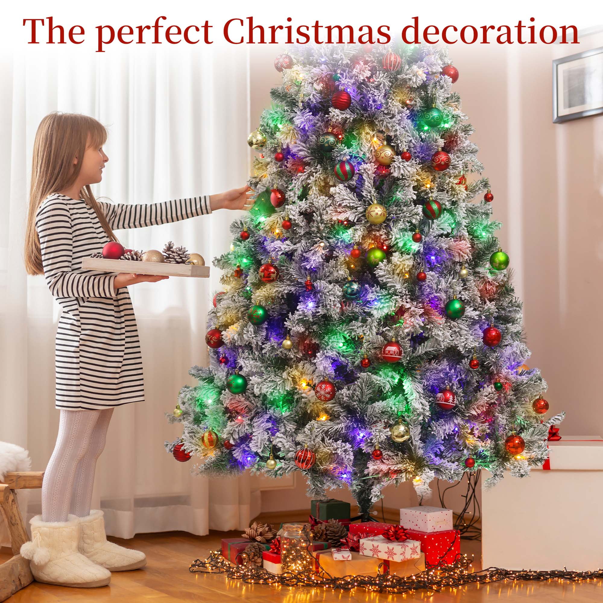 🎄【Snow Flocked & Realistic Appearance】:The pre-lit artificial Christmas tree with snow flocking creates a snow-covered effect, enhancing the winter and holiday ambiance. Paired with warm white lights, it adds a cozy and inviting holiday glow. We also include a high-quality white Christmas tree skirt, which complements the snow-flocked tree, enhancing the overall decoration while providing practical protection and organization. 🎄【Pre-Lit with Warm Lights】:Our Christmas prelit tree comes equipped with ample warm white lights, so you don’t need to add extra lighting or install strings yourself. The tree is pre-lit with 8 different lighting modes, allowing you to easily switch between them with just the press of a button, adding a cozy festive glow. 🎄【Premium Quality Material】:The Christmas tree is made with durable metal hinges and flame-retardant PVC branches, supported by a sturdy X-shaped metal stand and reinforced base for added stability. The included soft faux fur tree skirt adds warmth and comfort to the base of the tree. Enjoy the beauty of this Christmas tree throughout the upcoming holiday season! 🎄【Straightforward Assembly】:You only need to connect the sections and base for easy assembly. The branches feature a pre-attached hinged design, which will automatically fall into place during installation. The 6-foot and 7.5-foot trees are divided into 3 sections, while the 9-foot tree is divided into 4 sections. Simply attach the base to the largest section of the tree, then connect the remaining sections and easily fluff the branches. 🎄【Three Size Options】:We offer three sizes of Christmas trees for you to choose from, each equipped with warm white lights and a white tree skirt, along with ample branches. Specifications are as follows: – 6-foot tree: 1000 branches, 300 LED lights, with a 48-inch tree skirt. – 7.5-foot tree: 1500 branches, 450 LED lights, with a 55-inch tree skirt. – 9-foot tree: 1800 branches, 700 LED lights, with a 63-inch tree skirt. Choose the height that best fits your space and decorating needs to create the perfect festive atmosphere.