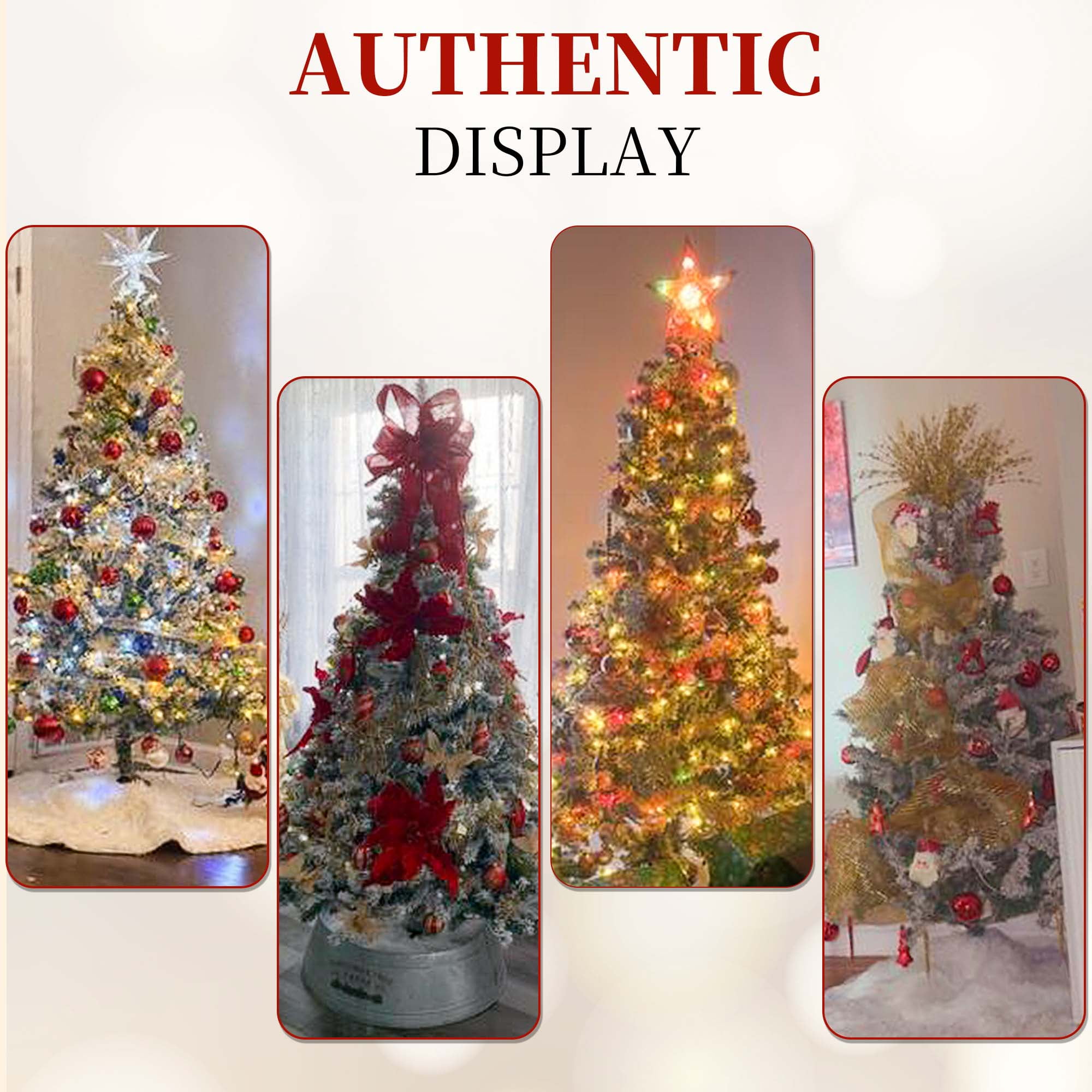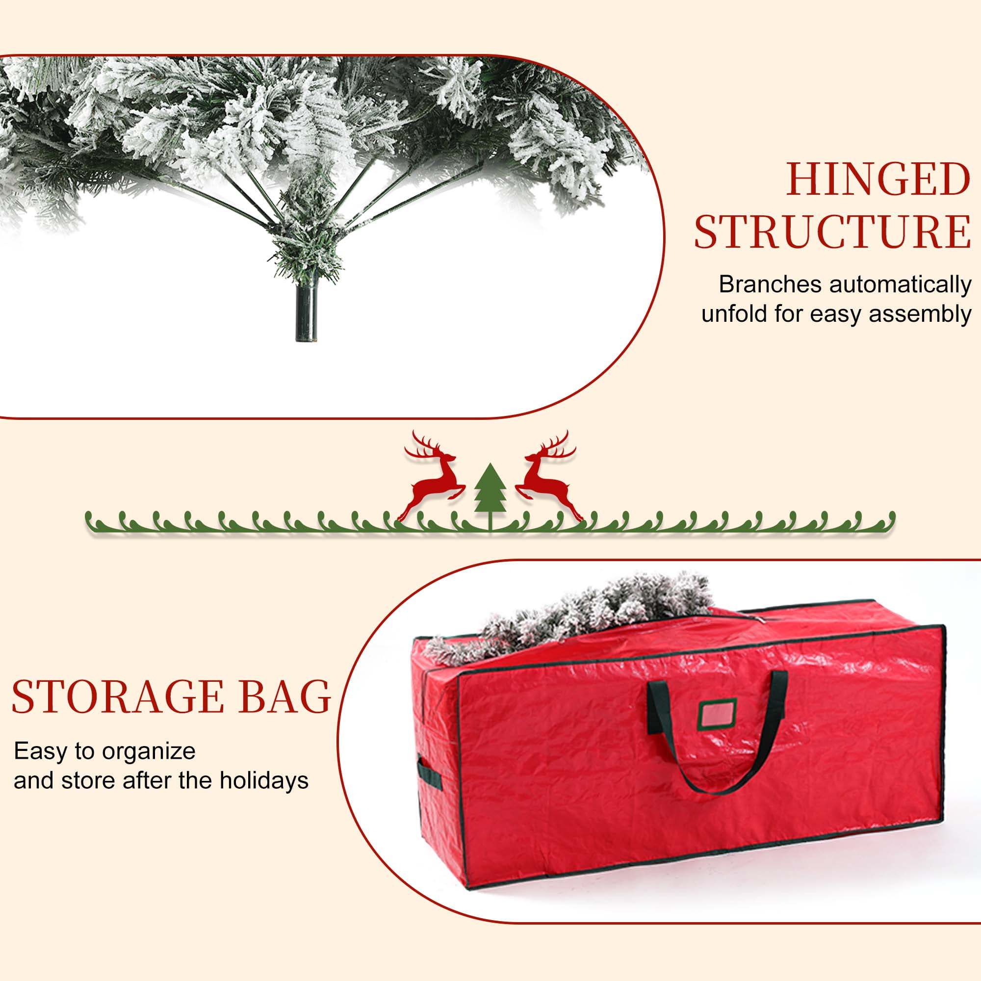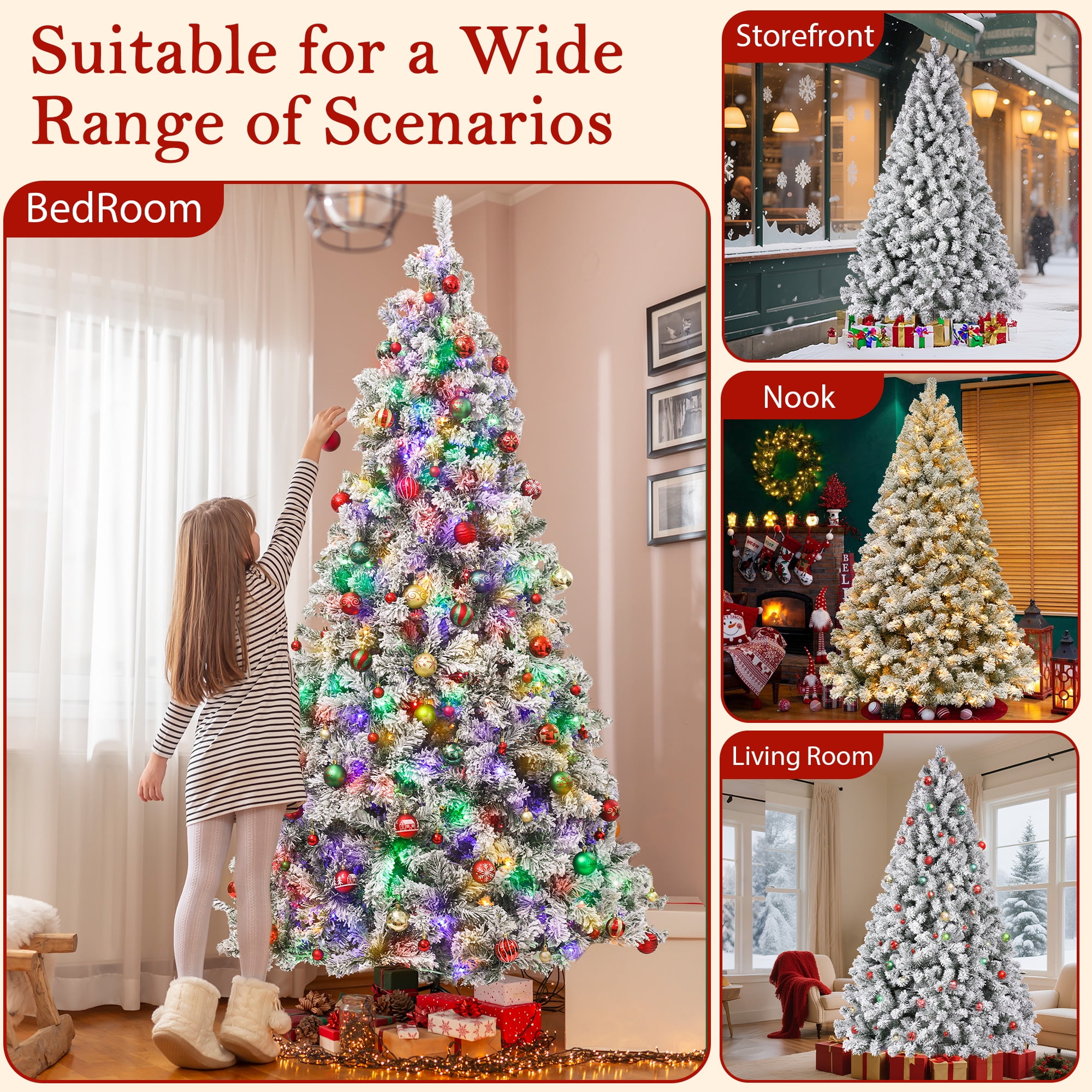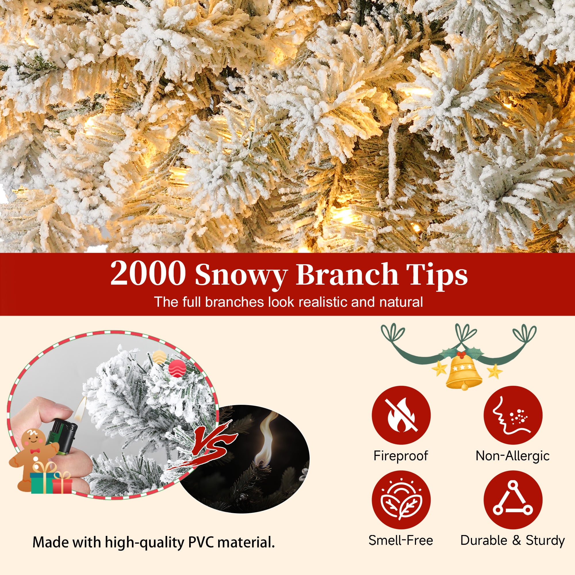 🎄【Snow Flocked & Realistic Appearance】:The pre-lit artificial Christmas tree with snow flocking creates a snow-covered effect, enhancing the winter and holiday ambiance. Paired with warm white lights, it adds a cozy and inviting holiday glow. We also include a high-quality white Christmas tree skirt, which complements the snow-flocked tree, enhancing the overall decoration while providing practical protection and organization. 🎄【Pre-Lit with Warm Lights】:Our Christmas prelit tree comes equipped with ample warm white lights, so you don’t need to add extra lighting or install strings yourself. The tree is pre-lit with 8 different lighting modes, allowing you to easily switch between them with just the press of a button, adding a cozy festive glow. 🎄【Premium Quality Material】:The Christmas tree is made with durable metal hinges and flame-retardant PVC branches, supported by a sturdy X-shaped metal stand and reinforced base for added stability. The included soft faux fur tree skirt adds warmth and comfort to the base of the tree. Enjoy the beauty of this Christmas tree throughout the upcoming holiday season! 🎄【Straightforward Assembly】:You only need to connect the sections and base for easy assembly. The branches feature a pre-attached hinged design, which will automatically fall into place during installation. The 6-foot and 7.5-foot trees are divided into 3 sections, while the 9-foot tree is divided into 4 sections. Simply attach the base to the largest section of the tree, then connect the remaining sections and easily fluff the branches. 🎄【Three Size Options】:We offer three sizes of Christmas trees for you to choose from, each equipped with warm white lights and a white tree skirt, along with ample branches. Specifications are as follows: – 6-foot tree: 1000 branches, 300 LED lights, with a 48-inch tree skirt. – 7.5-foot tree: 1500 branches, 450 LED lights, with a 55-inch tree skirt. – 9-foot tree: 1800 branches, 700 LED lights, with a 63-inch tree skirt. Choose the height that best fits your space and decorating needs to create the perfect festive atmosphere.