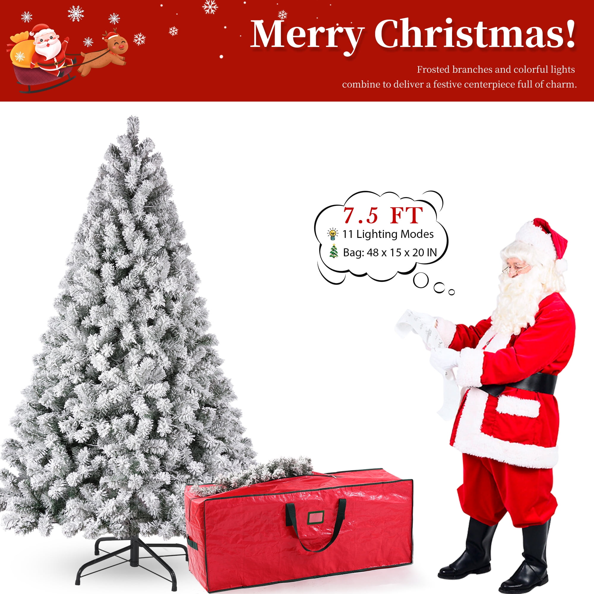 Yexmas 7.5FT Pre-Lit Snow Flocked Christmas Tree,Artificial White Christmas Tree with Large Christmas Tree Storage Bag,11 Modes Warm White & Multicolor LED Lights for Xmas Decoration