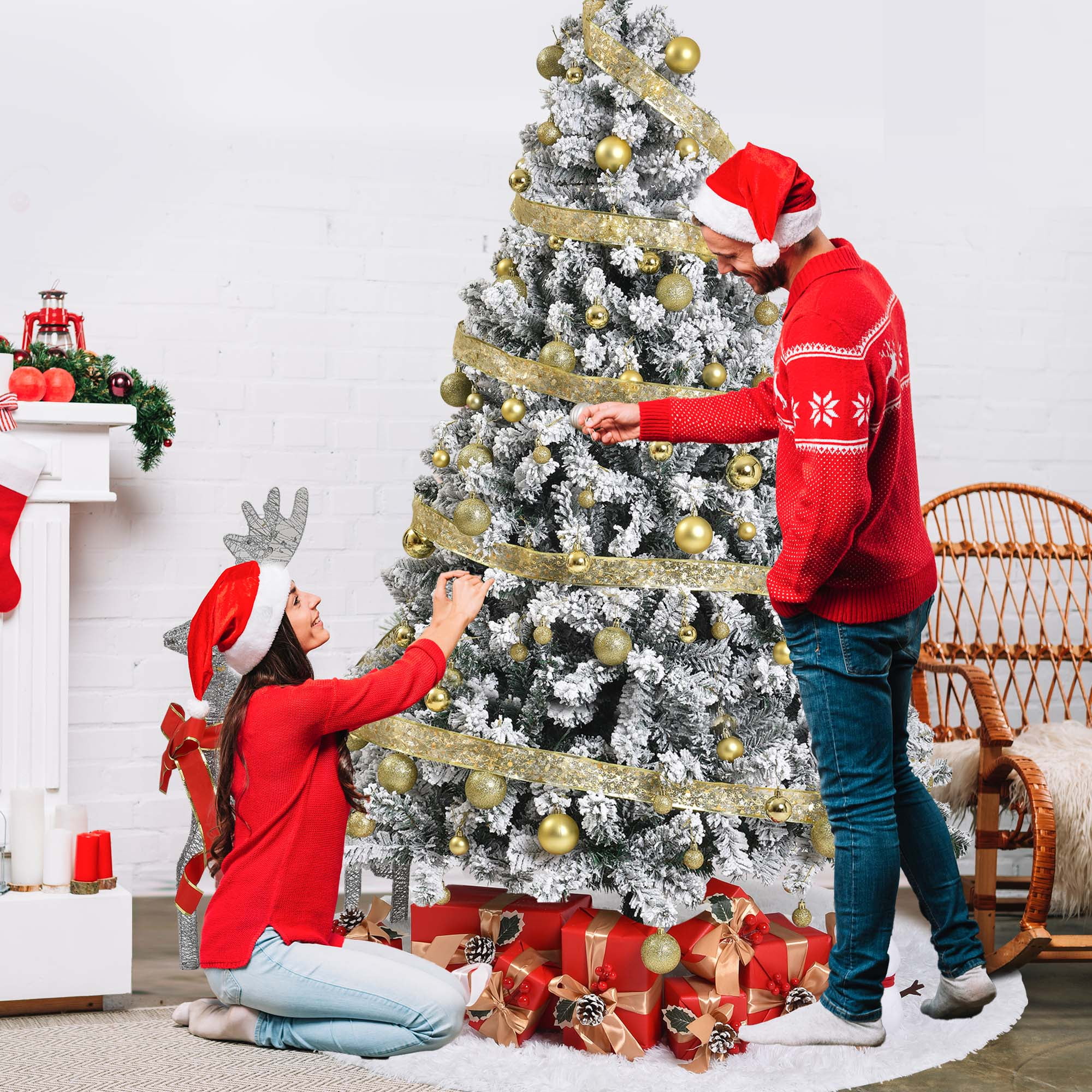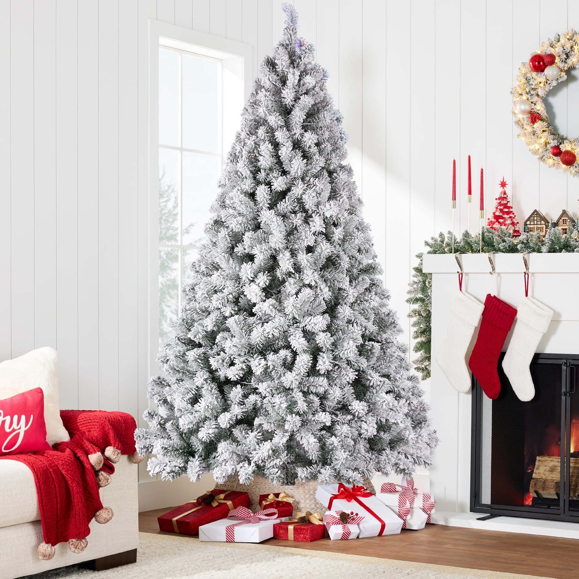 Yexmas White Snowflake Flocked Christmas Tree is the perfect choice for your holiday decor. Available in three different sizes,prelit christmas tree comes with warm white lights to add a cozy glow to your home. The branches are adorned with realistic snowflakes, providing ample decorating space and making the tree look fuller and more vibrant. Made from 100% new PVC material, the artificial christmas tree is flame-resistant and hypoallergenic, offering a safer alternative to natural trees. Additionally, a white faux fur tree skirt is included to add a touch of luxury and protect your floor. Whether for family gatherings or festive celebrations, this Christmas tree will be a dazzling highlight in your home.