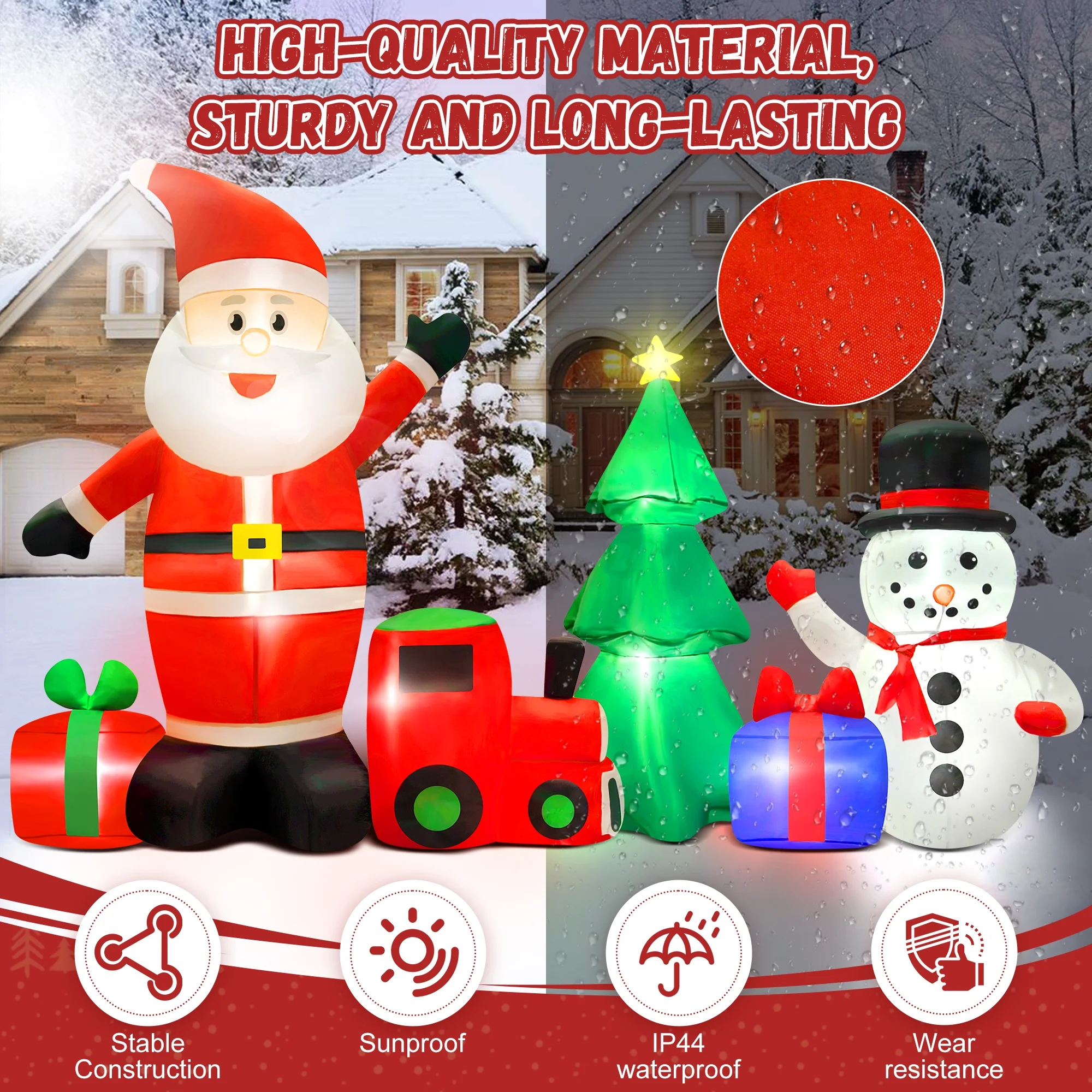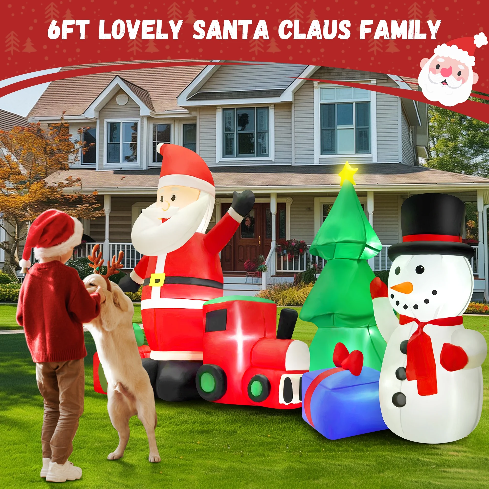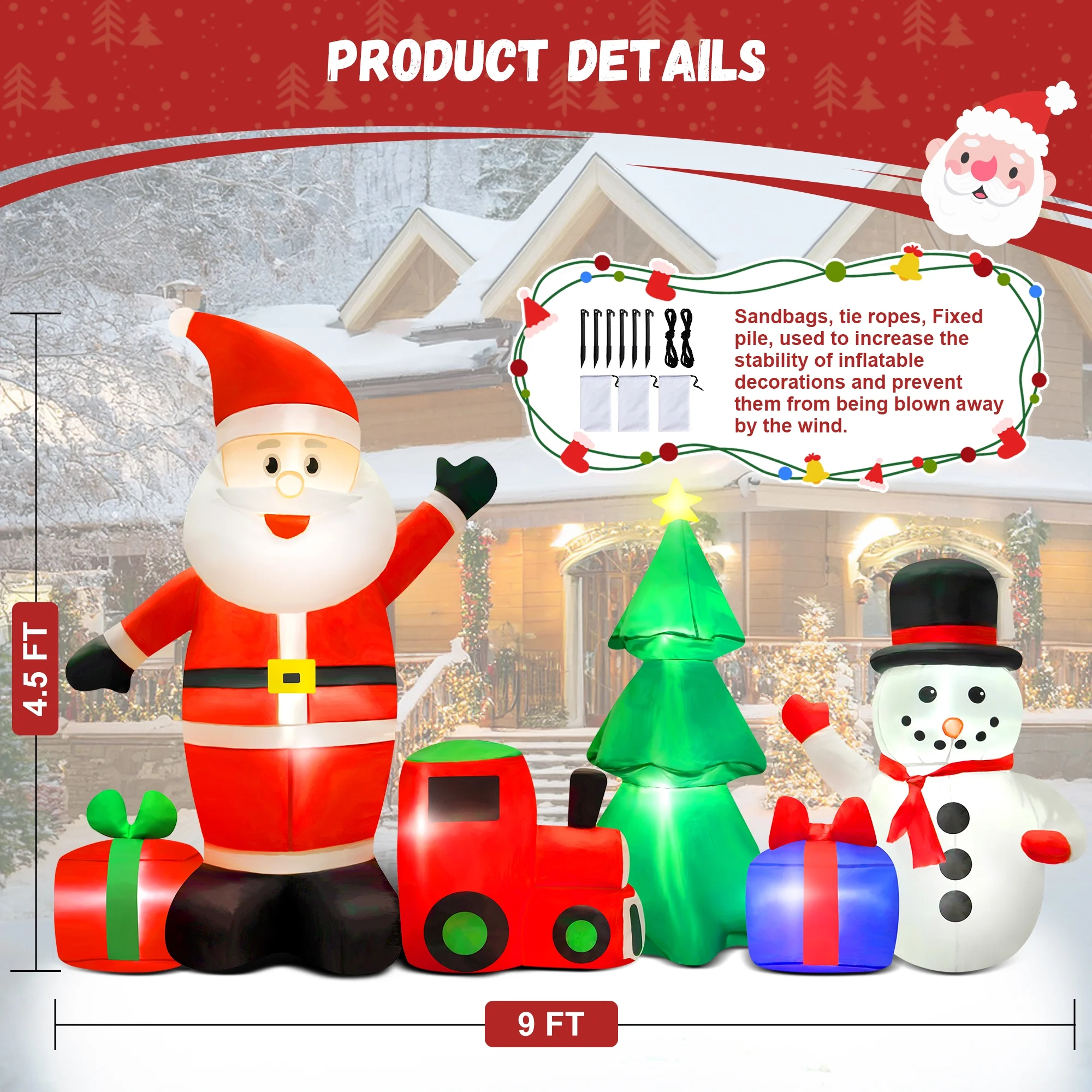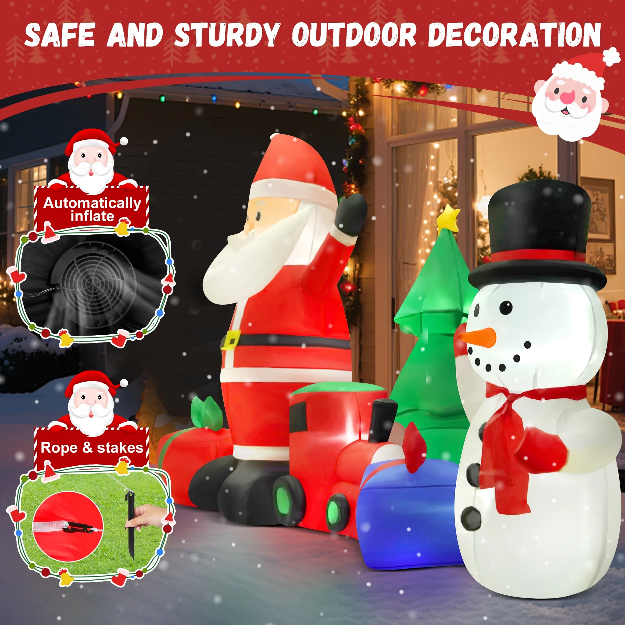 【Perfect Outdoor Christmas Decorations】 – This Christmas 9.2FT Inflatable Santa Claus with Snowman, Train, Christmas Tree and Gift Boxes is cute and charming, with built-in LED lights, which will flash charming lighting effects at night, attract the attention of neighbors and children, and make your yard be eye-catching at Christmas. 【Inflated in Minutes】 – This eye-catching decoration requires minimal effort to set up with few minutes by the built-in fan and charger; Don’t worry about the storage problem, the great design allows people to store quickly and easily 【High-quality & Durable】 – Made of high quality polyester material, this Santa ornament is safe and durable to use; The extended power cord is suitable for you to put it in different places, no matter indoor or outdoor, such as the garden, lawn, backyard, courtyard, patio, and so on; Featuring low noise, our product only makes a little noise when operating in the room; If put in the outdoor, the noise can be neglected 【Delightful Holiday Scene】 – This delightful Christmas party decoration isn’t just for show; it’s also a favorite toy for kids and a cherished Christmas gift for kids and adults alike. These versatile decorations are perfect for outdoor and garden settings, making them ideal for Christmas yard and garden displays. 【Complete Accessory Kit】 – The package includes 6 ground stakes, 2 ropes and 2 built-in sandbags to make it more stable outside and in windy weather; Just plug it in, stake it down and watch it transform; A perfect nighttime display will make your house become more popular and unique on Christmas