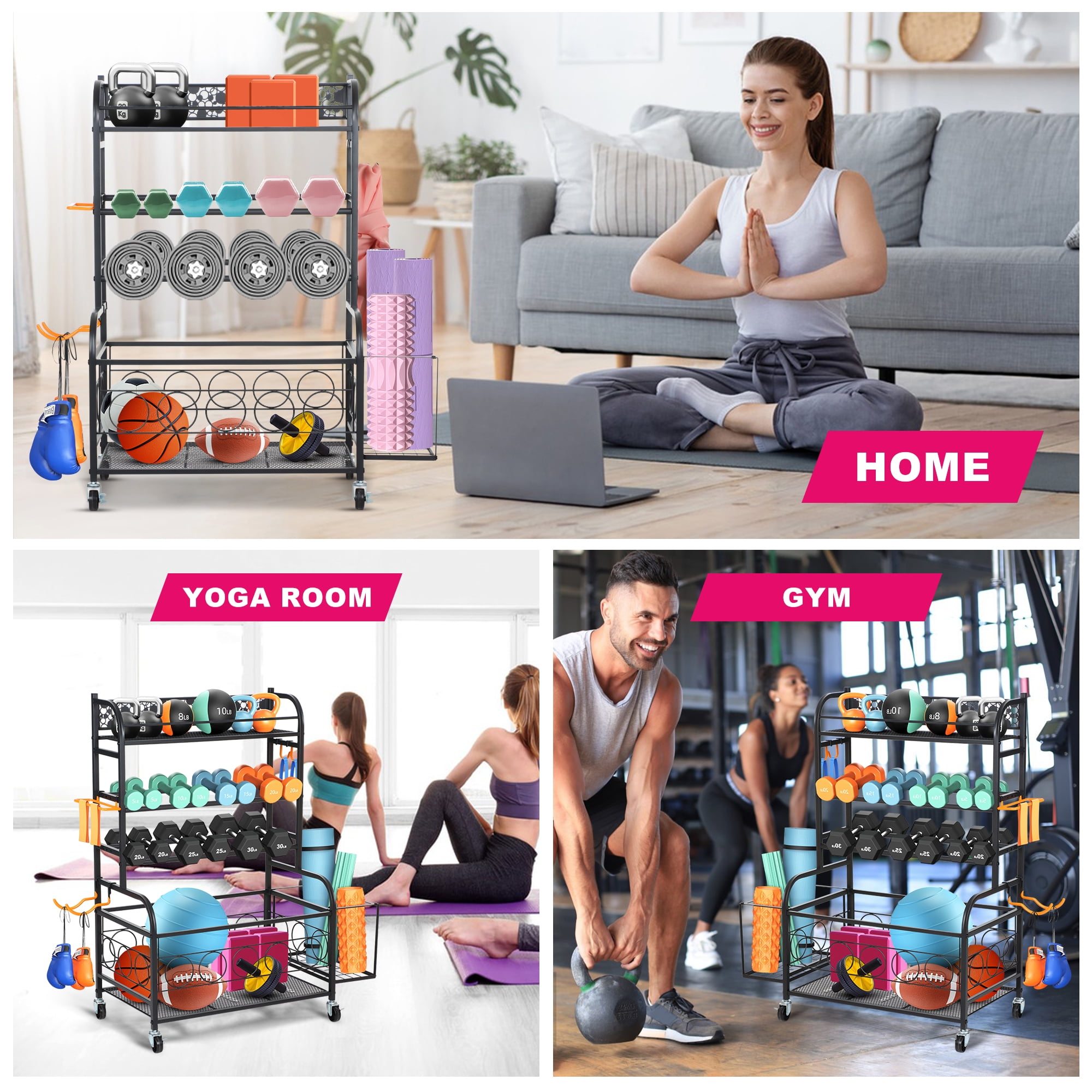 Yexmas Home Gym Storage Rack, All-in-one Weight Rack for Dumbbells, Kettlebells, Yoga Mats, Foam Rollers, Resistance Bands, Workout Equipment Storage Organizer with Hooks and Basket, Black