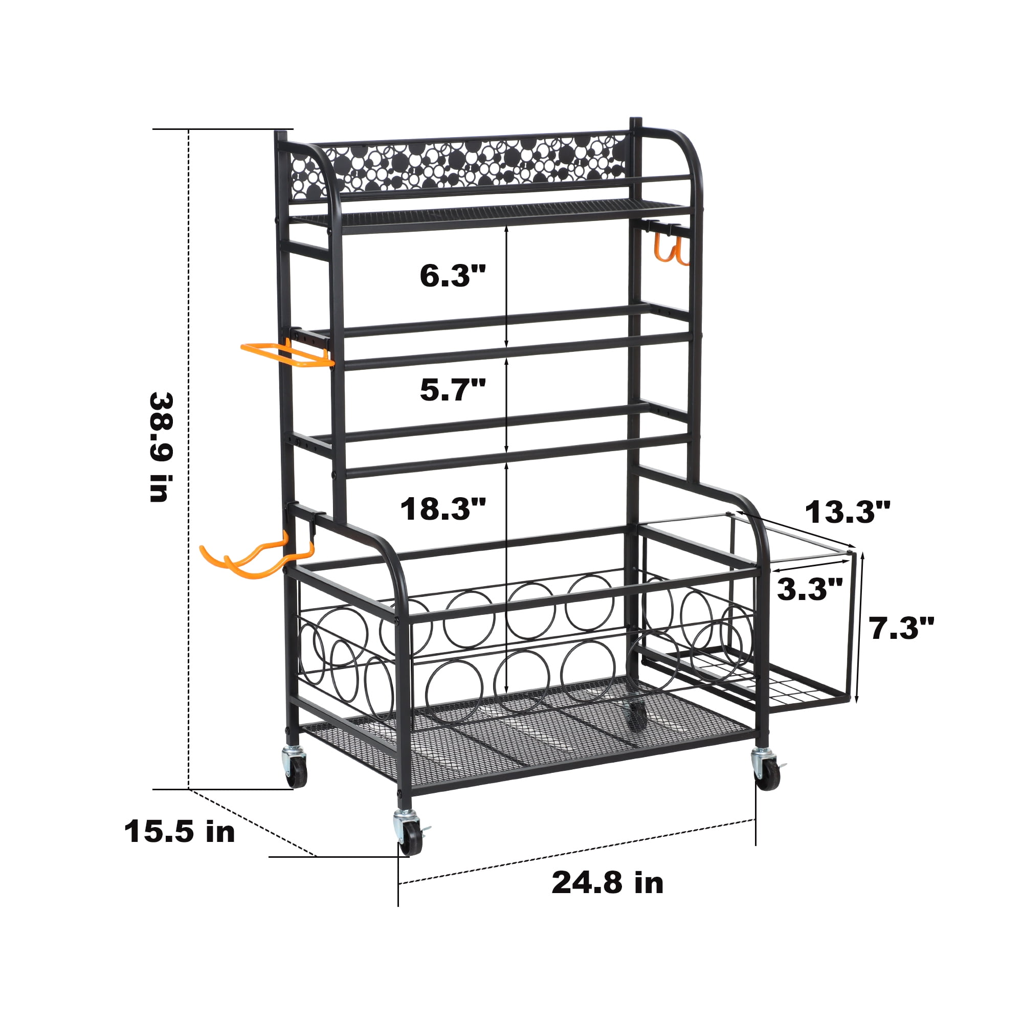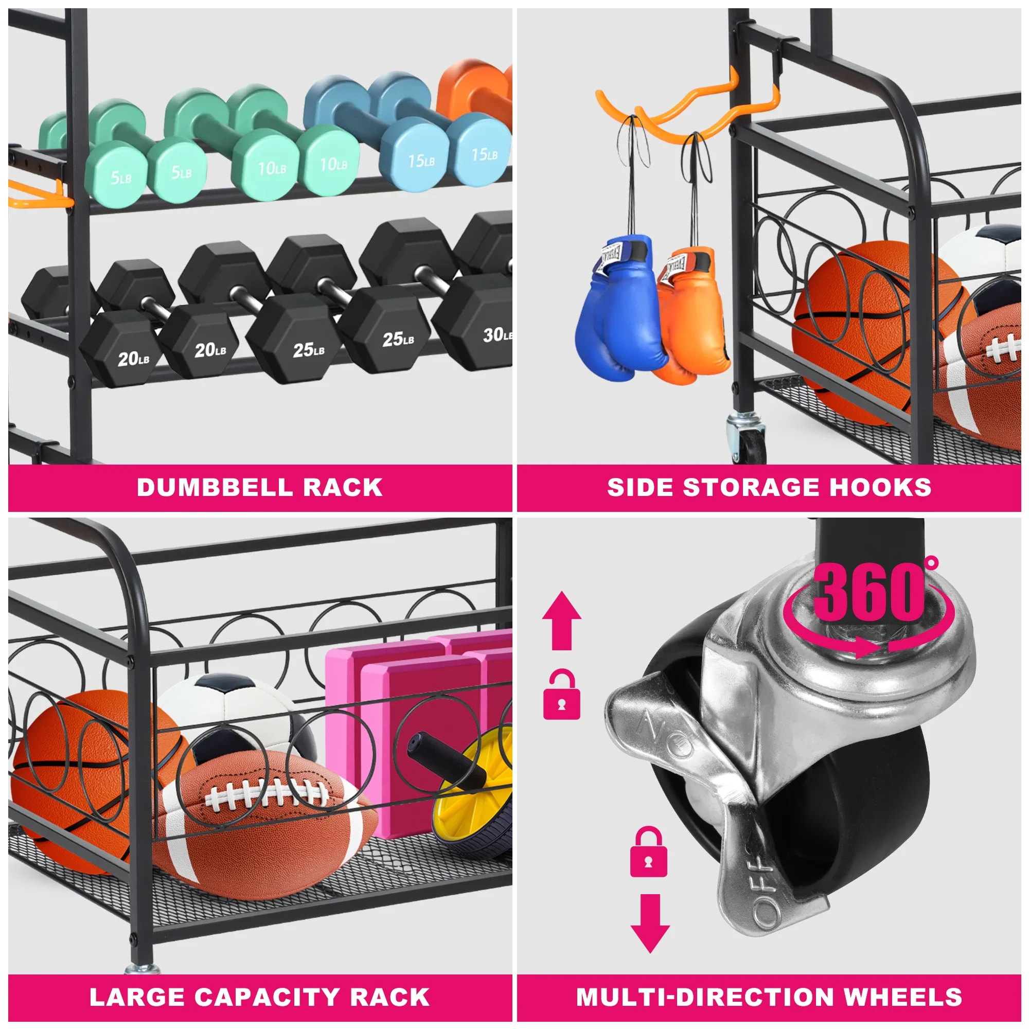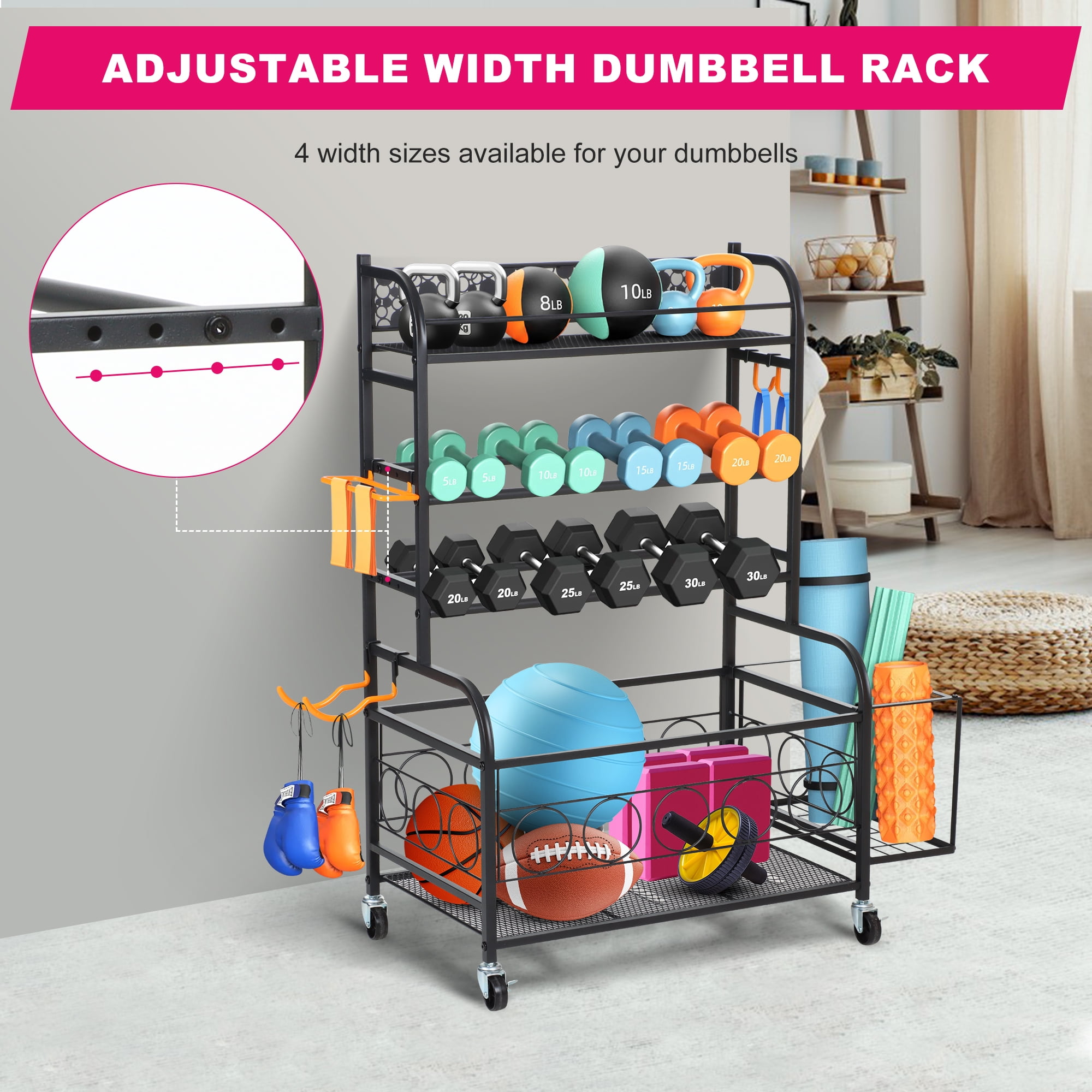[All-in-one Large Home Gym Storage Rack]: This versatile weight rack features a top plank layer for kettlebells, a 2-layer dumbbell rack, a bottom plank storage basket, and a side basket for yoga mats and foam rollers. Additionally, it includes several side hooks for fitness bands and rollers, making it perfect for organizing all your gym equipment into one convenient storage rack, ensuring your space stays tidy and organized. [2-layer Adjustable Free Weight Rack]: The width of the dumbbell rack can be adjusted to accommodate different sizes of dumbbells, with 4 size options available (175/145/115/85 MM). Each layer can support up to 120lbs, providing a convenient and accessible storage solution for your dumbbells. [Sturdy and Durable]: Crafted from high-quality metal and wood board materials, this dumbbell stand workout storage is designed to be strong, wear-resistant, and durable. With a weight capacity of 380lbs, it can easily accommodate your exercise equipment storage needs. [Removable Storage Rack]: This strength training dumbbell rack offers both fixed and movable installation options, featuring 4 sturdy multi-directional wheels, including 2 lockable wheels. Easily move the storage cart wherever you need it and lock it in place for stability. [Easy to Assemble]: With clear assembly instructions and included installation tools, this weight storage rack can be easily assembled following the provided steps. Remember not to tighten the bolts until the rack is fully assembled, and ensure all screws are tightened in the final assembly step to maintain balance.