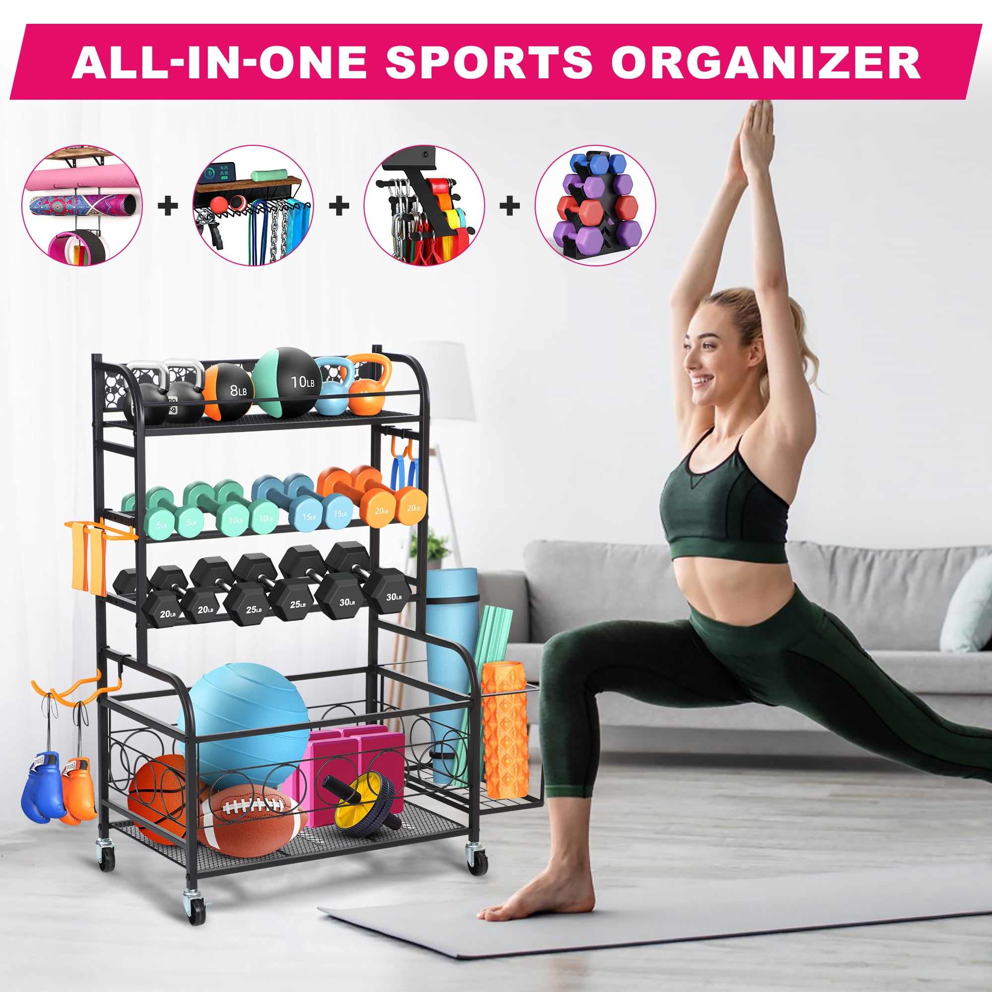 Yexmas All-in-one Workout Storage with Wheels offers a comprehensive solution for organizing your home gym equipment. This multi-functional weight rack includes a heavy-duty metal board for kettlebells, adjustable 2-layer dumbbell racks, a spacious bottom storage basket for various fitness items, a side basket for yoga mats and foam rollers, as well as several side hooks for fitness bands and rollers. With its large capacity, this storage rack meets all your sports equipment needs, ensuring easy access and tidy organization of your workout essentials.