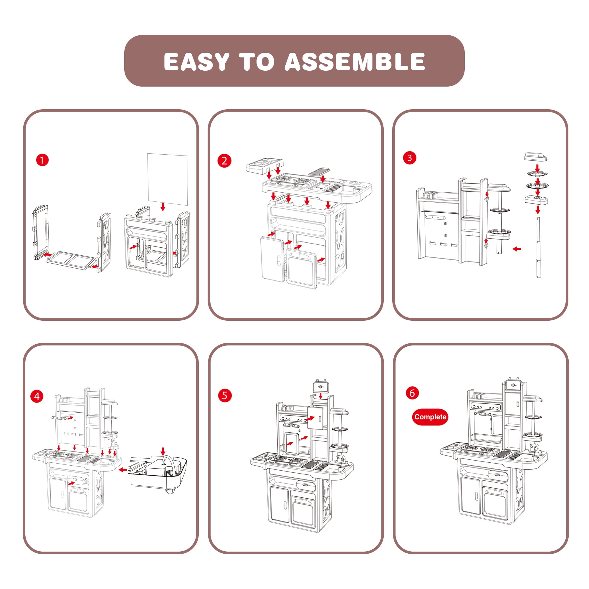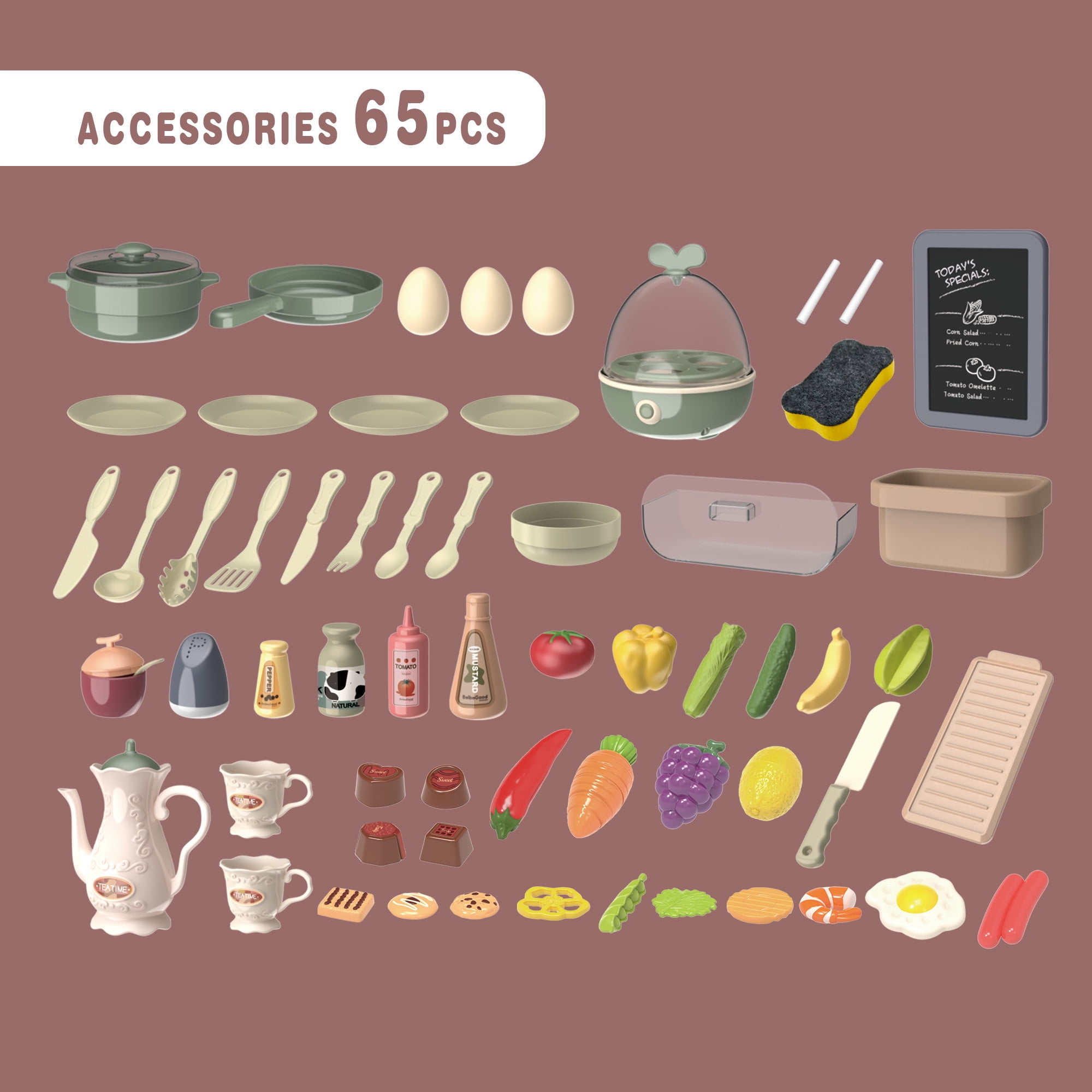 [Toy Kitchen Set for Kids]With incredibly lifelike equipment and accessories, such as an electronic burner with steam, a play sink with running water, play food, several types of kitchen accessories, and different cooking tools, this kitchen playset provides an authentic cooking experience for your kids. For hours of pretend play enjoyment, kids can pretend to cook as though they are using actual appliances. [Kitchen Sink with Water Circulation System]Fun steam function is included on the pretend stove burner. There will be white vapour when your child cooks. A water circulation system is used by the water sink toy to conserve water. Kids can clean up after themselves and wash pretend food. A musical toy is also placed in the kitchen’s range hood toy. It can provide music, lights, and a sound. Role play is made more enjoyable by these simulation features. [Fun Kids Kitchen Toy for Educational Entertainment]Children may learn while having fun with this pretend kitchen set. Improve their practical, imaginative, linguistic, and social abilities while learning about cooking through fun role-playing games. Playing with the sink to increase environmental awareness. Children can tidy up and organize themselves after playing with the kitchen toys thanks to their storage space, which helps them form a habit of keeping things organized. [Easy to Assemble] Installation instructions are provided in the box side for this kitchen playset. [Ideal Gift Option for Age 3+]The Play kitchen food makes a great addition to any play area and makes a wonderful present for birthdays, Halloween, Thanksgiving, and New Year’s, as well as for role-playing games and Christmas celebrations.
