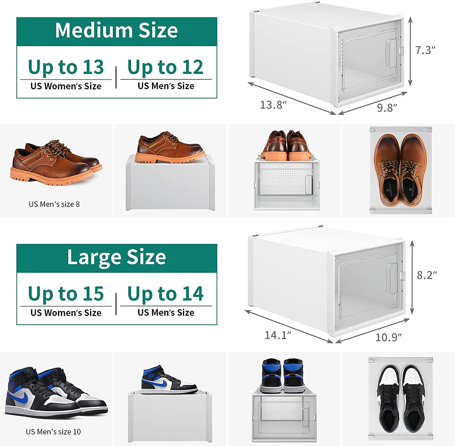 BOX DIMENSIONS – Each box is 13.8”L * 9.8”W * 7.3”H; Lightweight cardboard body allows for easy portability. Women’s US size up to 11″”. Ideal for sandals, running shoes, flat shoes, high heels. Not Fit : Big Size Shoes and AJ. TRANSPARENT DOOR – YITAHOME shoe boxes are equipped with a clear door allowing you to easily find the shoes you want. DUSTY FREE – The ventilated design facilitates the air circulation in the item to ensure that there is no peculiar smell. MULTIFUNCTIONAL APPLICATION – You can store much more than shoes! YITAHOME stackable organizers are great for cosmetics, clothing, electronics, and more. ECO-FRIENDLY – The environmentally friendly and ABS material are waterproof and easy to clean. The shoeboxes are designed to provide ventilation while also preventing dust from getting in. Comes with a 1-year warranty.