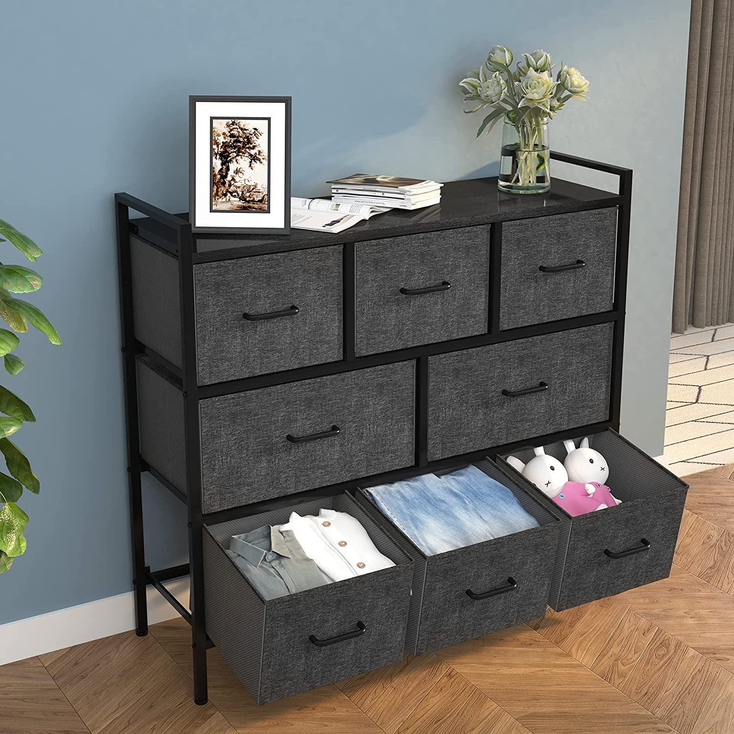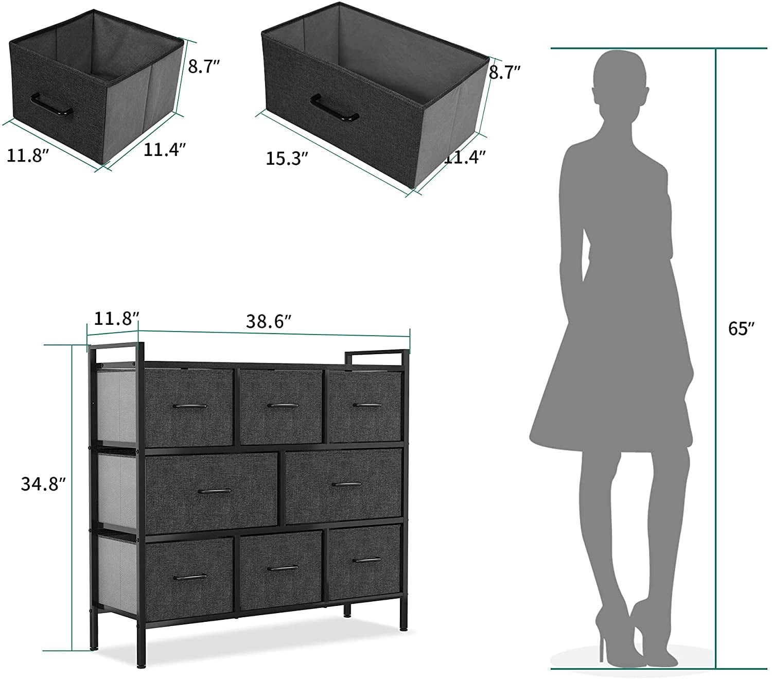 Wood, Medium Density Fibreboard, Iron, Metal, Steel, Fabric QUALITY CONSTRUCTION- Built with a powerful metal frame, a durable MDF wooden top; Users can secure the dresser to the wall using screws; Features 8 removable drawers with easy-to-pull plastic handles; Held up by 4 adjustable plastic legs that prevent scratches to your floor DURABLE FABRIC- The drawer’s front side is constructed with premium cationic fabric; The surrounding sides are covered by breathable, non-woven synthetic fabric; Allows for easy care – simply wipe clean with a damp cloth and let air dry EASY ASSEMBLY- Comes with detailed instructions for a hassle-free installation; Top sides handles, convenient to move everywhere, and prevent books from falling. All pieces and accessories are included in the package; Assembly only requires you to fasten some screws VERSATILE COLOR SCHEME- Highlights a sleek, modern design combining premium dark grey fabric drawers, a sturdy black metal frame, and a waterproof wooden tabletop; Perfect for living rooms, bedrooms, hallways, entryways, closets, nurseries, etc. LARGE STORAGE CAPACITY – The YITAHOME 8-Drawer cabinet conveniently organizes your clothes, scarves, socks, T-shirts, pants, sunglasses, books, small toys, etc.; Overall dimensions: 38.6″ x 11.8″ x 34.8″; Large drawer dimensions: 15.3” x 11.4” x 8.7”; Small drawer dimensions: 11.8” x 11.4” x 8.7” Fixing the fabric dresser to the wall is well recommended. Please follow the instructions.