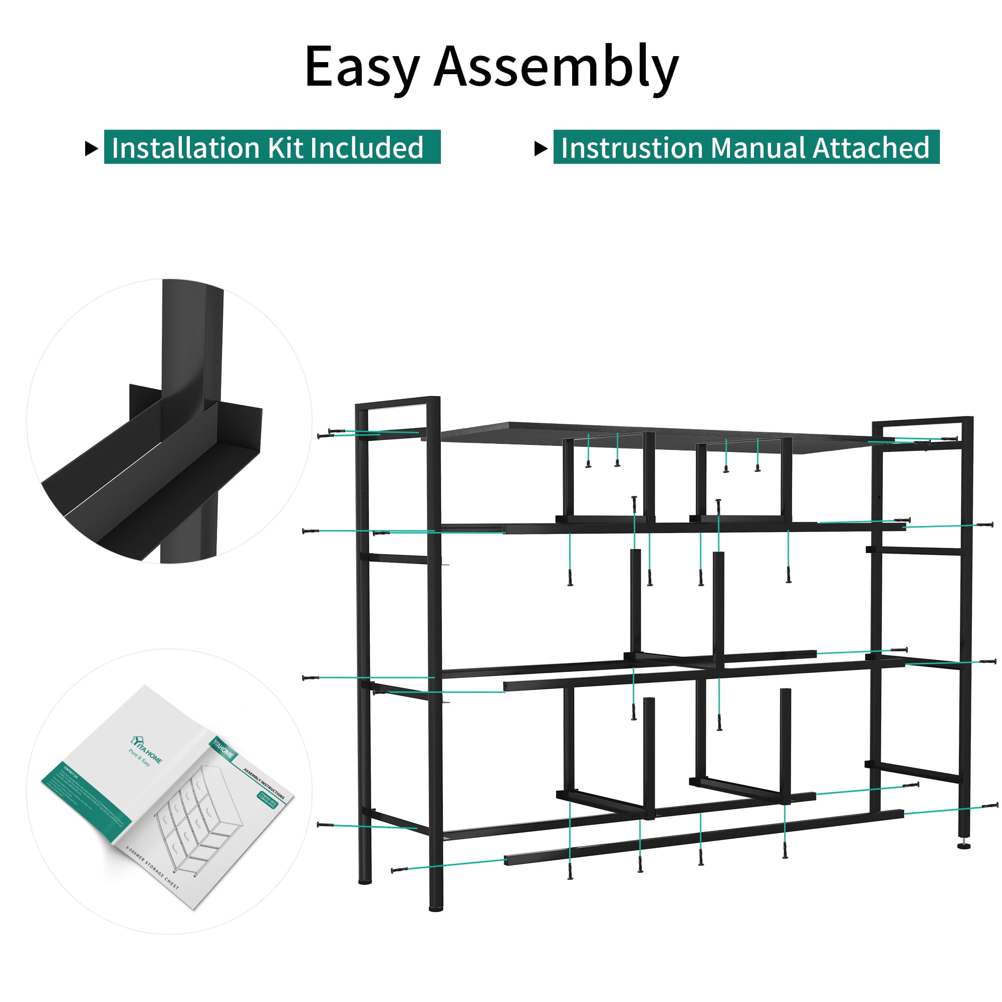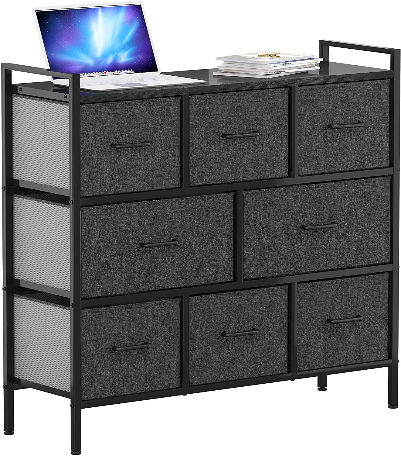 YITAHOME Dresser with 8 Drawers Simplify your lifestyle Organize your home with our premium storage drawer. Use it to teach your children how to manage their stuff. Trust YITAHOME to help you create a relaxing, organized life. Made with a powerful metal frame and durable MDF wooden top; contains 8 removable and foldable drawers with easy-to-pull metal handles; features 4 adjustable plastic legs that prevent scratches to your floor. Specification: Material: Non-Woven Synthetic Fabric, MDF, Steel, Plastic Drawers:8 Color: Black Gray Package Includes: 8 drawer storage chest Assembling hardware kits