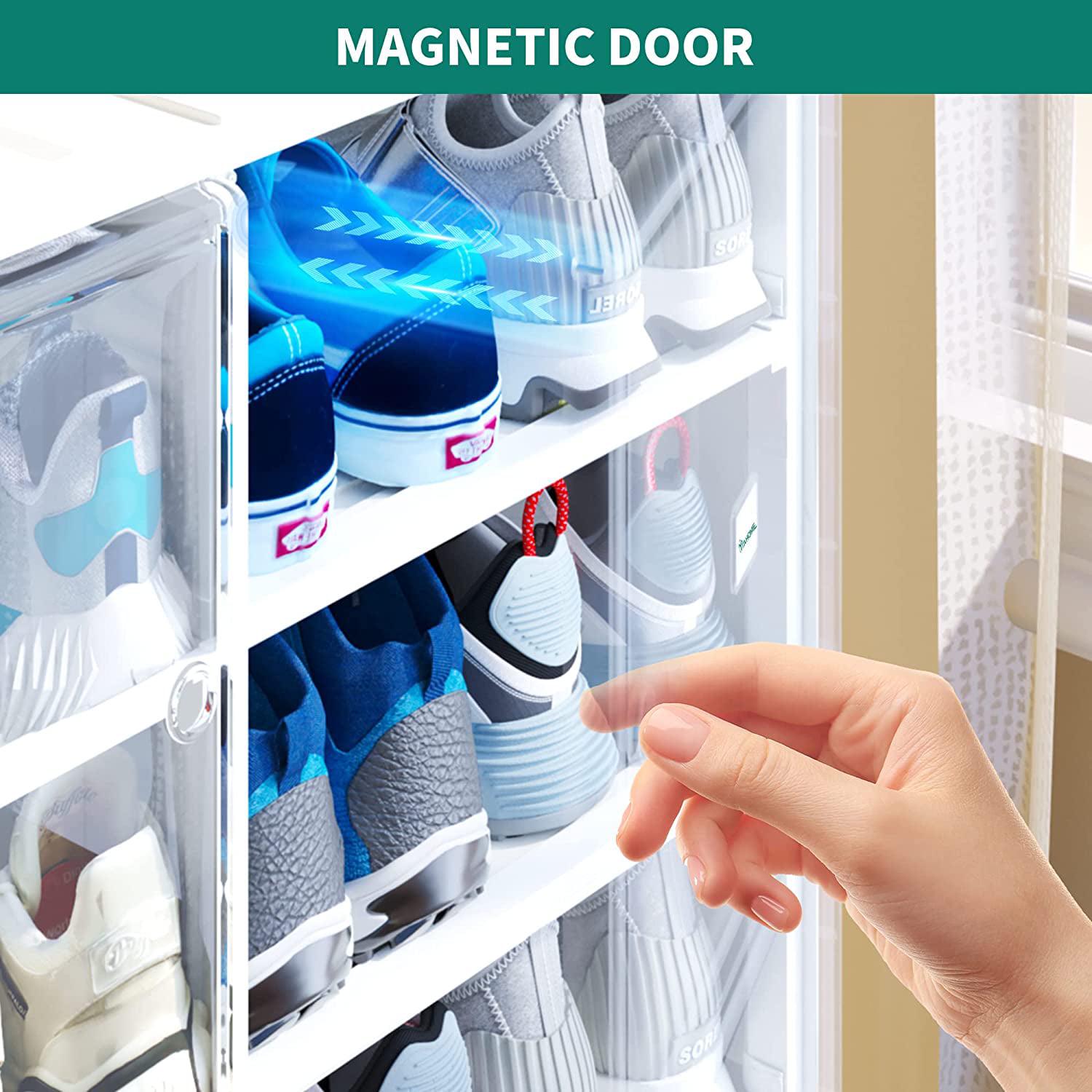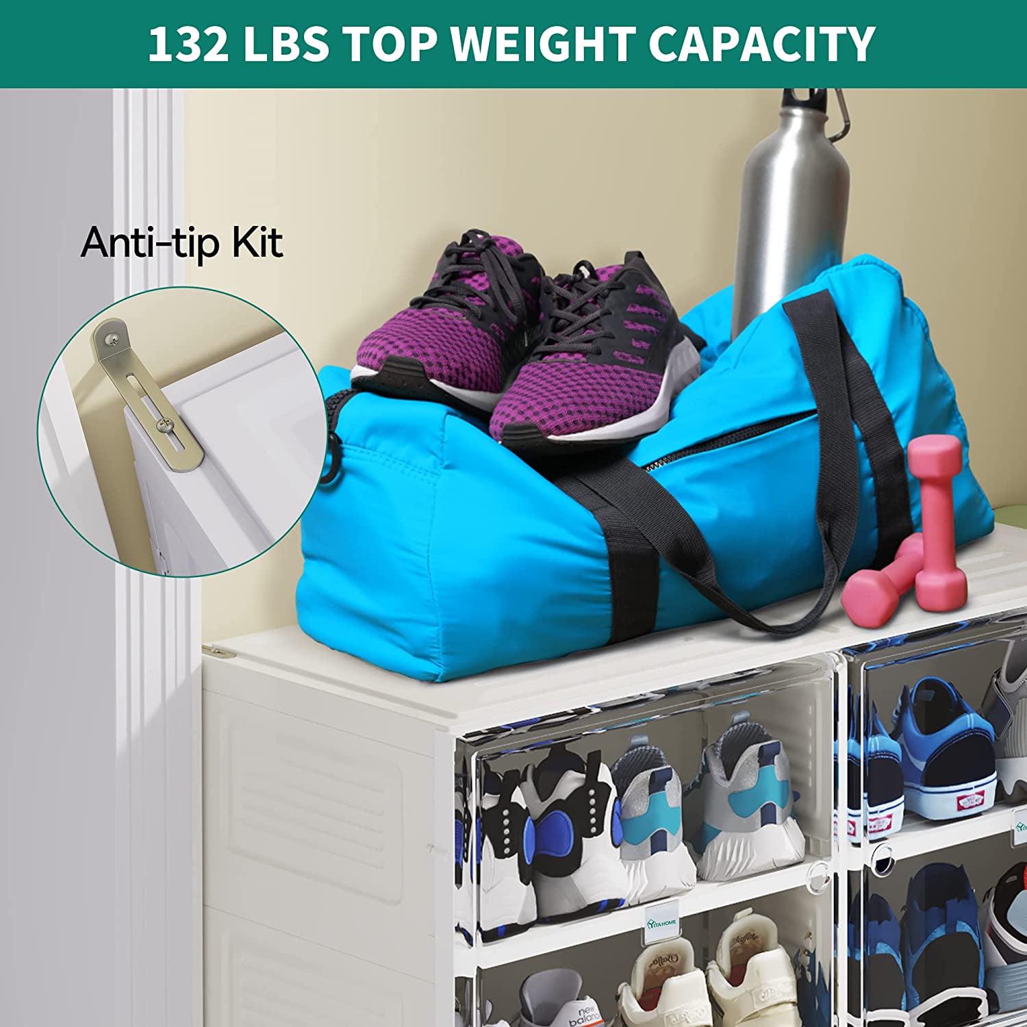 – EXQUISITE DETAILS: Double pane transparent door panel and built-in strong magnetic self-priming cabinet door perfectly harmonize to offer sleekness with practicality; Stackable shoe rack with ventilation holes on the door preserves your valuable shoes for years.