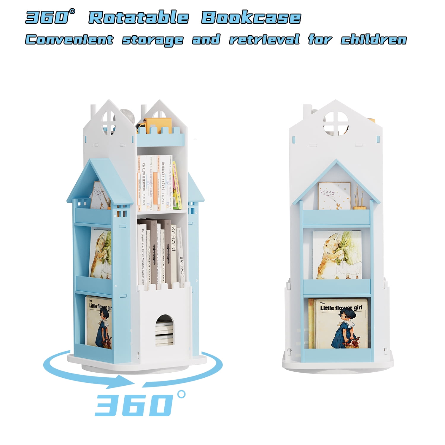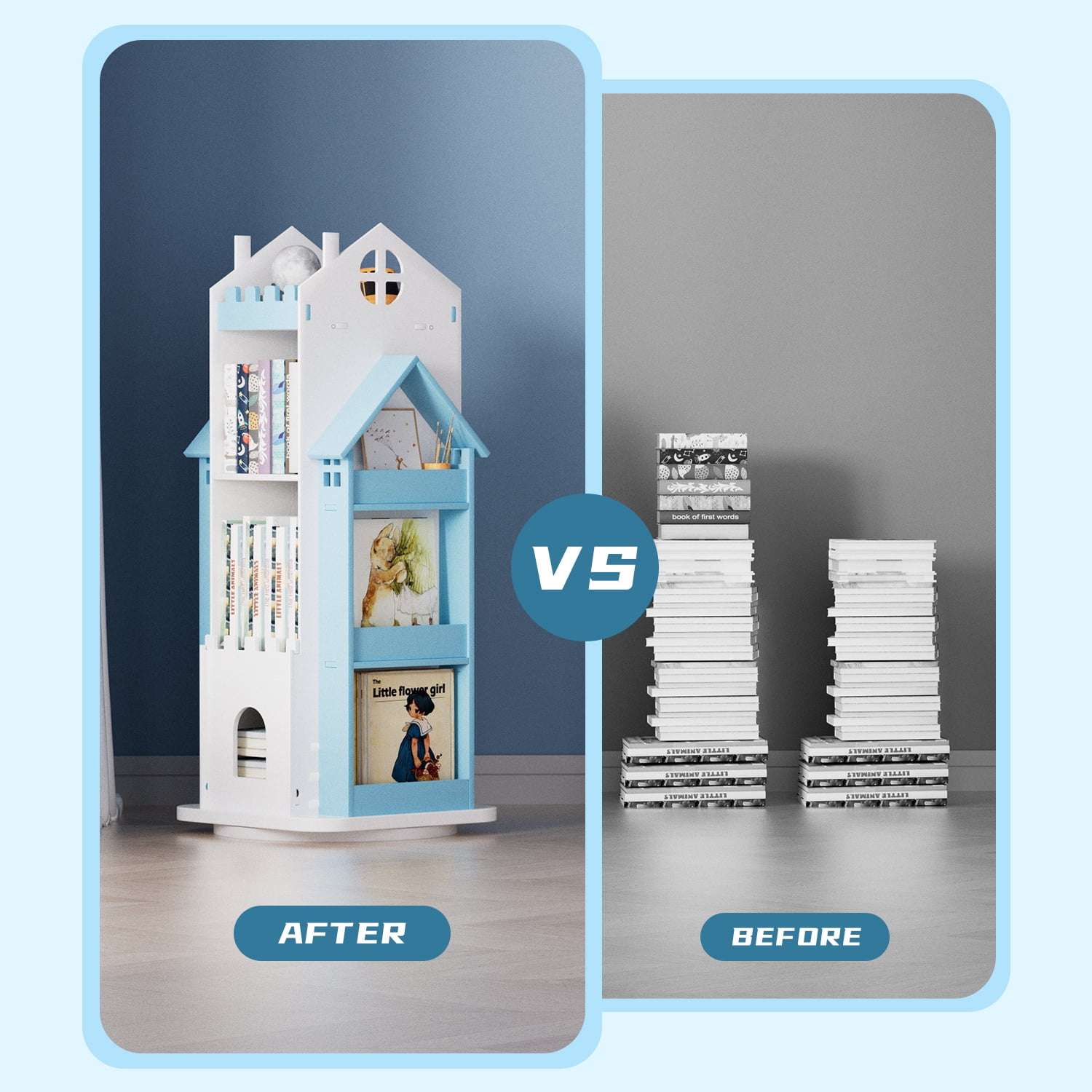 【360° Rotating Bookcase】 Rotating bookshelf supports 360° rotation, You can display your books to your heart’s content and you can find the books you want more easily. 【High Quality】 Rotating bookcase is made of PVC foam board, no paint health and environmental protection, smooth surface, durable, can be fire retardant, mildew moisture-proof, heavy capacity. 【Space-Saving】 Bookcase has a small footprint, only a small space is needed to store it. The innovative castle appearance is very easy to attract children’s attention.This bookcase will help your child to develop good reading and storage habits. 【Easy to Install】 Kids bookshelf comes with installation instructions, it will help you install more easily, if you have any questions about this product, please feel free to contact us! 【Multifunctional Bookshelf】 Children’s bookcase is not only for books, it is also perfect for toys and storage of other items.You can choose it with confidence.Product Size:16.14*16.14*37.4in/41*41*95cm. Recommended for children 6 years and older.