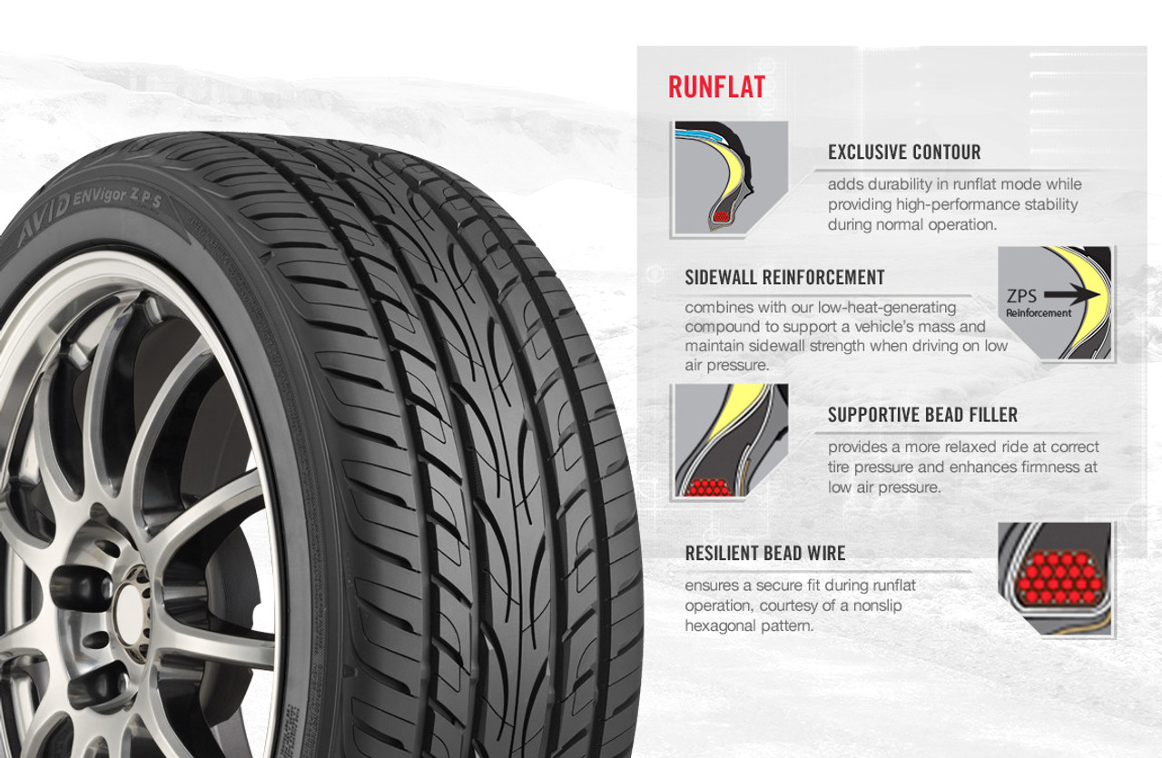 The ZPS or Zero Pressure System reinforced the tire’s structure, which enables its limited, temporary performance in case of air pressure loss. Once air pressure leaves the tire, it can be driven on for 50 miles up to 50 mph as the structure withstands the weight of the vehicle and its passengers. This significantly upgrades the tire’s driving durability, preventing the vehicle from being stuck on the side of the road. Instead, the vehicle can be driven to a nearby location, where the damaged tire can be fixed or changed. Run flat tires should not be mounted on the same vehicle with regular tires.