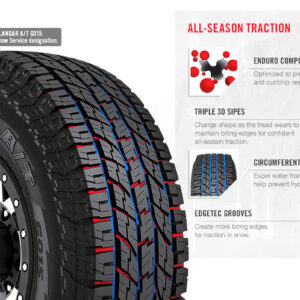 The tire’s special tread design features 3D sipes and EdgeTec grooves that improve the tire’s performance. The siping detail ensures all weather, including winter, traction and road gripping ability, while the grooves maintain road grip even in off-road conditions. The special circumferential grooves enhance the wet weather traction and prevent hydroplaning situations. The tire is capable of handling all terrain conditions with ease and it can conquer all soft, loose and uneven road surfaces. The tread design guarantees a safe all season and all terrain driving experience.