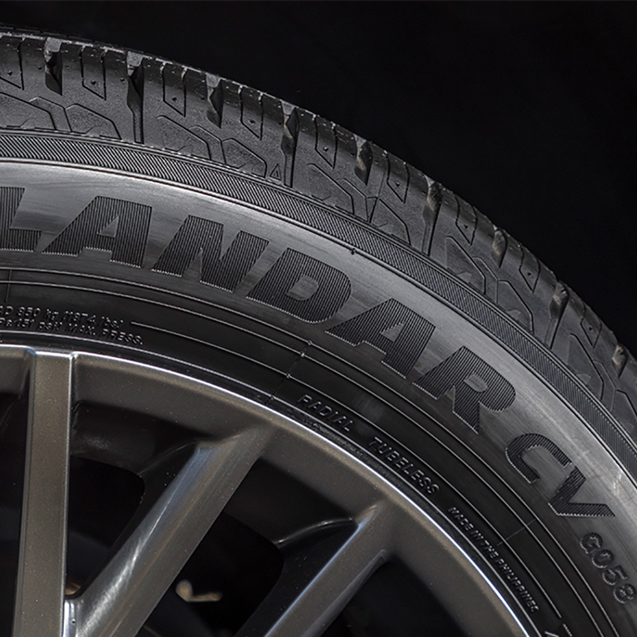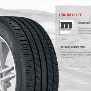 The tread design and the all season compound promote excellent dry, wet, and winter weather performance. The CV-2 compound keeps the rubber flexible in hot summer and cold winter temperatures. The ideal tread design, with the wide circumferential grooves and siping detail, enhance wet and winter road gripping ability. The wide grooves disperse water and slush from below the footprint and prevent hydroplaning. On the other hand, the 2D and 3D sipe combination creates extra biting edges to grip ice- and snow-covered road surfaces. These elements provide a secure driving experience throughout the year.
