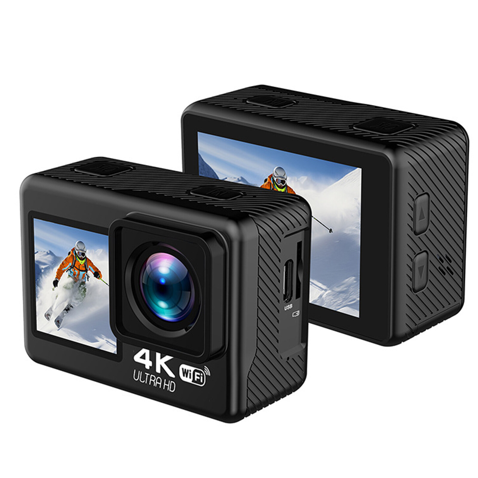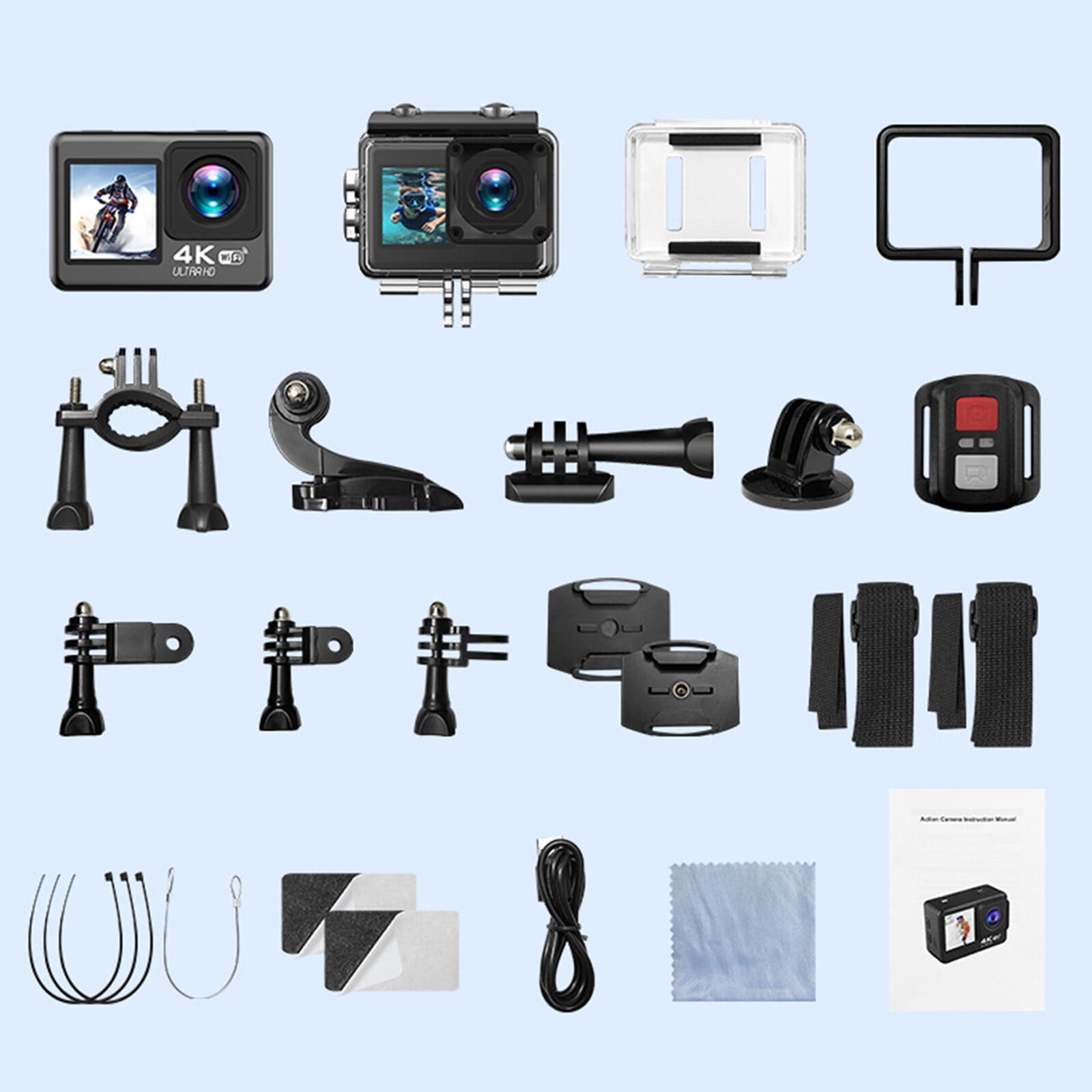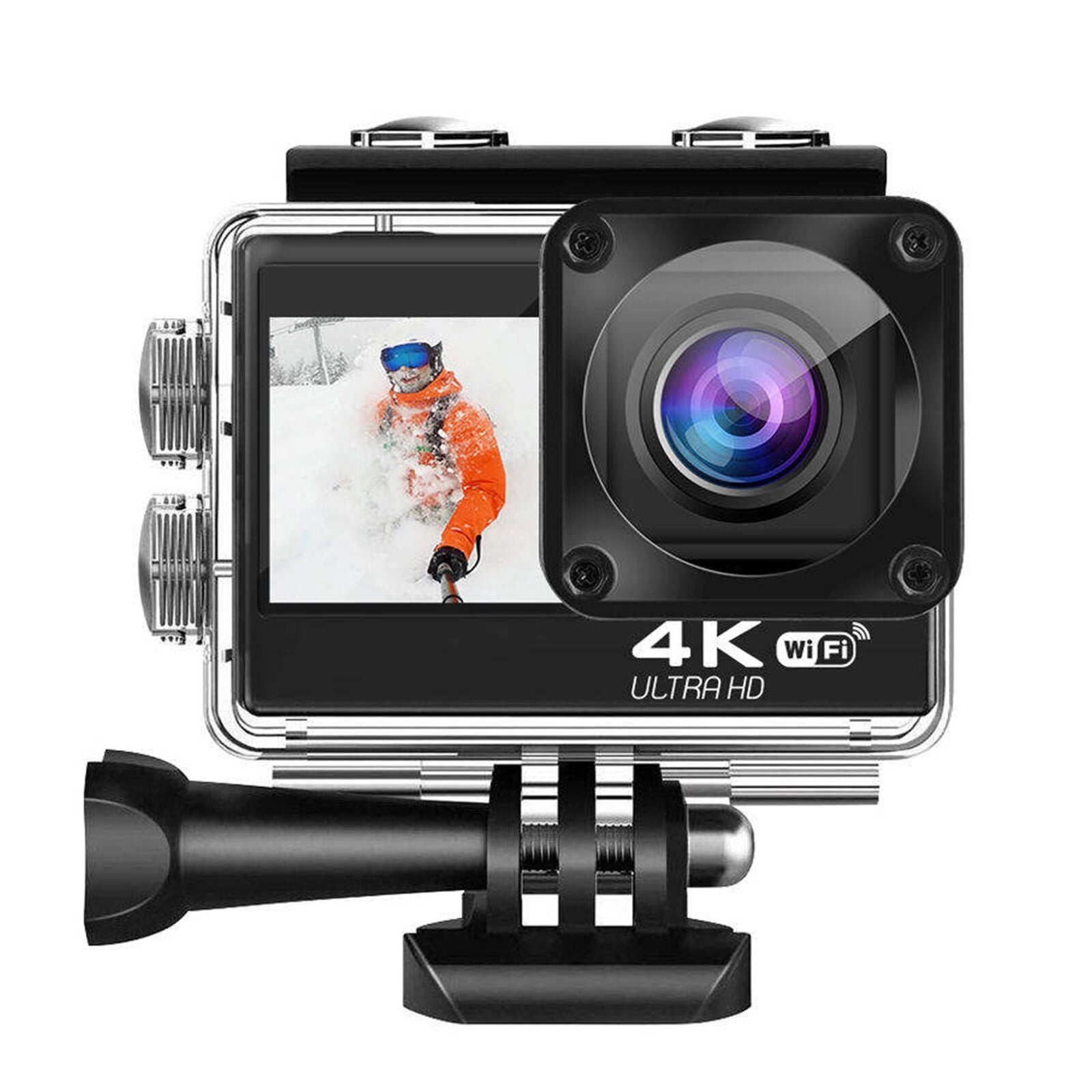 Features With 4K 30 FPS video and 20MP photos for captivating footage. Stabilization ensures clear photos. Dual screen design makes it easy to frame shots and take selfies using the front and rear screens. Comes with an IP68 waterproof case to a depth of 98.4 feet to capture your underwater adventures. It has other functions such as slow motion, drive mode, time lapse mode, ideal for beginners and pros. Kit includes remote control, back clip, curved base, holder and more, perfect for cycling, skiing, surfing, climbing, etc. Specification: Size: 31*41*60mm Battery capacity: 900mAh Screen size: 1.3″(front); 2.0″(rear) Waterproof grade: IP68 Endurance: 90 min Video Resolution: 4K 30, 2.7K 30, 1080P 120/60/30720P 240/120/60/30B Photo Resolution:20M/16M/12M/8M/5M/2M Package List: 1x action camera 1x waterproof case 1x waterproof covers 1x back clip 1x holder 1x curved base 1x waterproof housing base with screw 1x remote control 3x accessories 1x stand 1x strap 3x rolling belt 1x wire rope 1x adhesive 1x data cable 1x cleaning cloth 1x instruction manual