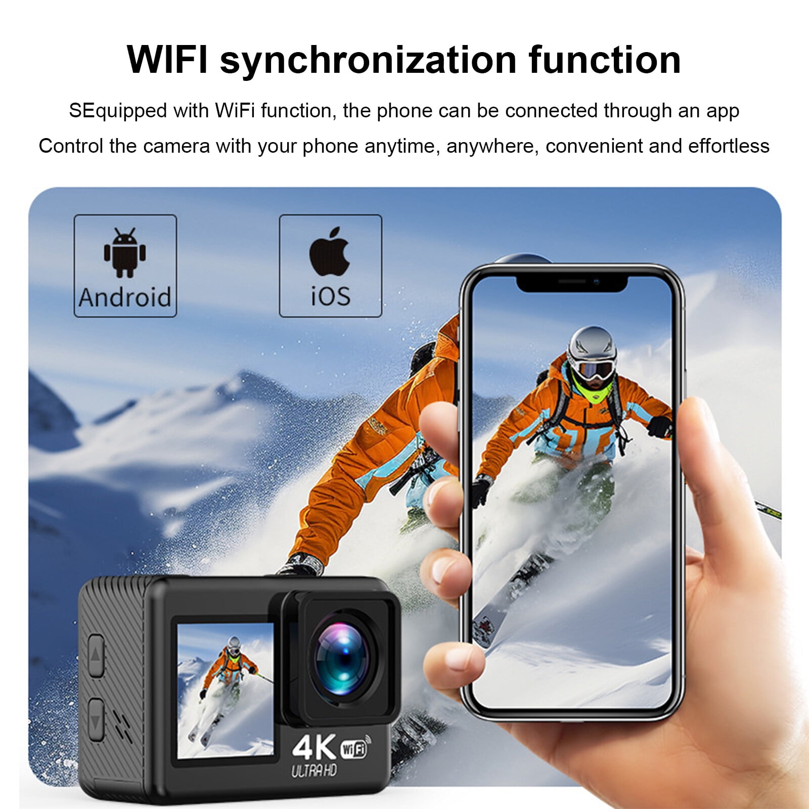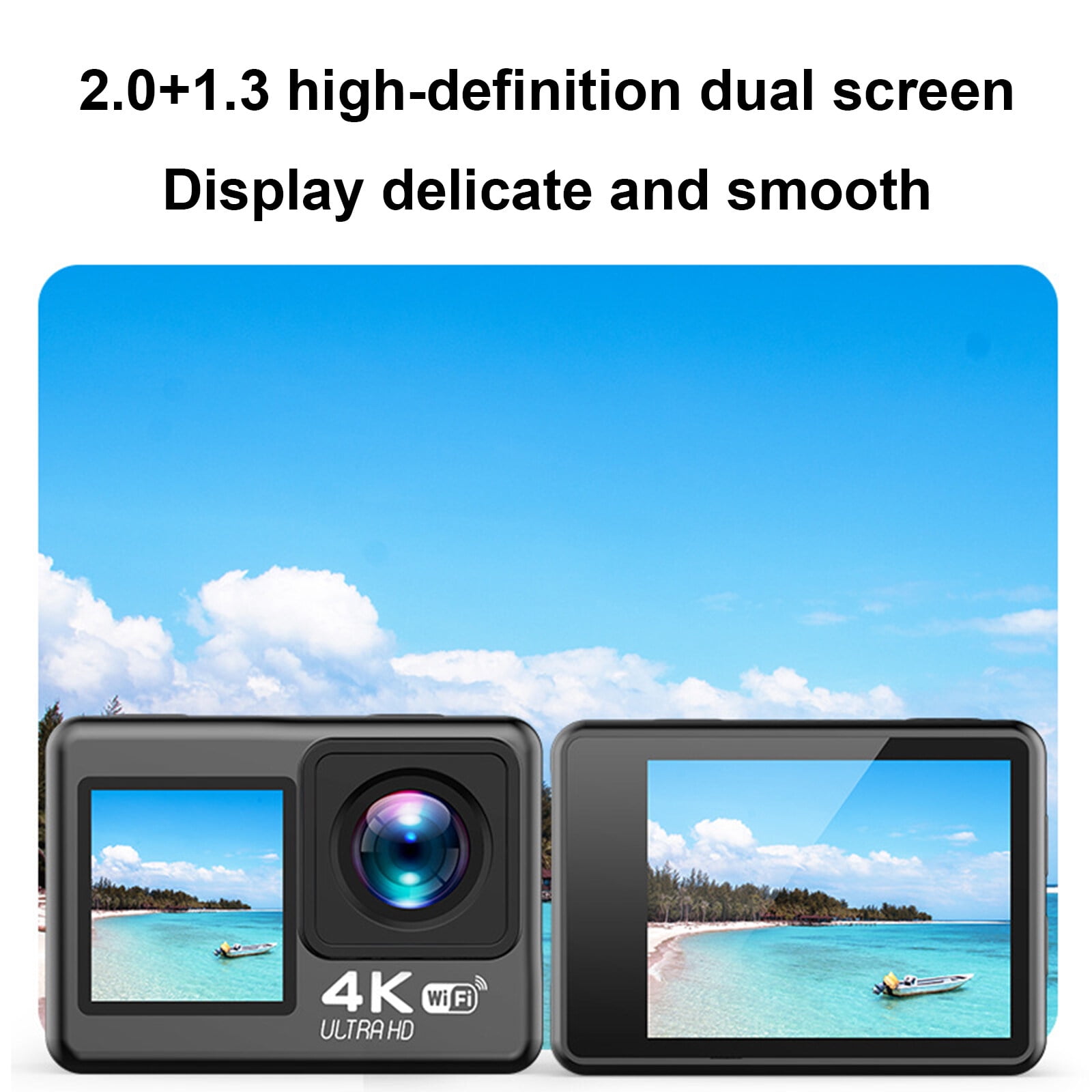 All-Weather Sports Camera: The camera features 4k 30fps video resolution and 20MP photos, waterproof to 33 feet (10 m) without a case, and its IP68 waterproof case design protects camera underwater from wind and rain for underwater adventures up to 98.4 feet (30 m) , easily unlock all shooting scenes and vlogging experience! Convenient Touch Screen Dual: Upgraded touch screen dual design makes it easier to change the front and rear framing and monitoring views of waterproof video camera. Meet the needs of selfie, don’t miss every moment worth recording. The 6-axis gyro EIS helps you capture the dynamics and exciting moments of the event! WIFI Wireless Connection: Install the corresponding APP on the mobile phone or tablet according to the instruction manual, connect camera waterproof with WIFI, preview, edit and share to social networking sites faster, such as Tik Tok, capture the world in a new way, and keep up with the pace. (WiFi range up to 33 feet) Professional Features & Accessories: Action cameras include various modes such as slow motion, driving mode, etc., creating material beyond imagination. With a waterproof case and numerous accessory kits, including a 64GB SD, helping you expand more usage scenarios with a reasonable budget.