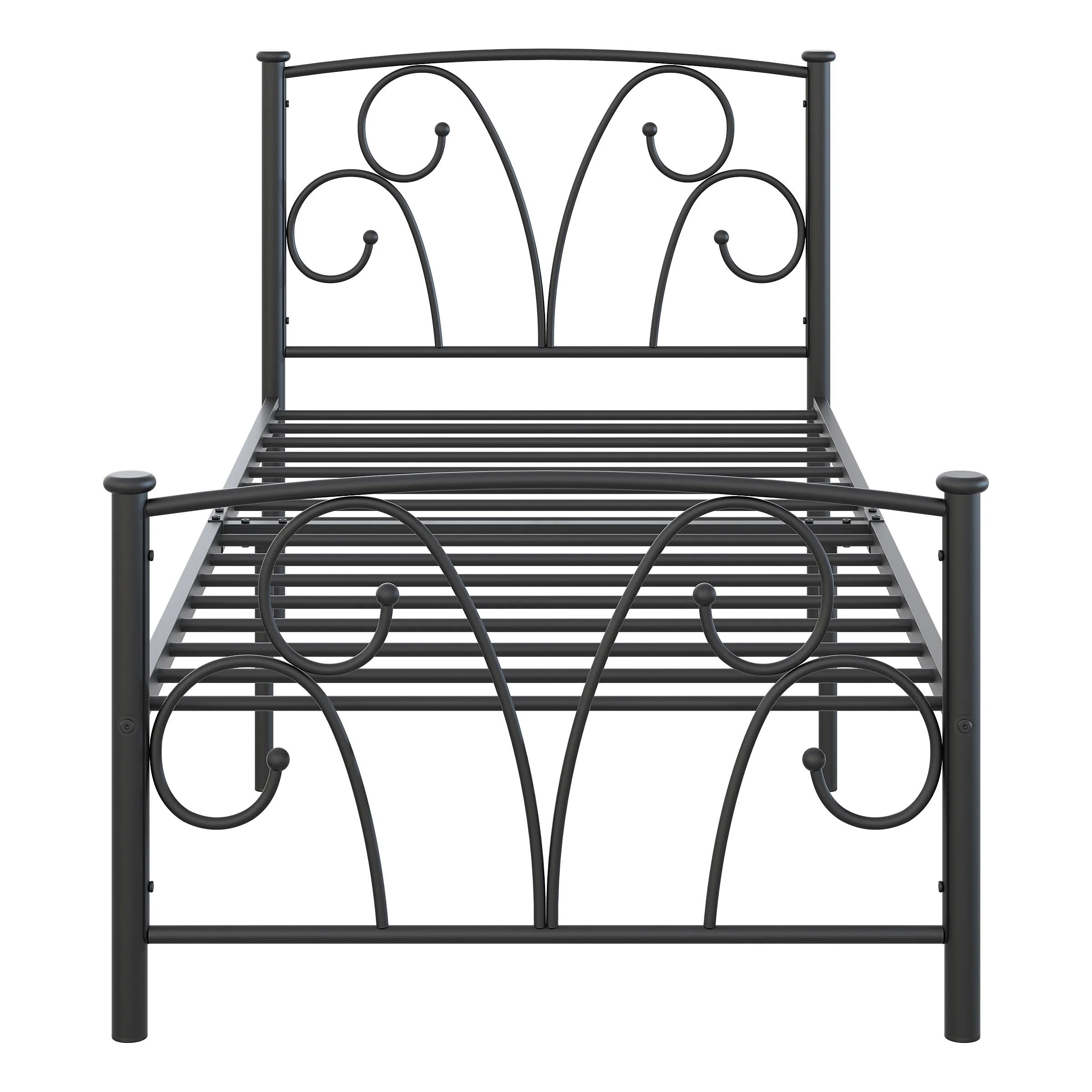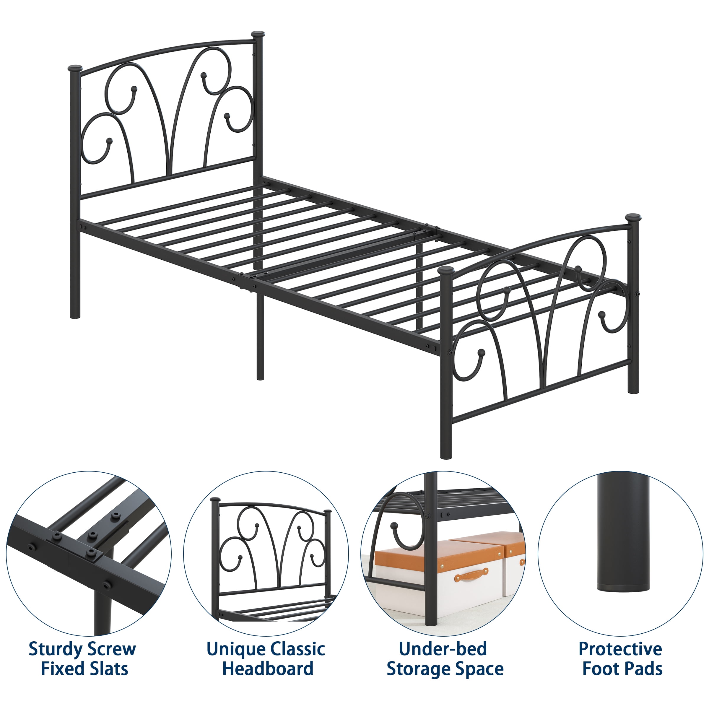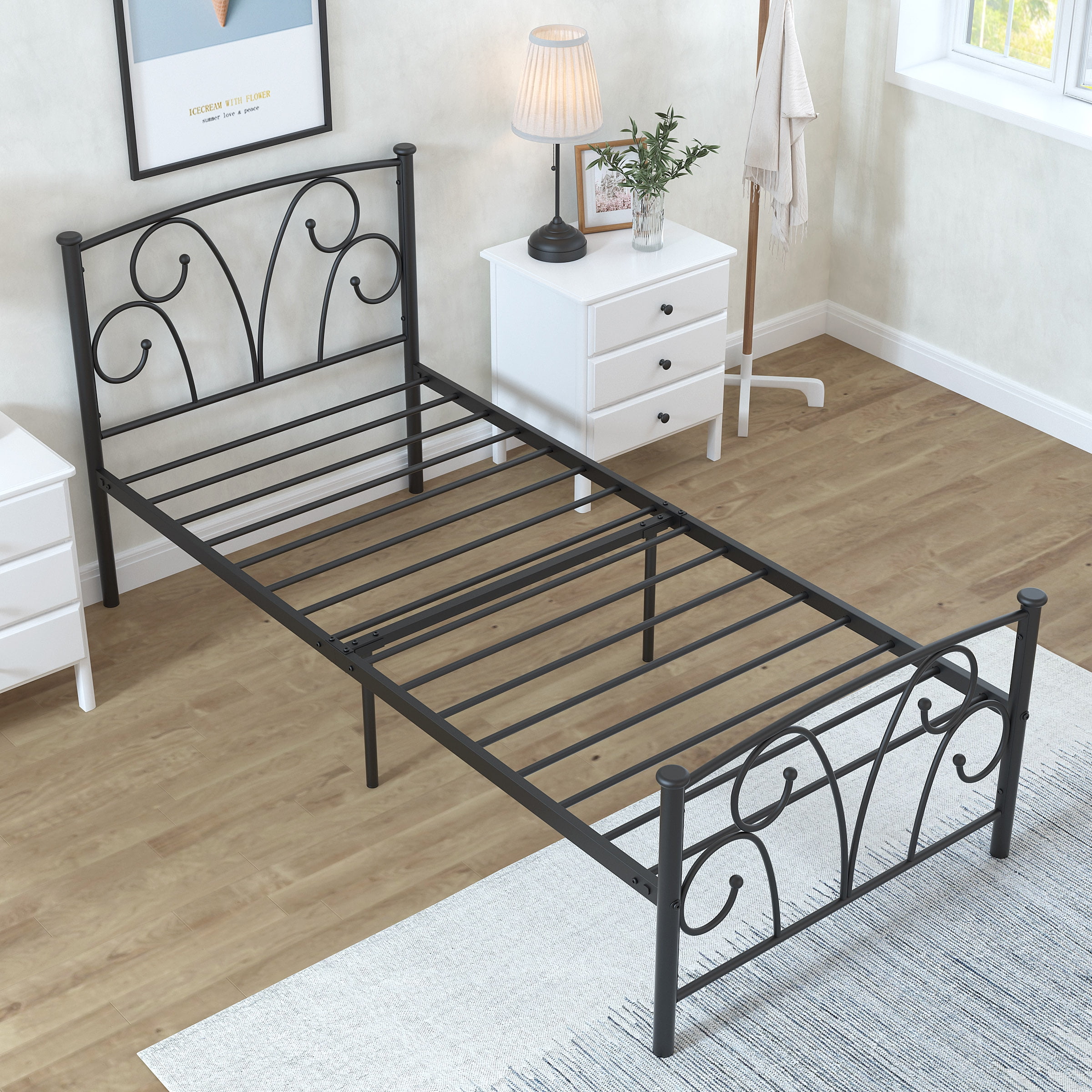 Features: 【GORGEOUS GOOD-LOOKING BED FRAME】 – Our metal bed frame with the unique creative designed headboard. It gives a kind of elegance yet cute, can match any style bedroom. It like the flowers or butterfly by your imagined, give you the good mood every day. 【HEAVY DUTY SUPPORT】 – There are 6 strong metal bed legs and include silent cushioning gaskets in the bed leg, which will provide max support of around 350lbs and also keep your floor from damage and scratch. No box bring needed and non-slip. 【STURDY BED FRAME】 – The kids bed frame made of study metal tube. With 16 reinforced slats strong construction provides the safety and comfortable sleep environment. 【EASY TO ASSEMBLE】 – It is easy for you to install the twin platform metal bed frame in short time with all the accessories and instructions are packaged well in the product parcel. 【AMPLE UNDER BED STORAGE】 – 14-inch ample under bed storage space which can convenient to storage sundries, boxes, toys, books, quilts and shoes ect. It’s save your space and makes your bedroom clean and tidy. 【NO BOX SPRING REQUIRED】 – The mattress can be put on the slates directly, ideal for sleepers looking to break away from a bulky box spring. 【BEST BEDROOM GIFT】 – Best Gift for Birthday, New House Gift. Perfect for Home, Bedroom, Apartment, School Dormitory, Hotel. Specifications: Material: Sturdy Steel Bed Dimension: 77.9 x 37 x 36inches Headboard Height: 36inches; Footboard Height: 23.8inches Capacity: 300-350lbs Package Size: 40.94×20.86×4.33inch Package Weight: 38.58lbs No box spring needed High headboard designed for comfortable rely on Package Included: 1 x Twin Bed Frame with Headboard 1 x Instruction 1 x Screw Set 1 x Components