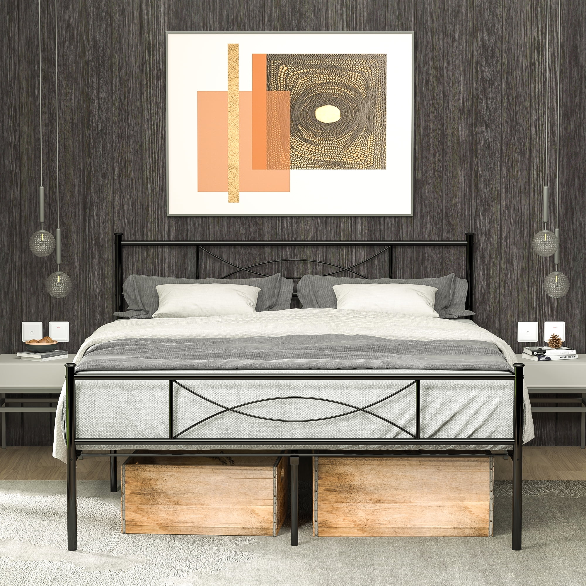 Yoneston Easy Set-up Premium Metal Bed Frame Platform Mattress Foundation with Headboard, Under-bed Storage, Multiple Size. This metal Adult bed frame foundation is made from durable, premium quality steel to provide sturdy support for your mattress. It is a unique, easy-to-assemble sturdily construction system that will provide you with reliable and convenient bedding support. The 12.5″ height allows the mattress to breathe, as well as save space by storing underneath.