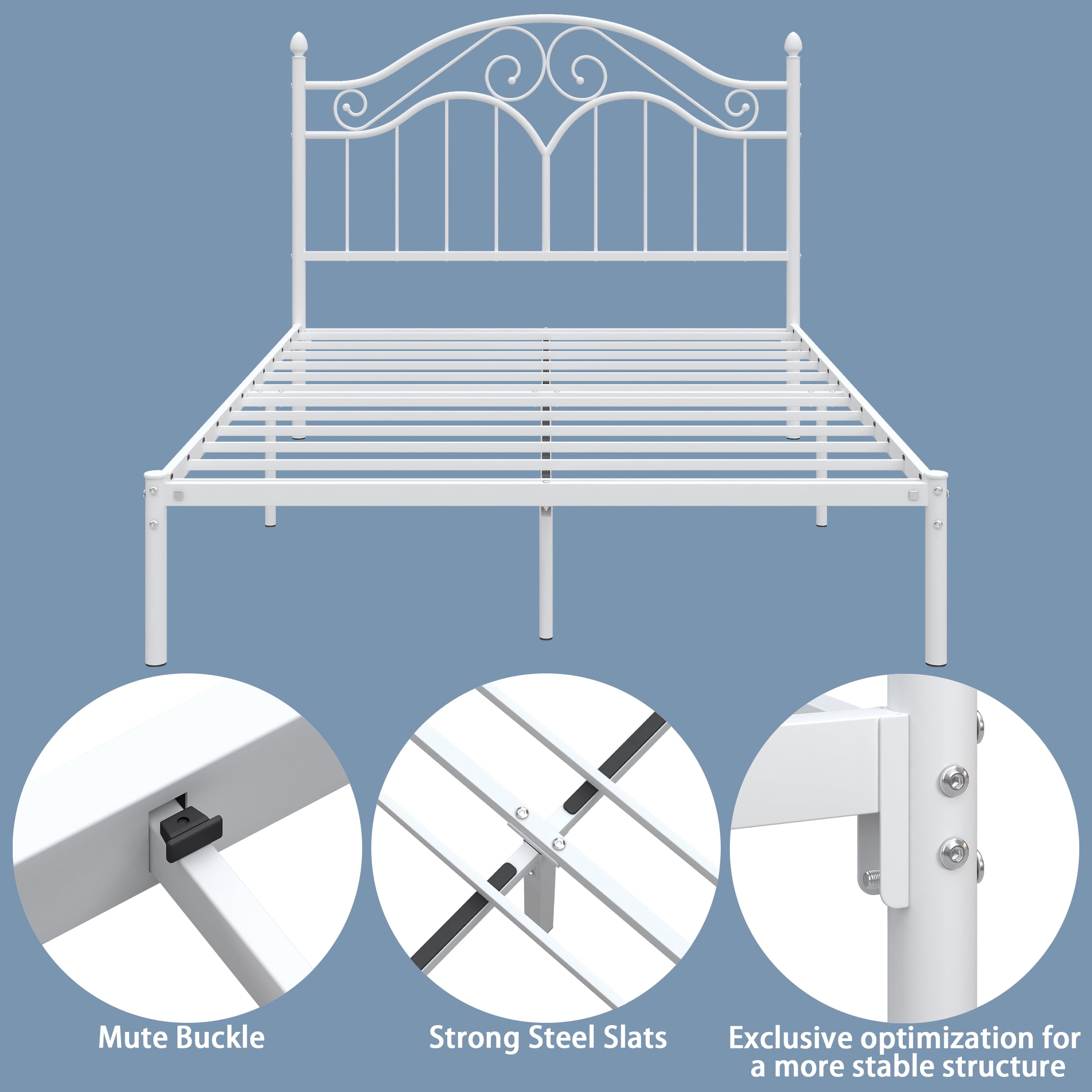 Yoneston Full Size Metal Platform Bed Frame with Vintage Headboard, Sturdy Steel Slat Mattress Foundation with 11″ Under-Bed Storage, White