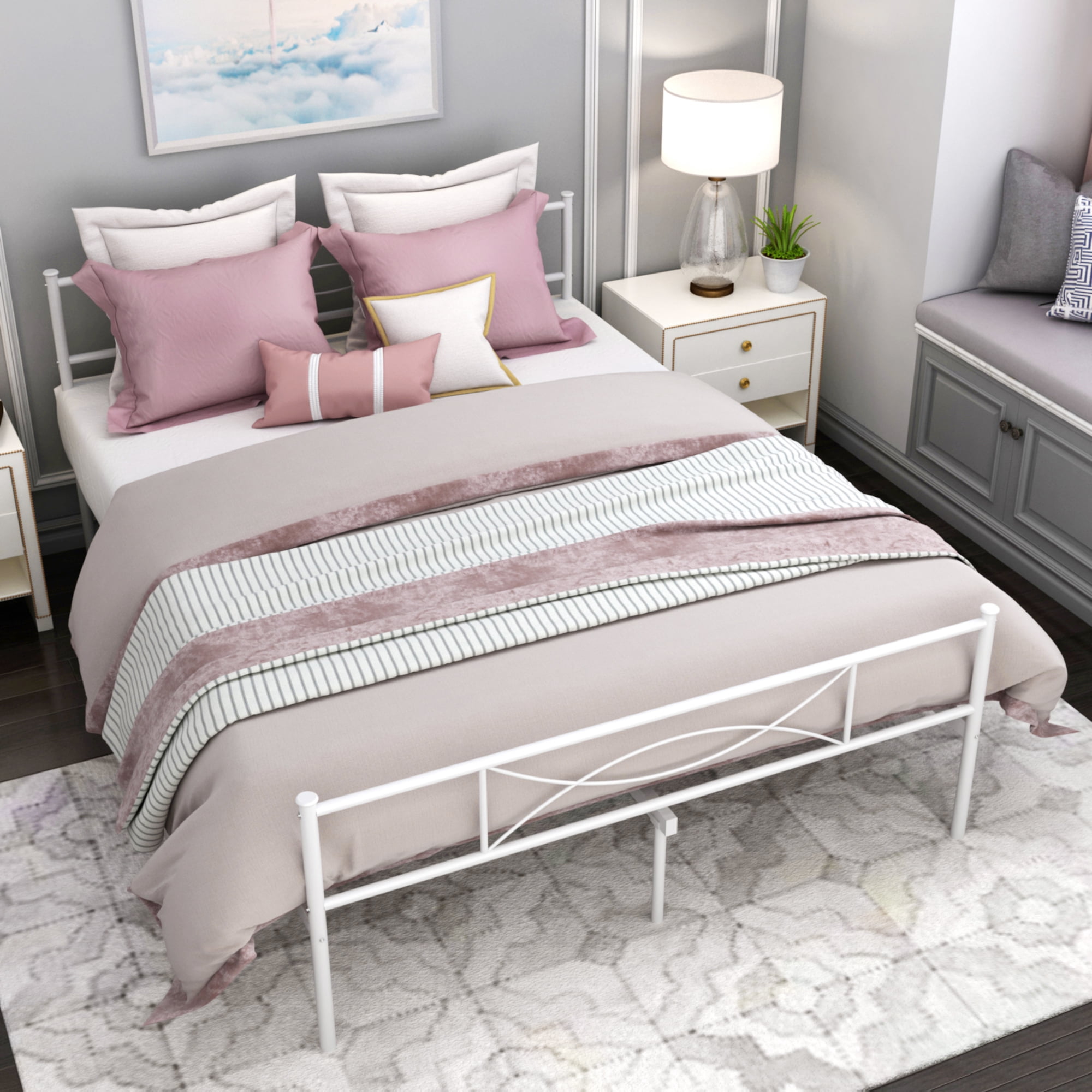 Yoneston Queen Size Metal Bed Frame Bedroom Platform Bed Frame with Headboard, White