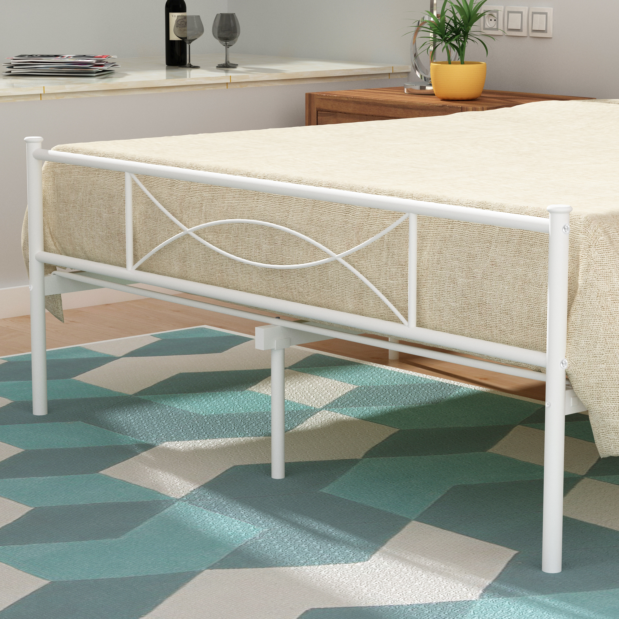 Features: Added Style: Combining clean lines, a matte white metal frame, and modern-style patterns result in a platform bed with a headboard and footboard that exudes the classy character and touch of vintage style your bedroom is yearning for. Sturdy and Stable: This bed frame built with 10 legs and heavy-duty steel slats, adds better supports to your mattress. Max weight capacity up to 600 lbs. The sturdy construction also makes falling asleep more comfortable at night and turning over without any noise. Ample Storage Space: There are 12.5 inches of storage space for metal platform metal bed frame. It will provide enough storage space for you to tidy your sundries, toys, or something else and keep your bedroom look more neat and clean. No Box Spring Needed: This sturdy bed frame is the perfect platform to hold your standard queen size mattress and eliminates the need for a box spring. Easy to Assemble: The bed frame comes flat-packed in one box for easy home assembly. All parts with clearly label, easy to assemble with very clear instructions for installation. A Perfect Gift: The perfect gift for those who need a beautiful bed frame or want to upgrade the current bed frame. Exquisite wedding gifts can be used for birthdays, wedding beds, holidays or special anniversary gifts. Specifications: Material: Metal Size: Queen Color: White Product Size: 211*155*90 CM / Approx. 83″ x 61″ x 35.4″ Product Weight: NW:19.00 KG GW:20.00 KG. Package Size: 62″ x 10″ x 5″ Package Weight: 50lbs Notice: Some parts of the bed frame can not be disassembled after assembled,so please read the instructions very carefully before installation. Package Inlcudes: 1 x Metal Bed frame 1 x Instruction For Installation 1 x Poly Bag 1 x Screw Set 1 x Components