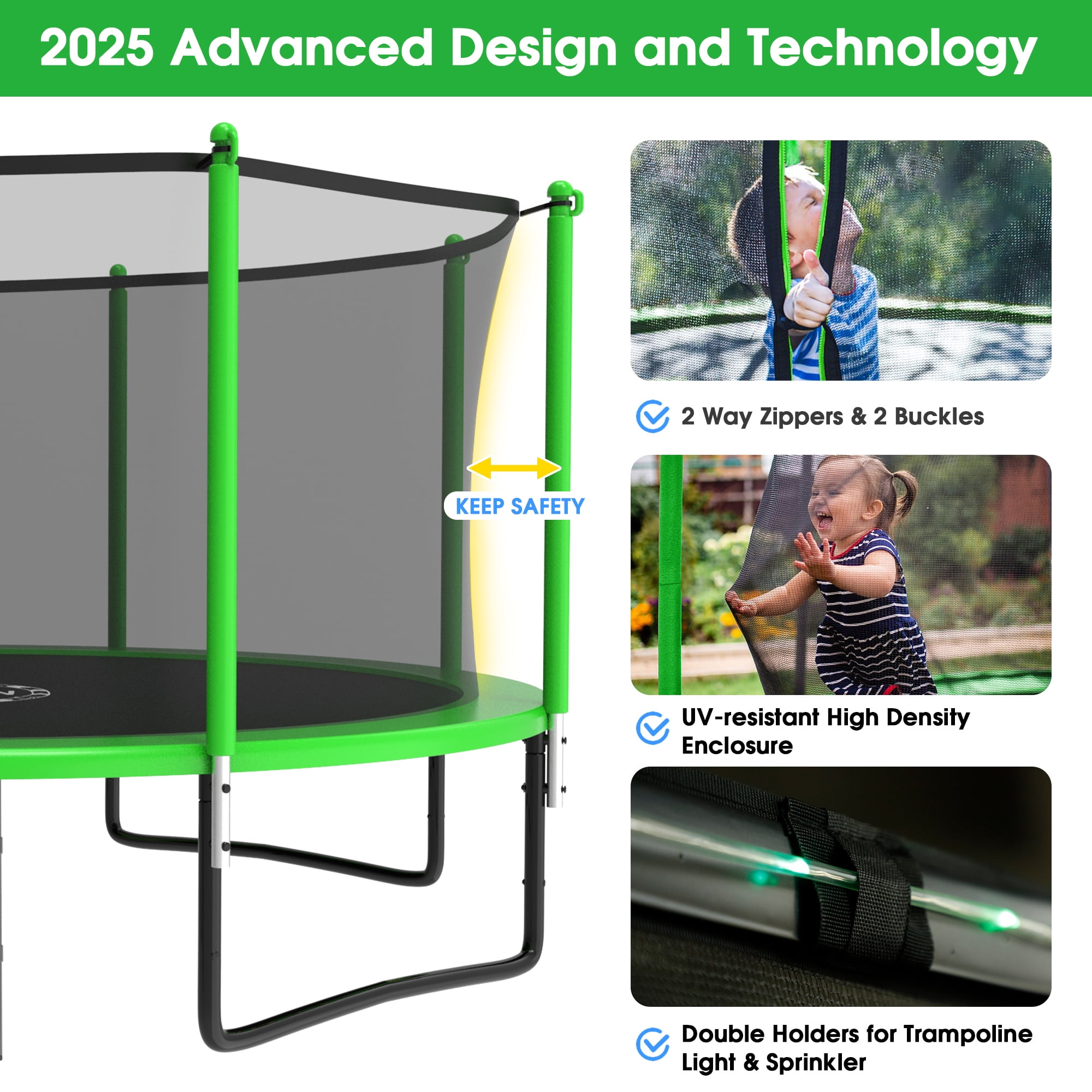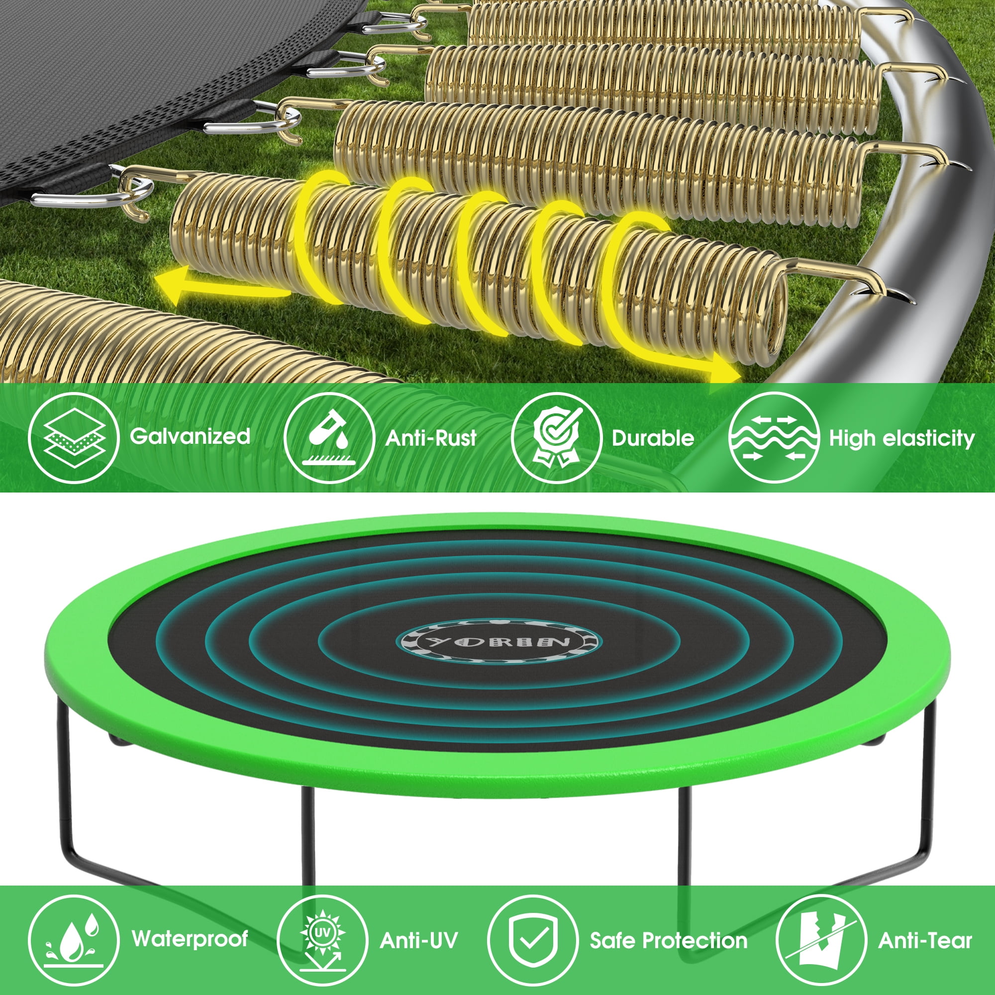 The trampoline is a very interesting memory of childhood. The YORIN 12ft trampoline uses high-quality materials. It is designed to bring fun to children while protecting them during jumping. You can ensure that our trampoline is safe for your family. Let you and your kids have a blast on the trampoline. Specifications: Diameter: 12FT / 14FT / 15FT Max Load Weight: 1200 lbs/1400 lbs/1500 lbs Material: Galvanized pipe, PP mat, PVC+PE+EPE foam Features: 1. Reinforced welded T-sockets secure the enclosure frame to the trampoline frame eliminating structural twisting. U-shaped base legs added more bouncing stability to the trampoline. 2. The foam-padded frame poles offer more additional protection to avoid being injured. 3. Equipped with durable zipper and black buckle, and super dense mesh for the enclosure net, creating a safe space for the jumper to reduce the risk of bodily injury during jumping. 4. The enclosure net is set in the tubes and connects the spring cover, which eliminates gaps between the mat and net. 5. Unique double net screen door makes you more convenient to enter the trampoline and gives you more protection when you jump on the trampoline. 6. YORIN 12 Feet trampoline is made of galvanized stainless steel frame, which is weather and rust-resistant, and equipped with a 3-step ladder. 7. Visible sections are finished with a UV-resistant coating to protect your trampoline Trampoline is a very interesting memory in childhood. The YORIN 12ft trampoline uses high-quality materials. It is designed to bring fun to children while protecting them during jumping. Specifications: Diameter: 12FT / 14FT / 15FT Max Load Weight: 1200 lbs/1400 lbs/1500 lbs Material: Galvanized pipe, PP mat, PVC+PE+EPE foam