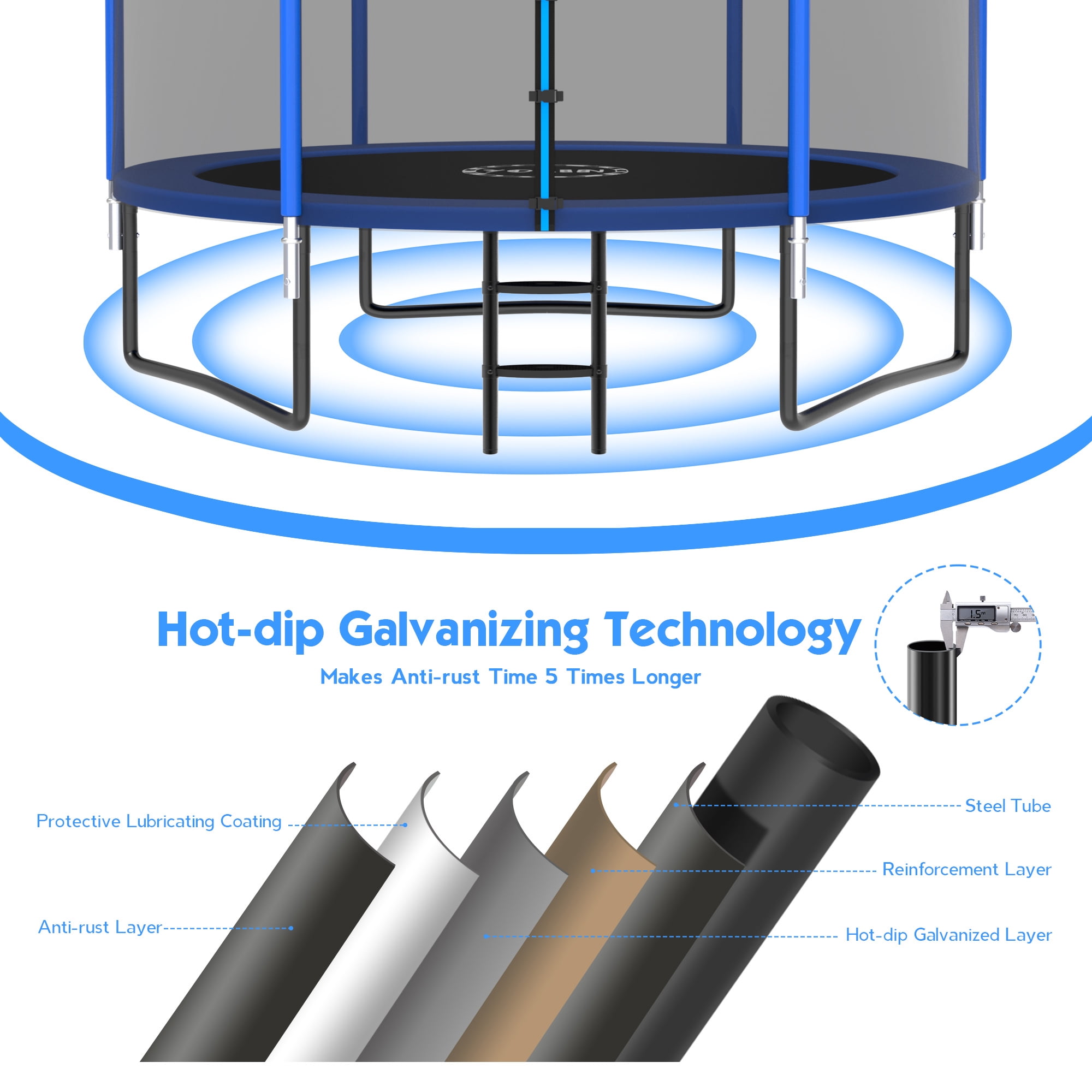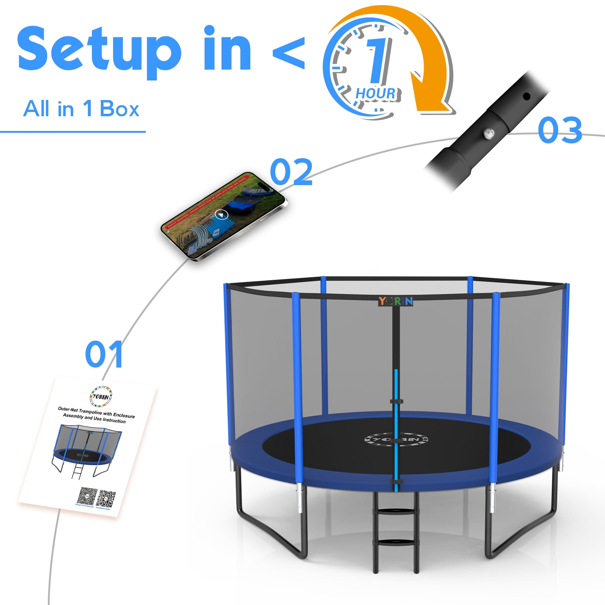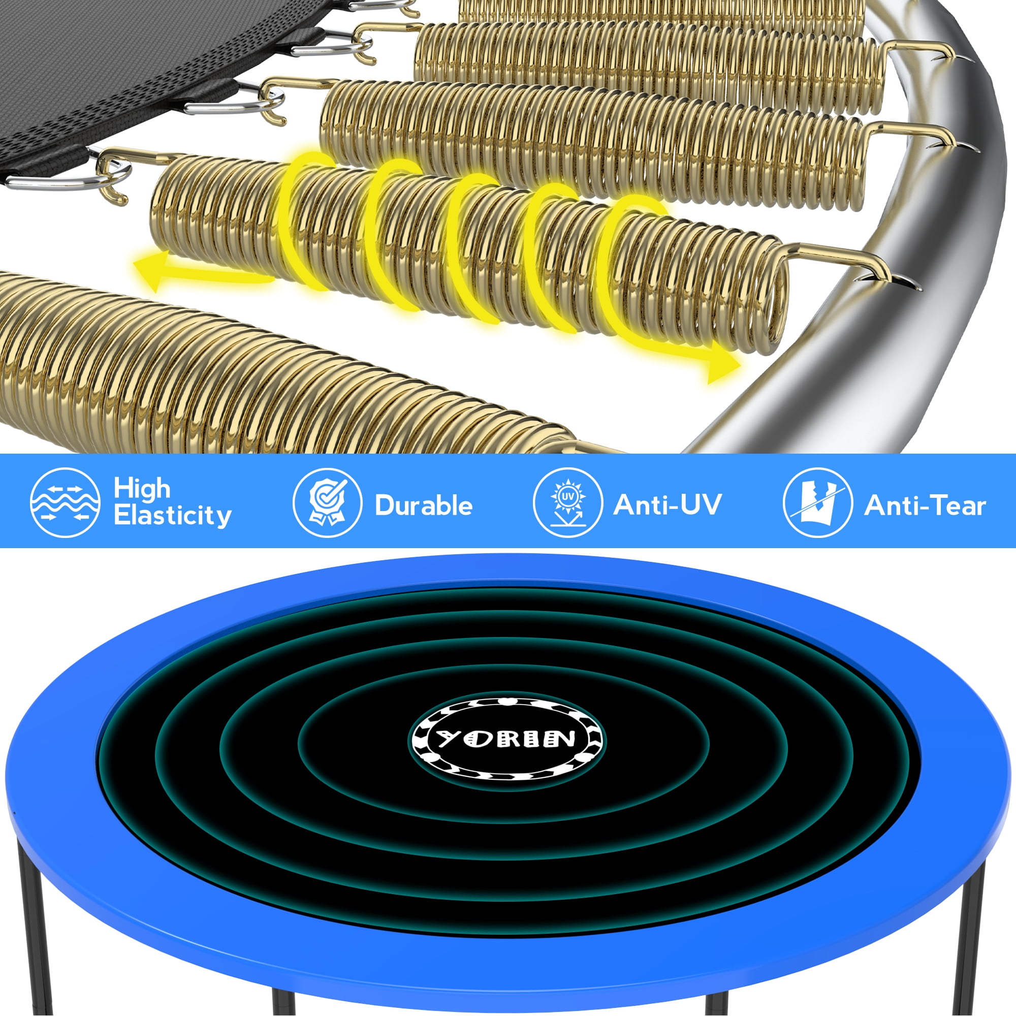 【Top Safety System】Safety always comes top priority. YORIN 8FT trampoline featuring maximum 800LBS load capacity, which can safely hold 2-3 kids. Note: When a person uses the trampoline alone, the recommended maximum weight is 330LBS to avoid injuries caused by a single-point force. 【YORIN Provide Perfect Bouncing Experience】YORIN trampoline manufactured with EU standard Polypropylene bounce surface provides unmatched rebounding force. The trampoline’s high-weight capacity is wrapped with 48 hot-dips galvanized springs, all spring has undergone 20,000 extreme extension experiments without deformation. Those springs connect tightly with the jump pad and frame together to provide a comfortable jumping force and a deep impression of the jump. 【Hot-dip Galvanizing Technology & Heavy-duty Frame】YORIN 2024 newest trampolines use the latest hot-dip galvanizing technology to make the frame anti-rust, more stable and durable. And our unique two-steel joint design along with W-shaped legs provide a solid base for the whole trampoline. All visible parts are finished with a UV-resistant coating to protect the trampoline from the sun and premature material fading for longer life. 【Excellent Structure and Materials】YORIN trampoline for kids is constructed with a 5.2ft-high and 360-degree safety net that is UV, weatherproof and wear-resistant. It is firmly attached to the jumping mat all the way around, getting rid of the risk of getting kids’ hands or feet caught in the gaps. The sturdy two-step ladder provides straight navigation on and off the trampoline. Besides, the springs are covered with a thick and durable pad that expands the jumping area. 【Premium Service & Easy to Install】YORIN trampoline includes the trampoline light, safety enclosure net, spring, spring cover pad, jumping mat, ladder & Spring Tool… YORIN provides 18 months of warranty service for all accessories and free replacement. Everyone knows how difficult instructions can be. We created very easy-to-follow instructions on how to set up your trampoline with net faster. Please feel free to contact us if you have any questions, we provide high-standard 24/7 customer service.