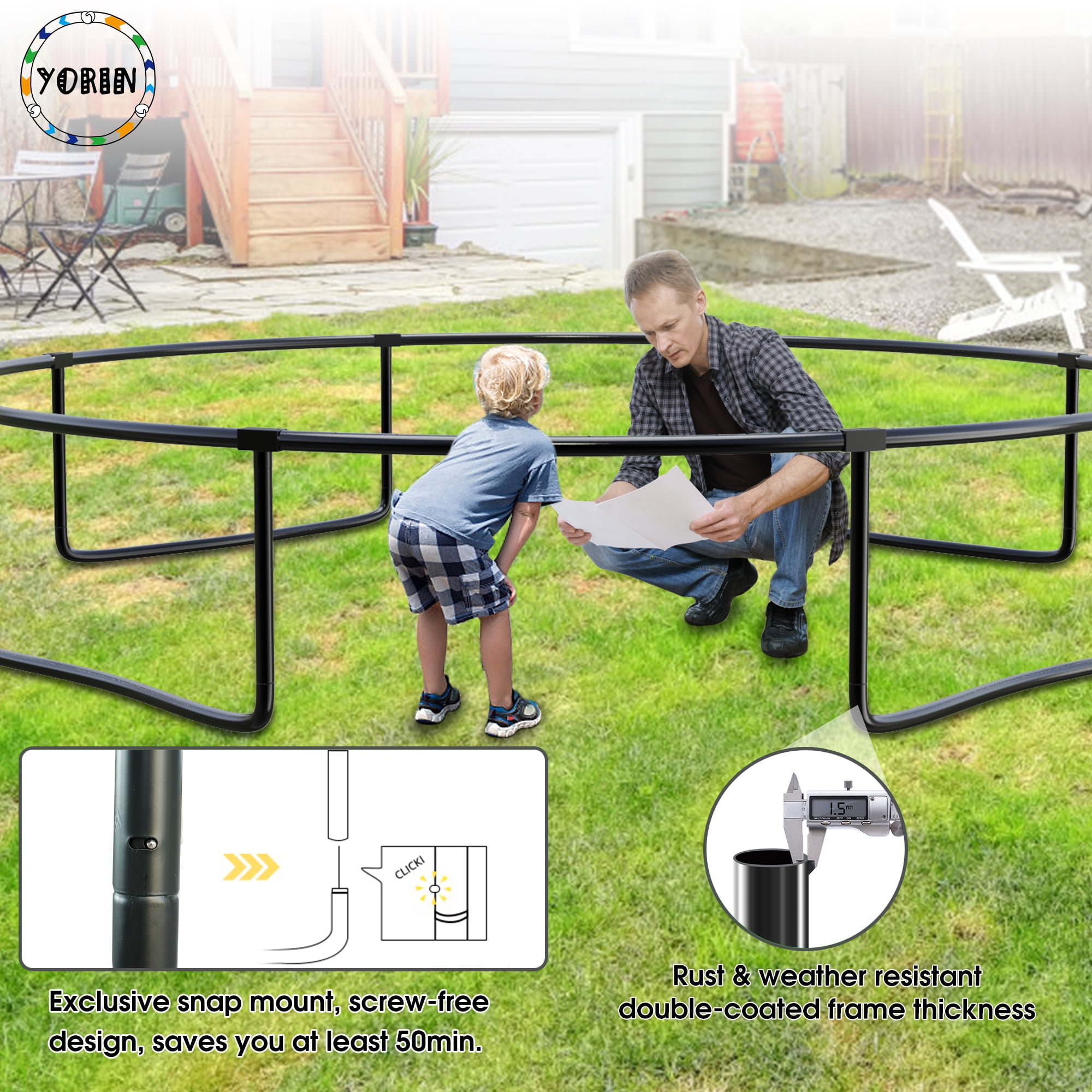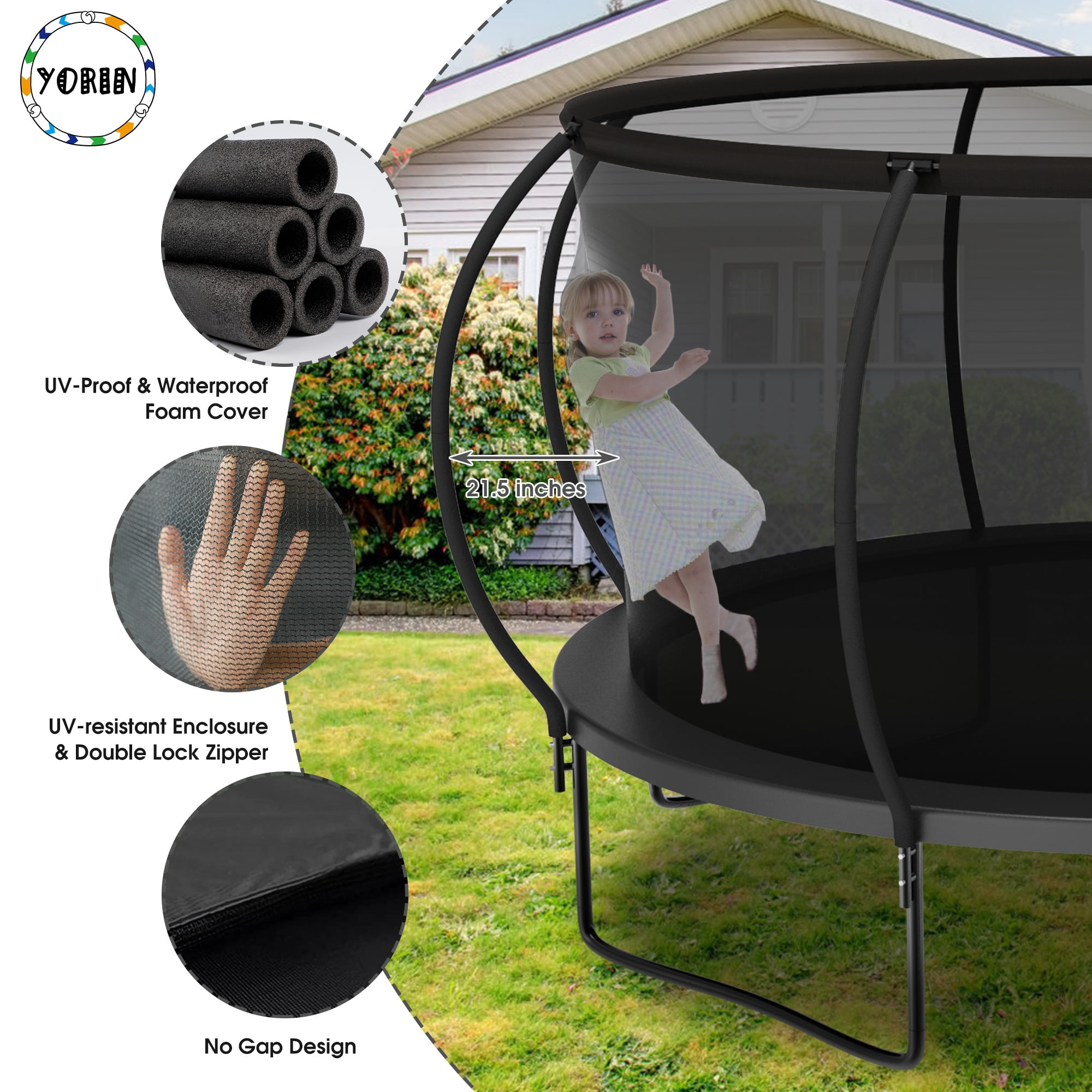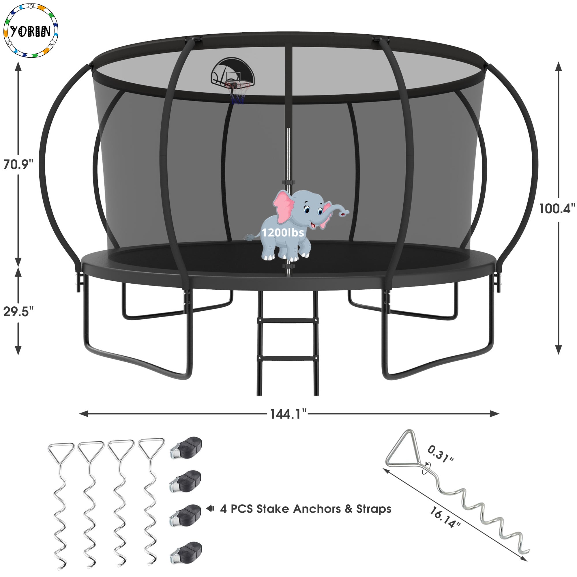 YORIN – Leaders And Innovators In Safe Backyard Play Specifications: – 12 FT/ 14FT/ 15FT/ 16FT – Trampoline with Enclosure Net – 64/ 80/ 96/ 108 PCS Galvanized Springs – 70.9″ High Safety Enclosure – 4/ 6 W-shaped Legs – 8/ 12 PCS Enclosure Net Poles – 1200LBS/ 1400LBS/ 1500LBS Weight Capacity – 3 Colors: Black/Green/Blue – Removable Trampoline Ladder – Premium PP Jumping Mat Material is Strong and Sturdy – Durable Waterproof PE Spring Cover Pad – Fully Spray Galvanized Steel Frame for durability and rust-resistant Feature: – 1.5mm thicken fully galvanized and full spray trampoline frame tubes for 100% anti-rust and anti-corrosion. – 360-degree tear-resistant, pull-resistant, good toughness trampoline safety enclosure net for safe happy play. – Trampoline with basketball hoop and ball for even more fun with jumping and shooting actions. – The removable trampoline ladder makes it convenient for you to get onto. – W-shaped legs and upgraded enclosure net poles enhanced the stability of the heavy-duty trampoline.