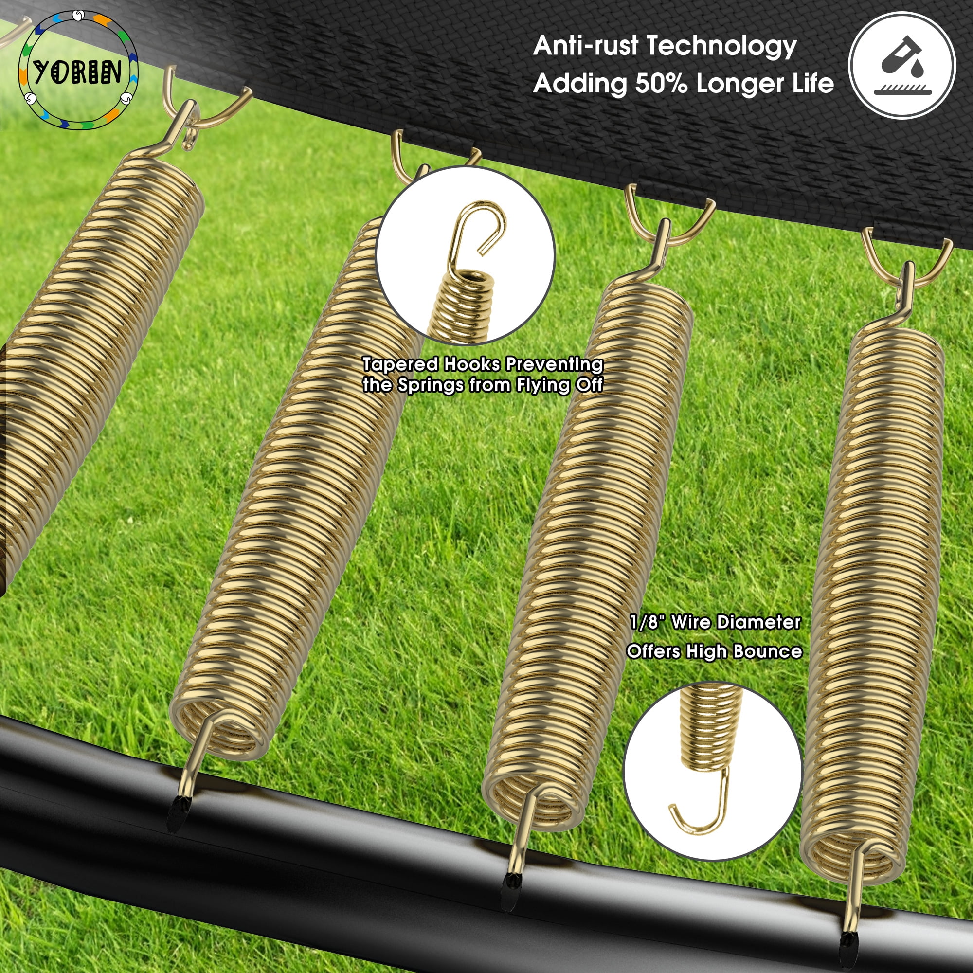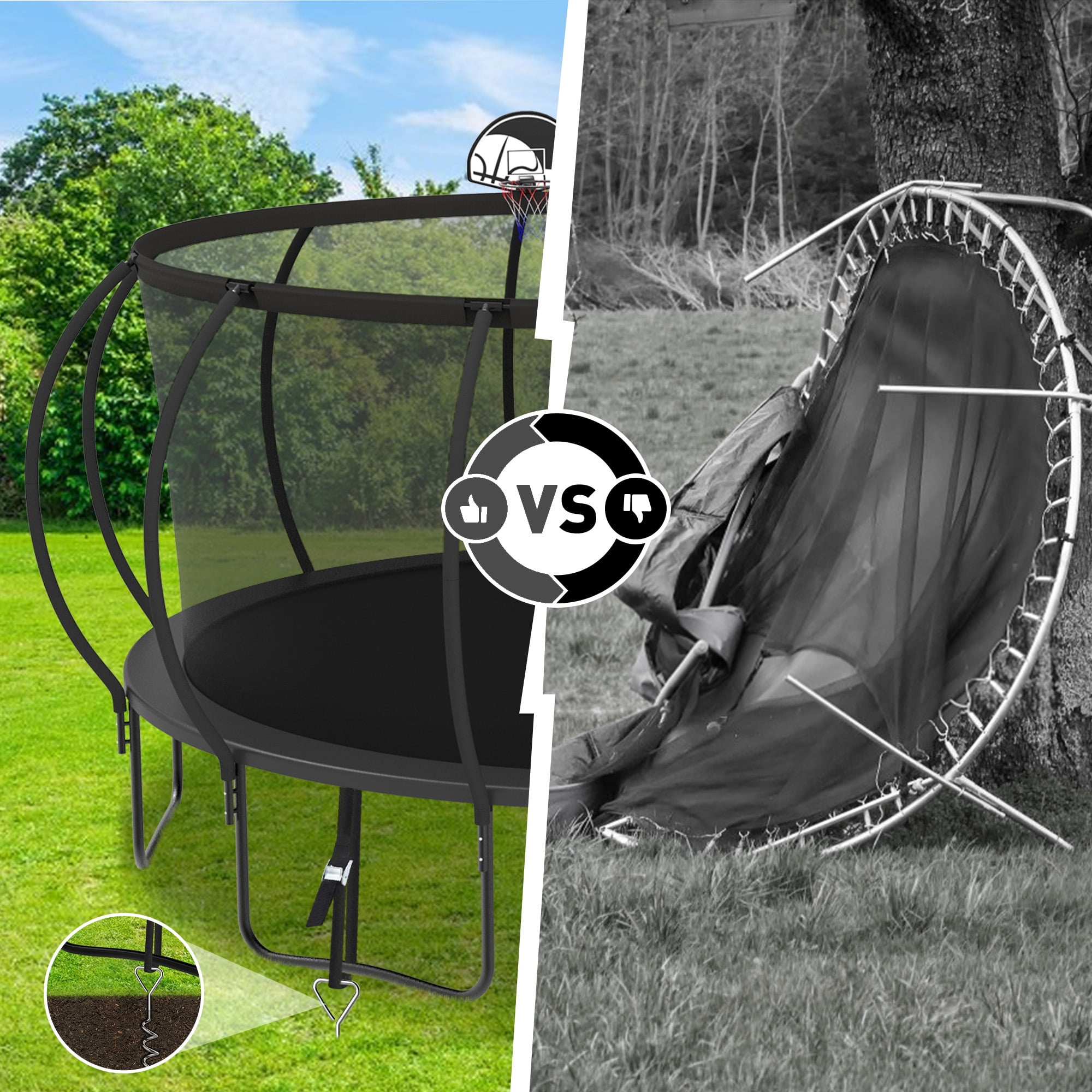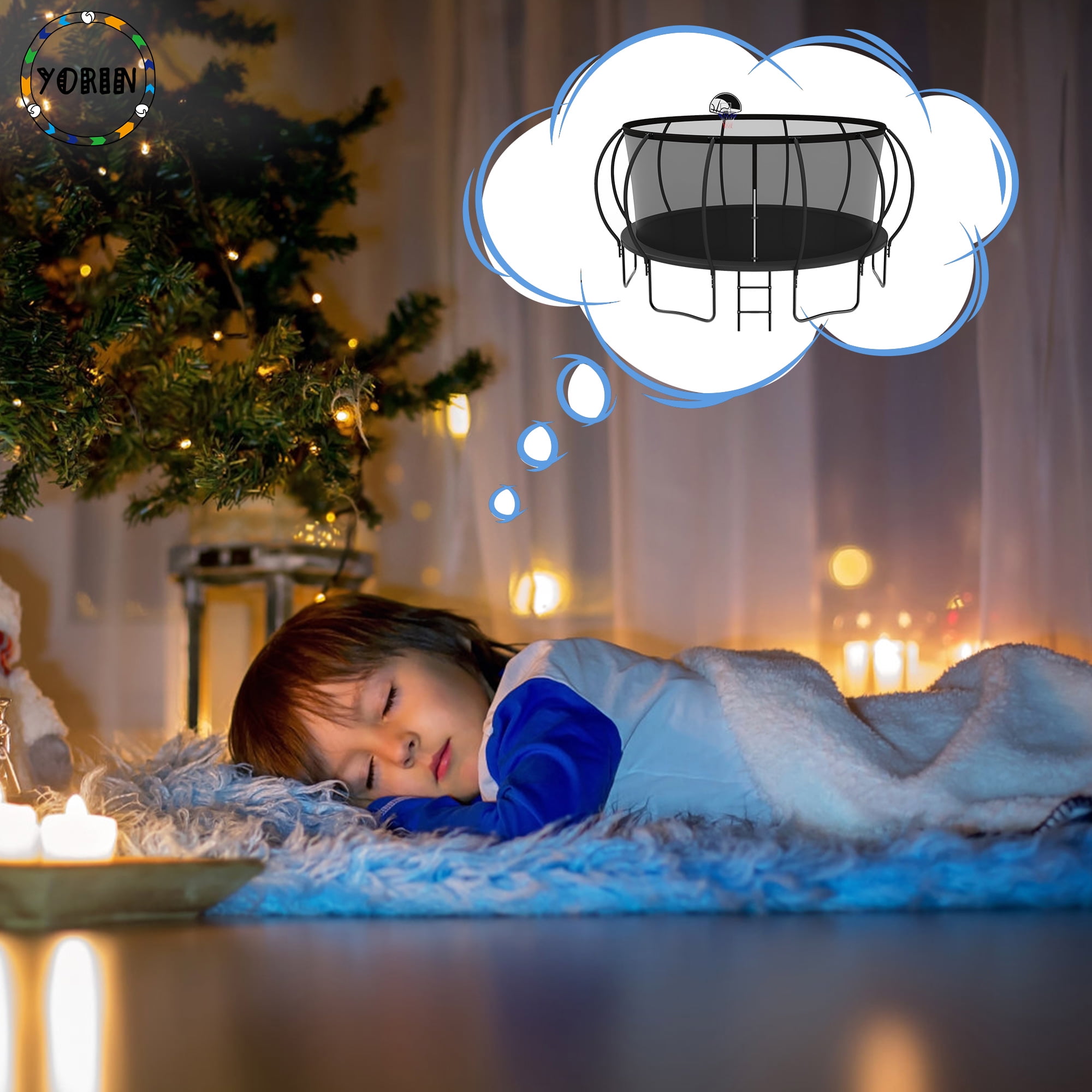 YORIN – Leaders And Innovators In Safe Backyard Play Specifications: – 12 FT/ 14FT/ 15FT/ 16FT – Trampoline with Enclosure Net – 64/ 80/ 96/ 108 PCS Galvanized Springs – 70.9″ High Safety Enclosure – 4/ 6 W-shaped Legs – 8/ 12 PCS Enclosure Net Poles – 1200LBS/ 1400LBS/ 1500LBS Weight Capacity – 3 Colors: Black/Green/Blue – Removable Trampoline Ladder – Premium PP Jumping Mat Material is Strong and Sturdy – Durable Waterproof PE Spring Cover Pad – Fully Spray Galvanized Steel Frame for durability and rust-resistant Feature: – 1.5mm thicken fully galvanized and full spray trampoline frame tubes for 100% anti-rust and anti-corrosion. – 360-degree tear-resistant, pull-resistant, good toughness trampoline safety enclosure net for safe happy play. – Trampoline with basketball hoop and ball for even more fun with jumping and shooting actions. – The removable trampoline ladder makes it convenient for you to get onto. – W-shaped legs and upgraded enclosure net poles enhanced the stability of the heavy-duty trampoline.